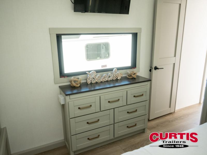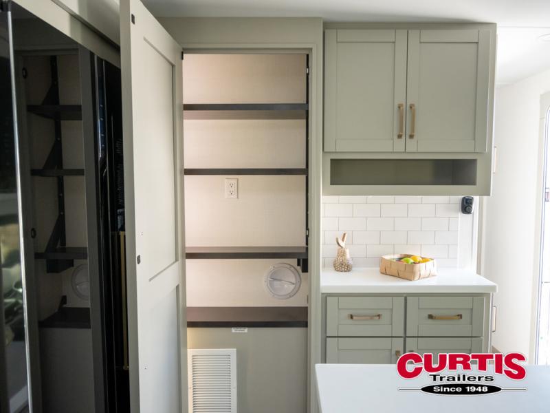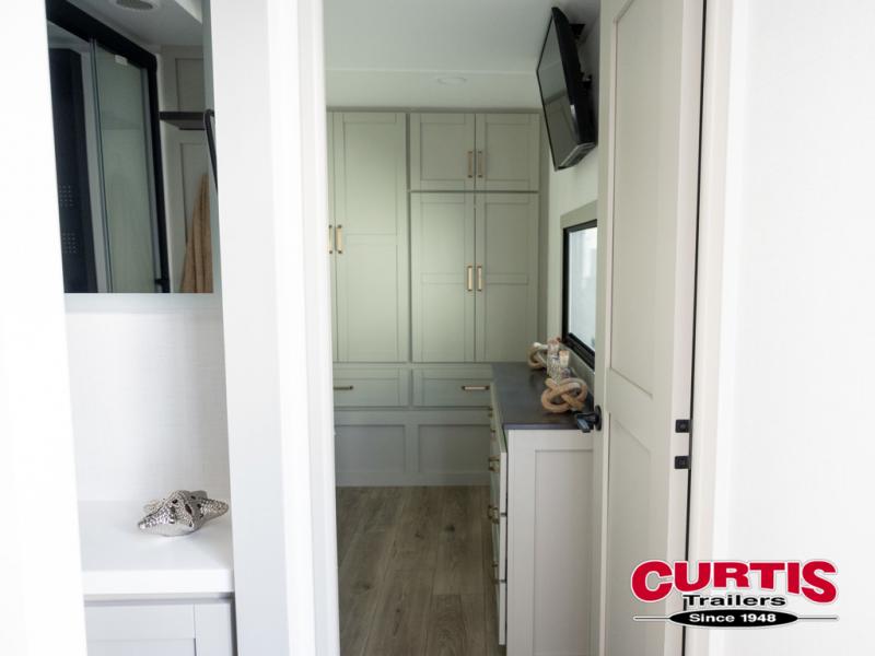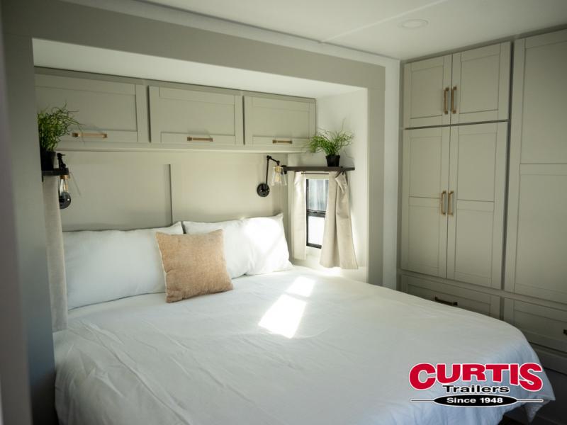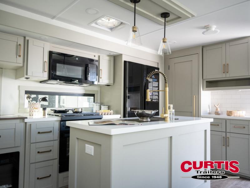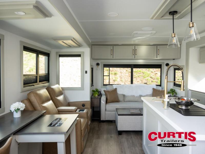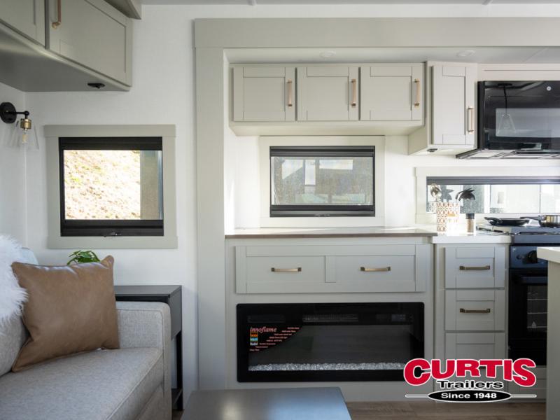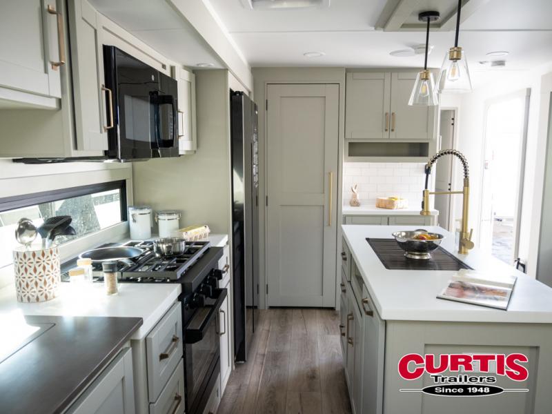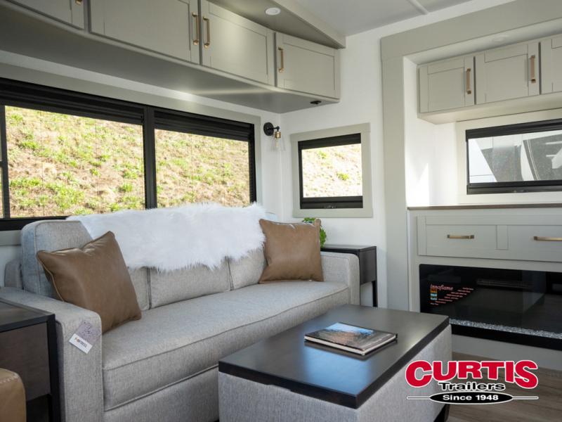 You will love all the space and features in this travel trailer! A luxurious rear living room offers plenty of room to spread out, with a 72" tri-fold sofa plus theater seats, all arranged with a perfect view of the 50" TV over the fireplace. A central kitchen area includes an island with hidden pet bowls. Find even more storage with the hutch plus pantry with adjustable shelves. The front bedroom comes with a queen bed, but if you'd like you can upgrade to a king for even more room. No matter which you choose, you will enjoy watching the 32" bedroom TV. The full-width wardrobe has room for all of your clothes and also includes prep for an optional washer and dryer. And the full bath includes a 30" x 42" one-piece fiberglass shower. Outside you'll enjoy two awnings, pass-through storage, and LED chassis lighting.