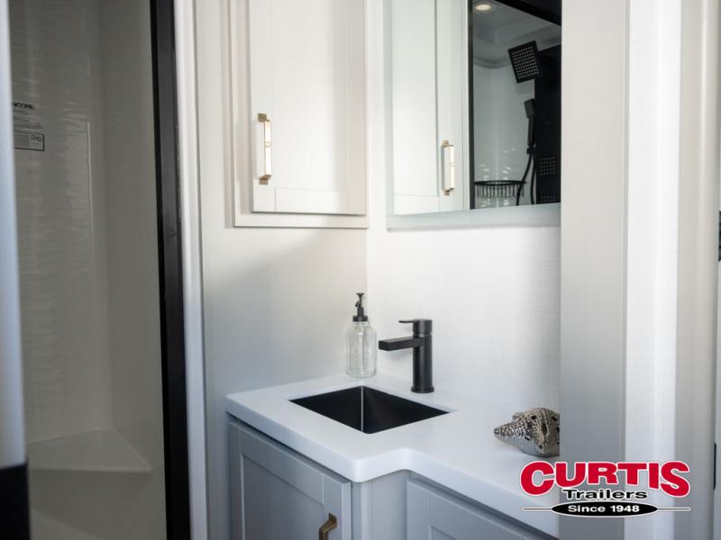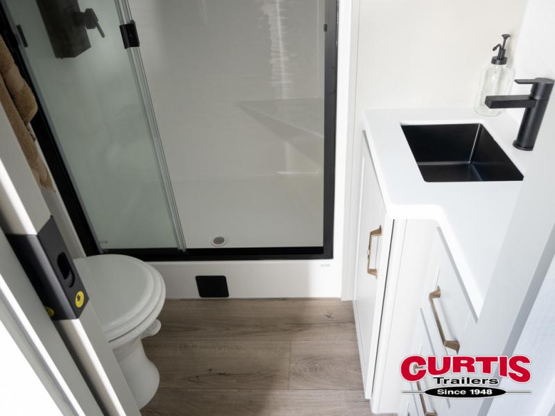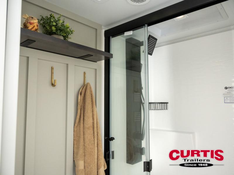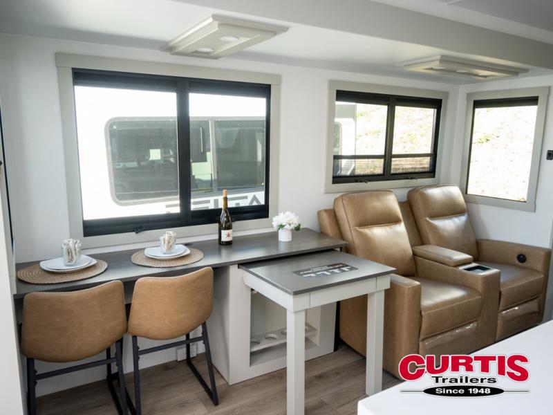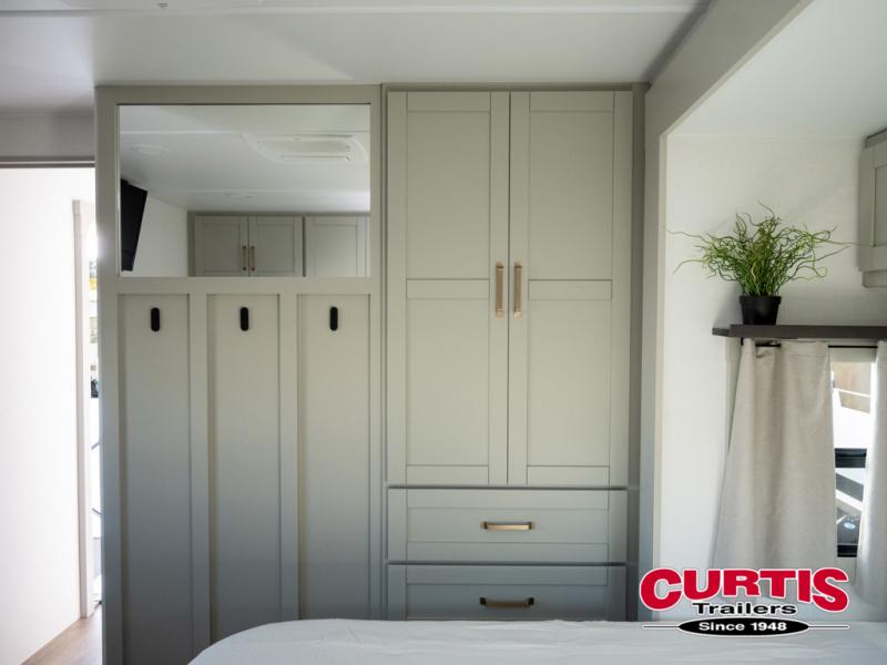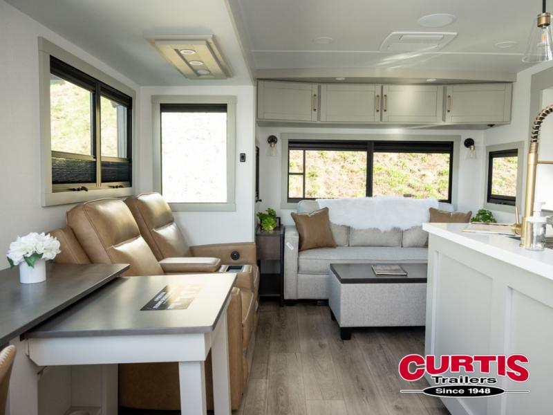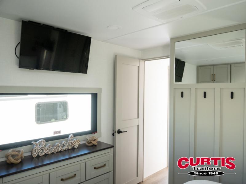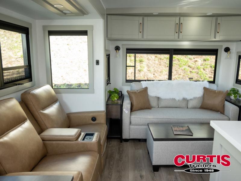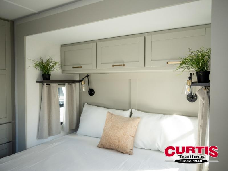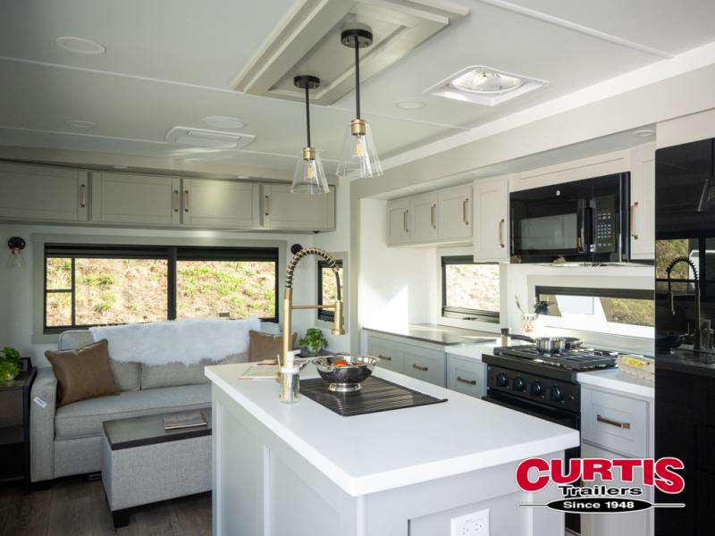 You will love all the space and features in this travel trailer! A luxurious rear living room offers plenty of room to spread out, with a 72" tri-fold sofa plus theater seats, all arranged with a perfect view of the 50" TV over the fireplace. A central kitchen area includes an island with hidden pet bowls. Find even more storage with the hutch plus pantry with adjustable shelves. The front bedroom comes with a queen bed, but if you'd like you can upgrade to a king for even more room. No matter which you choose, you will enjoy watching the 32" bedroom TV. The full-width wardrobe has room for all of your clothes and also includes prep for an optional washer and dryer. And the full bath includes a 30" x 42" one-piece fiberglass shower. Outside you'll enjoy two awnings, pass-through storage, and LED chassis lighting.