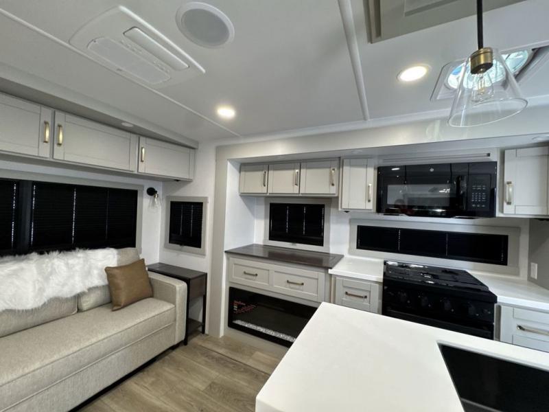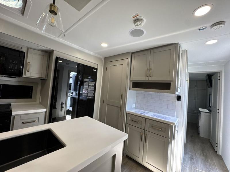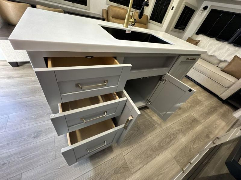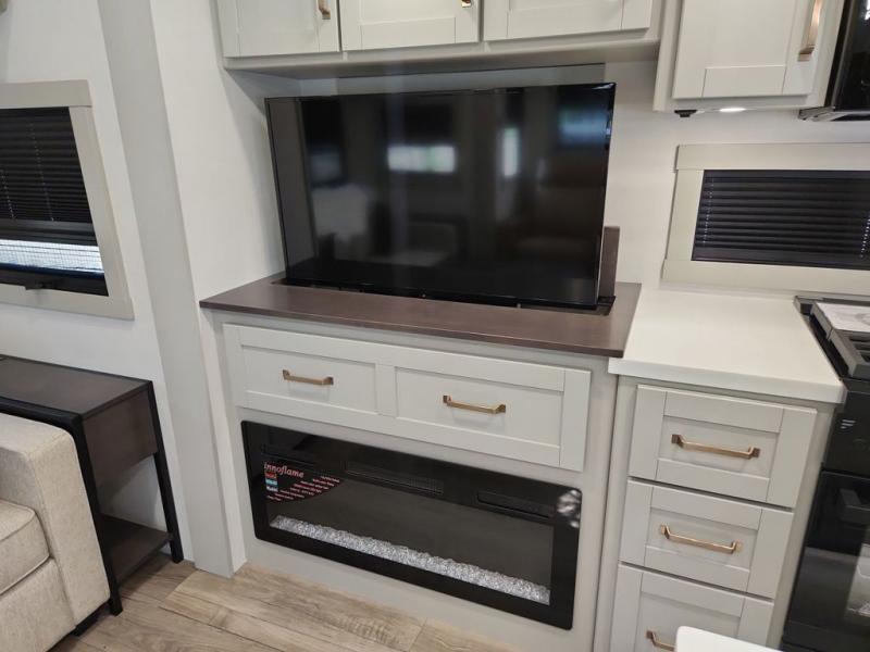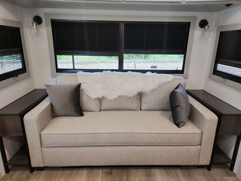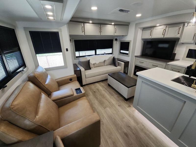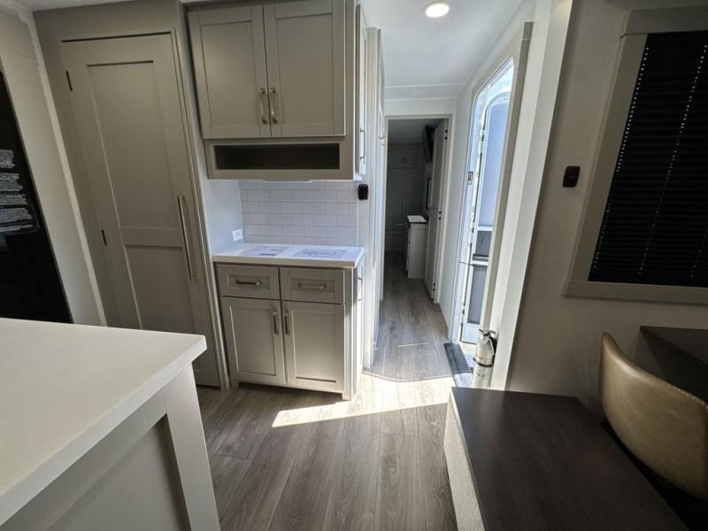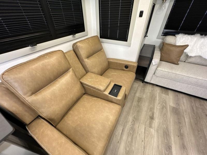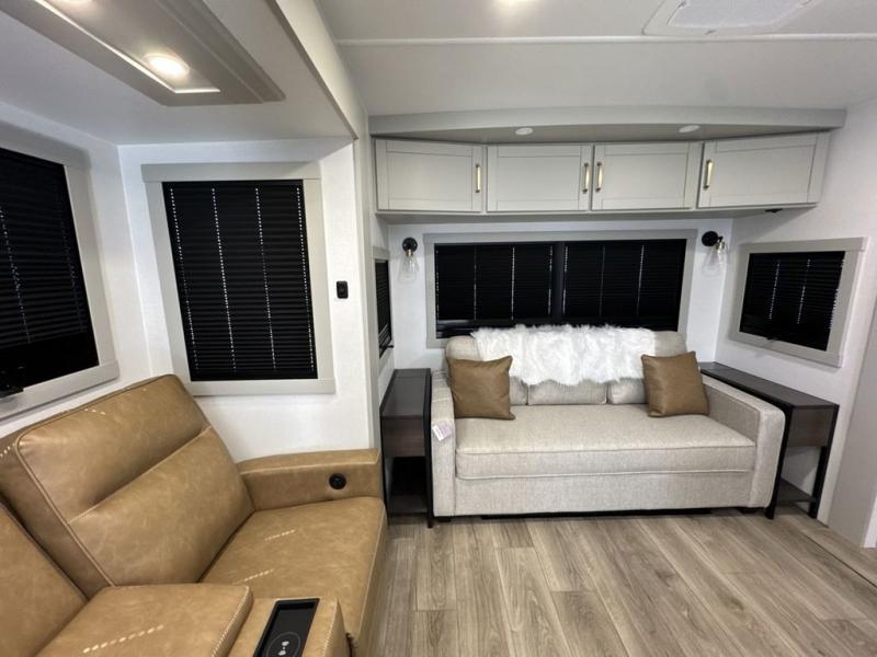 You will love all the space and features in this travel trailer! A luxurious rear living room offers plenty of room to spread out, with a 72" tri-fold sofa plus theater seats, all arranged with a perfect view of the 50" TV over the fireplace. A central kitchen area includes an island with hidden pet bowls. Find even more storage with the hutch plus pantry with adjustable shelves. The front bedroom comes with a queen bed, but if you'd like you can upgrade to a king for even more room. No matter which you choose, you will enjoy watching the 32" bedroom TV. The full-width wardrobe has room for all of your clothes and also includes prep for an optional washer and dryer. And the full bath includes a 30" x 42" one-piece fiberglass shower. Outside you'll enjoy two awnings, pass-through storage, and LED chassis lighting.