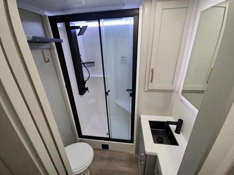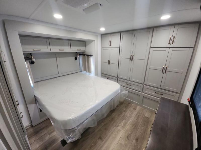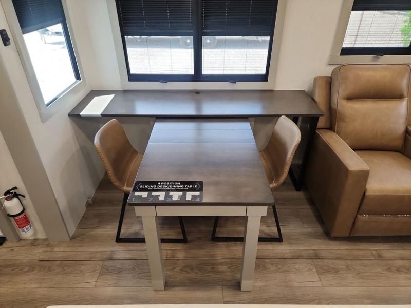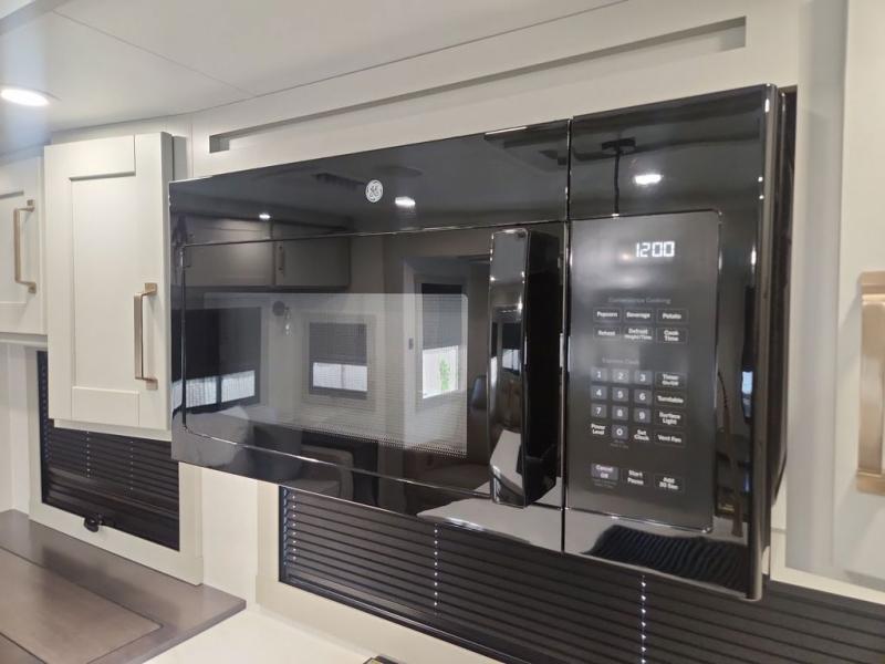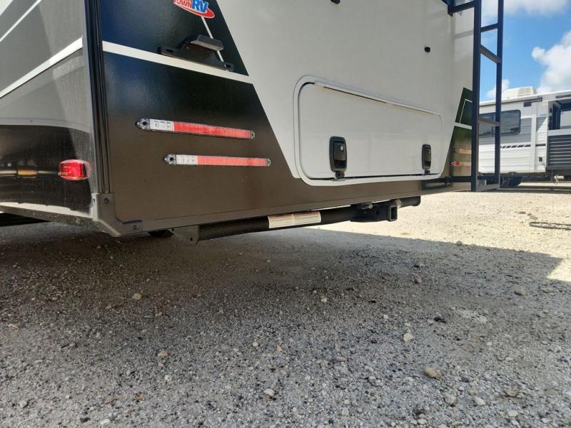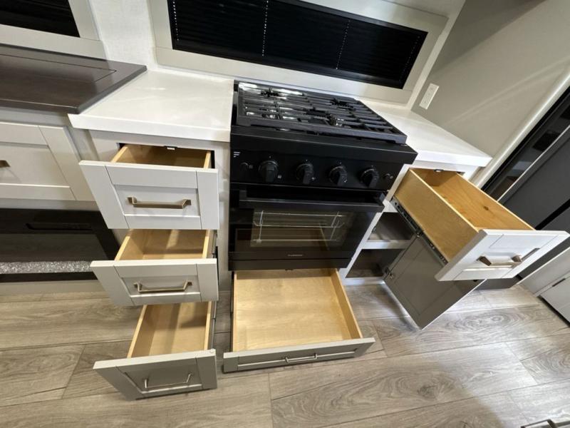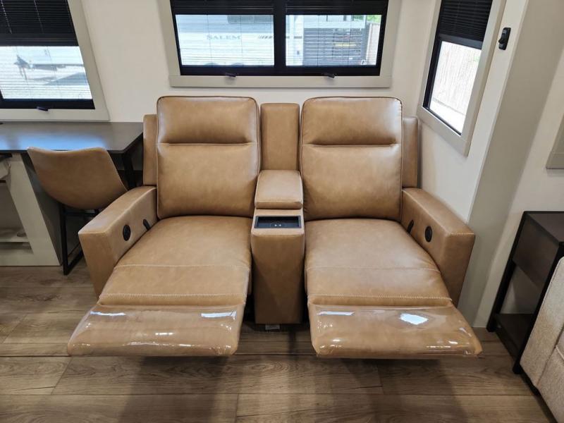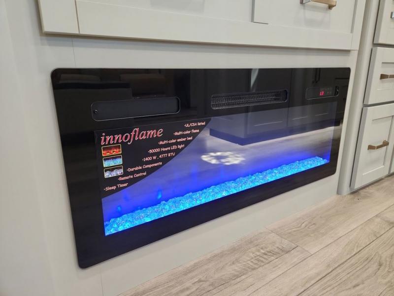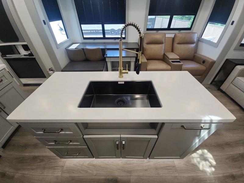 You will love all the space and features in this travel trailer! A luxurious rear living room offers plenty of room to spread out, with a 72" tri-fold sofa plus theater seats, all arranged with a perfect view of the 50" TV over the fireplace. A central kitchen area includes an island with hidden pet bowls. Find even more storage with the hutch plus pantry with adjustable shelves. The front bedroom comes with a queen bed, but if you'd like you can upgrade to a king for even more room. No matter which you choose, you will enjoy watching the 32" bedroom TV. The full-width wardrobe has room for all of your clothes and also includes prep for an optional washer and dryer. And the full bath includes a 30" x 42" one-piece fiberglass shower. Outside you'll enjoy two awnings, pass-through storage, and LED chassis lighting.