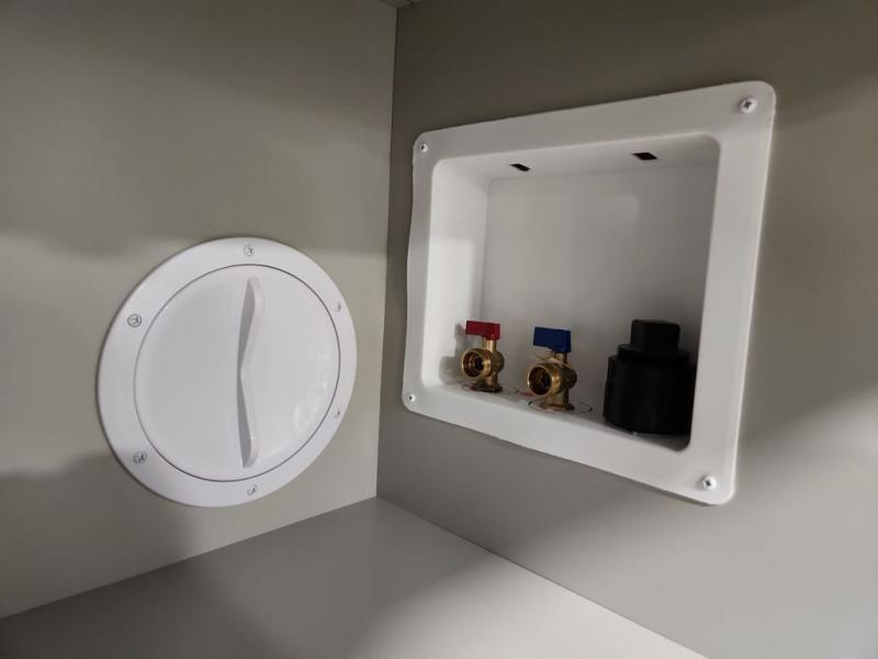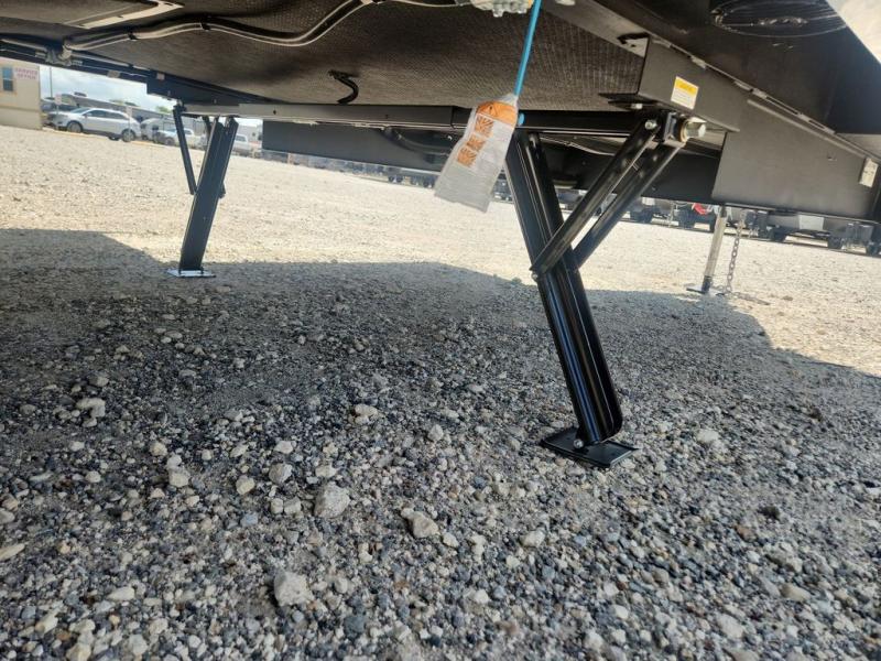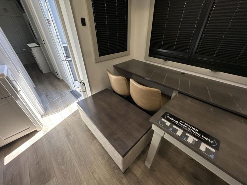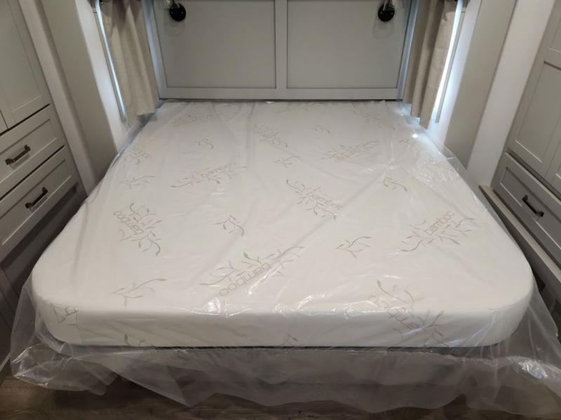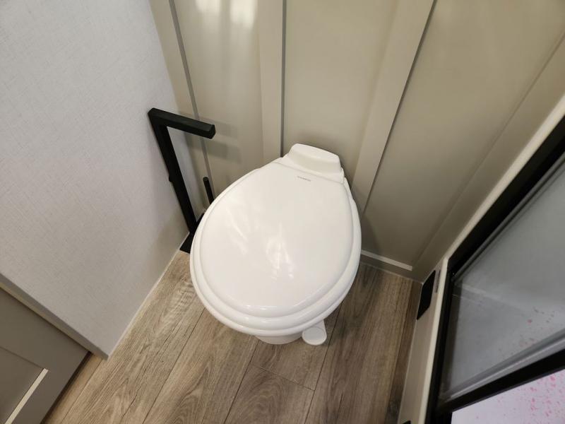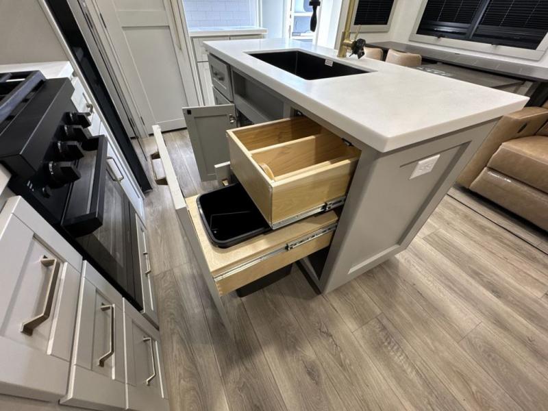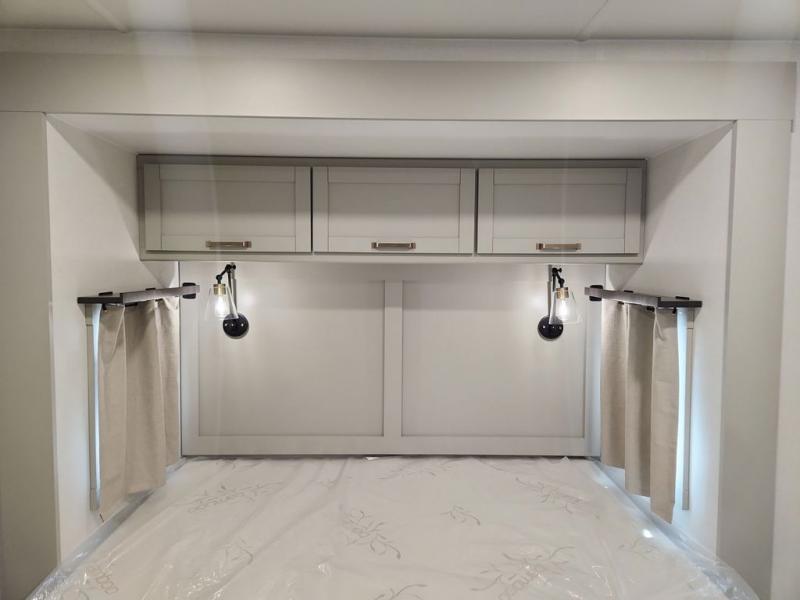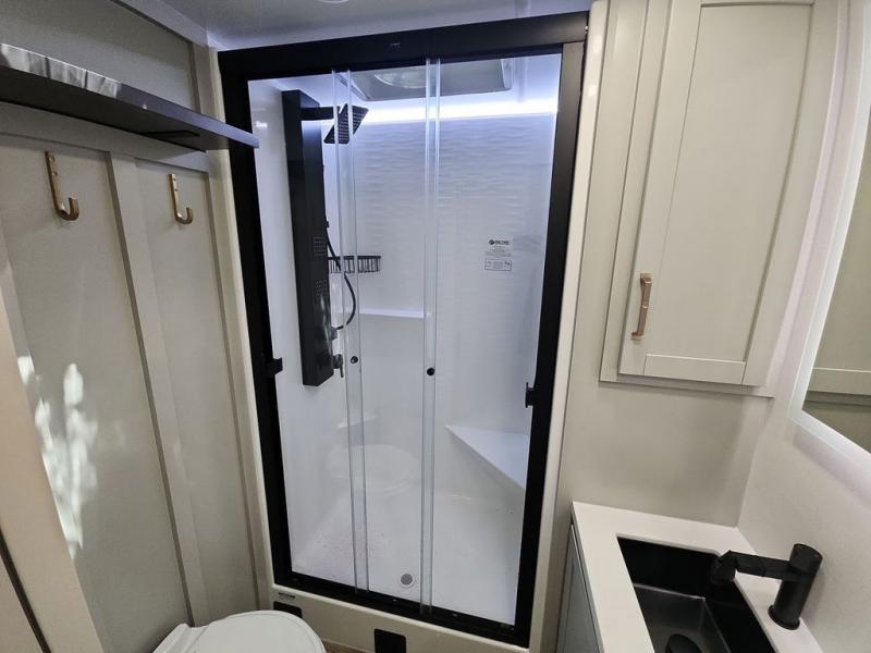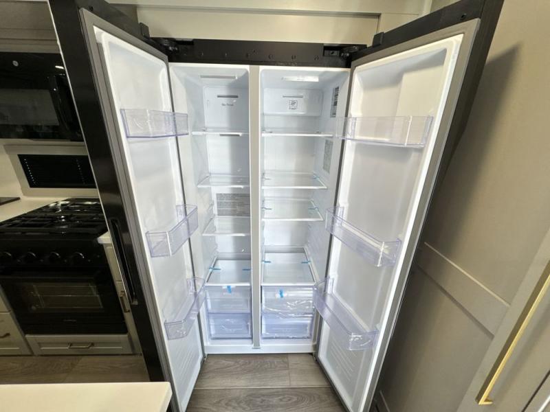 You will love all the space and features in this travel trailer! A luxurious rear living room offers plenty of room to spread out, with a 72" tri-fold sofa plus theater seats, all arranged with a perfect view of the 50" TV over the fireplace. A central kitchen area includes an island with hidden pet bowls. Find even more storage with the hutch plus pantry with adjustable shelves. The front bedroom comes with a queen bed, but if you'd like you can upgrade to a king for even more room. No matter which you choose, you will enjoy watching the 32" bedroom TV. The full-width wardrobe has room for all of your clothes and also includes prep for an optional washer and dryer. And the full bath includes a 30" x 42" one-piece fiberglass shower. Outside you'll enjoy two awnings, pass-through storage, and LED chassis lighting.