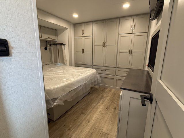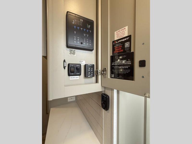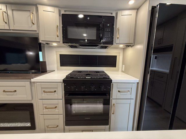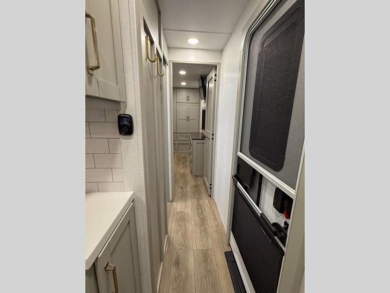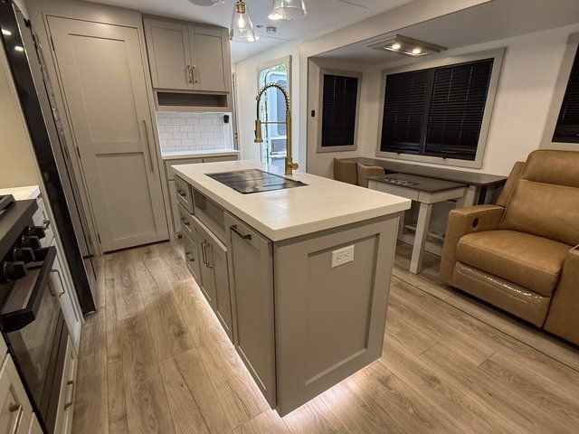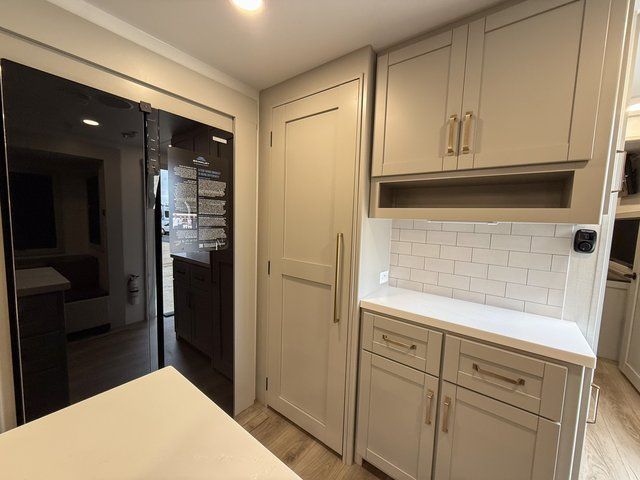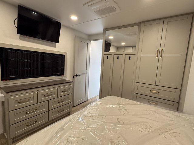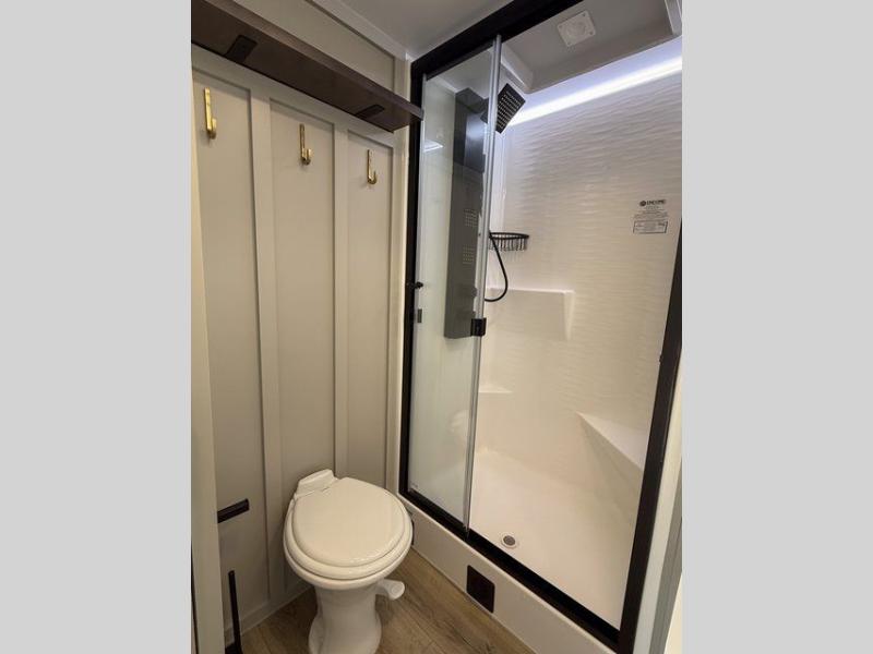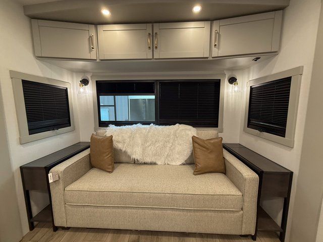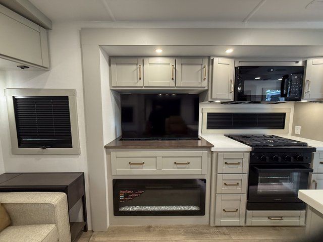 You will love all the space and features in this travel trailer! A luxurious rear living room offers plenty of room to spread out, with a 72" tri-fold sofa plus theater seats, all arranged with a perfect view of the 50" TV over the fireplace. A central kitchen area includes an island with hidden pet bowls. Find even more storage with the hutch plus pantry with adjustable shelves. The front bedroom comes with a queen bed, but if you'd like you can upgrade to a king for even more room. No matter which you choose, you will enjoy watching the 32" bedroom TV. The full-width wardrobe has room for all of your clothes and also includes prep for an optional washer and dryer. And the full bath includes a 30" x 42" one-piece fiberglass shower. Outside you'll enjoy two awnings, pass-through storage, and LED chassis lighting.