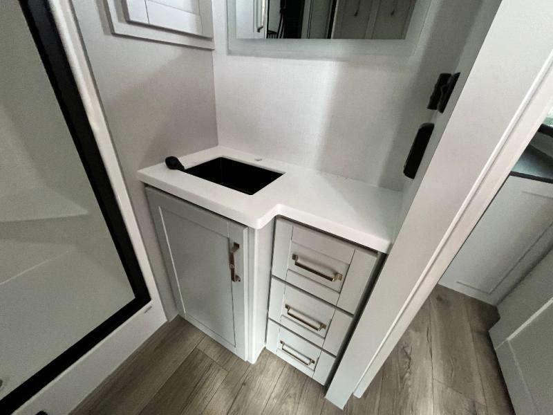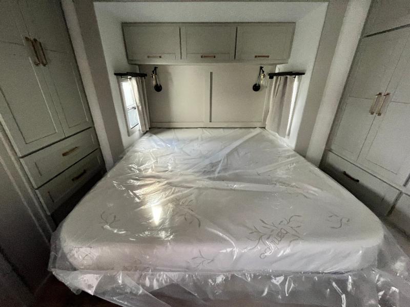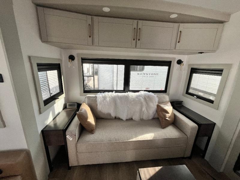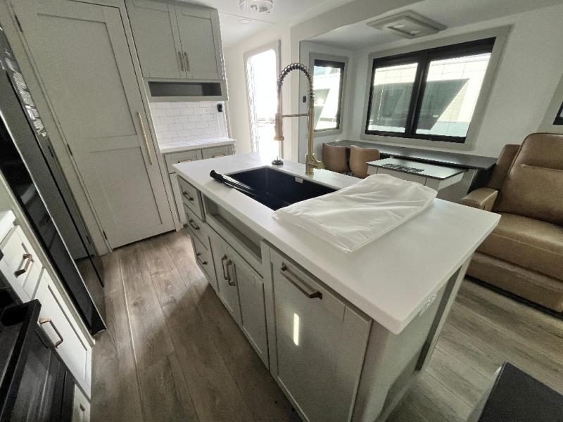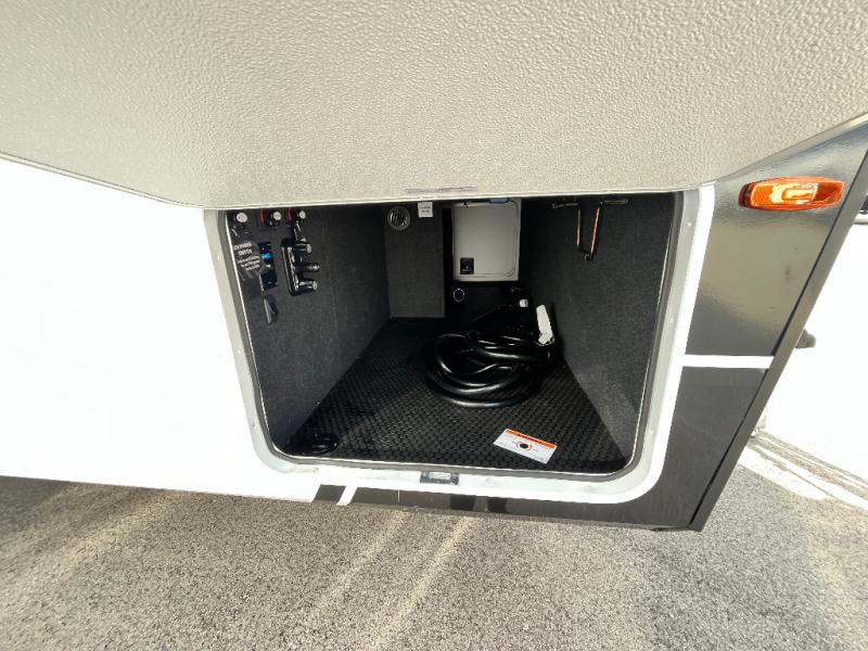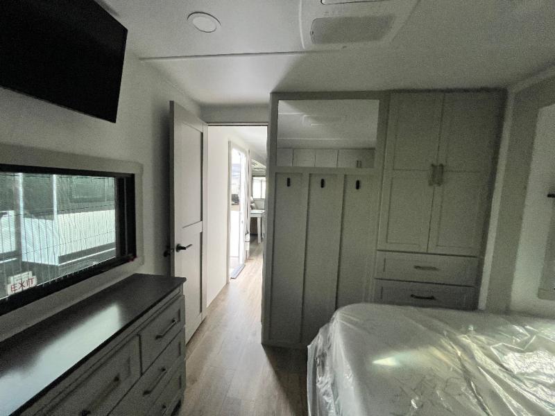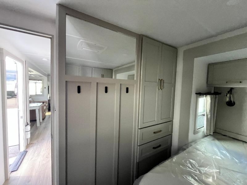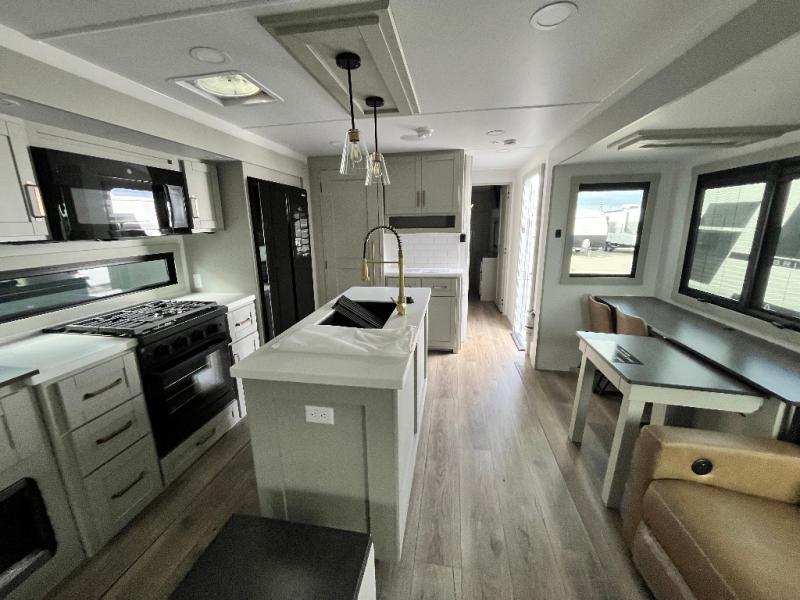 You will love all the space and features in this travel trailer! A luxurious rear living room offers plenty of room to spread out, with a 72" tri-fold sofa plus theater seats, all arranged with a perfect view of the 50" TV over the fireplace. A central kitchen area includes an island with hidden pet bowls. Find even more storage with the hutch plus pantry with adjustable shelves. The front bedroom comes with a queen bed, but if you'd like you can upgrade to a king for even more room. No matter which you choose, you will enjoy watching the 32" bedroom TV. The full-width wardrobe has room for all of your clothes and also includes prep for an optional washer and dryer. And the full bath includes a 30" x 42" one-piece fiberglass shower. Outside you'll enjoy two awnings, pass-through storage, and LED chassis lighting.