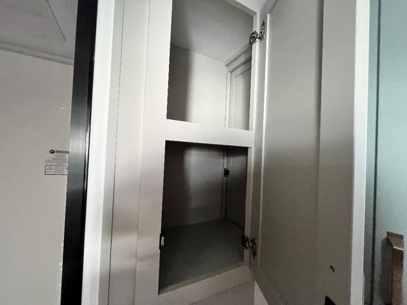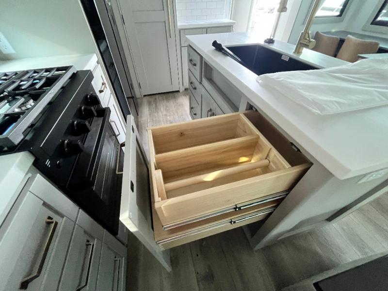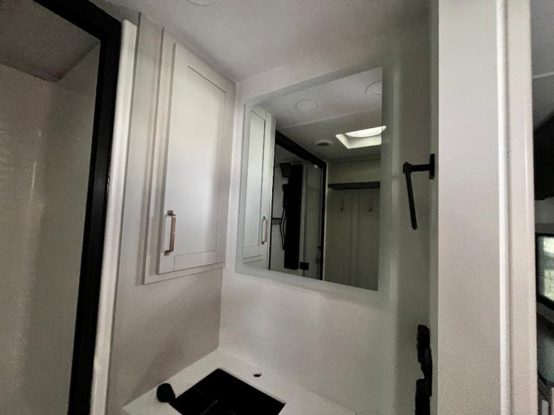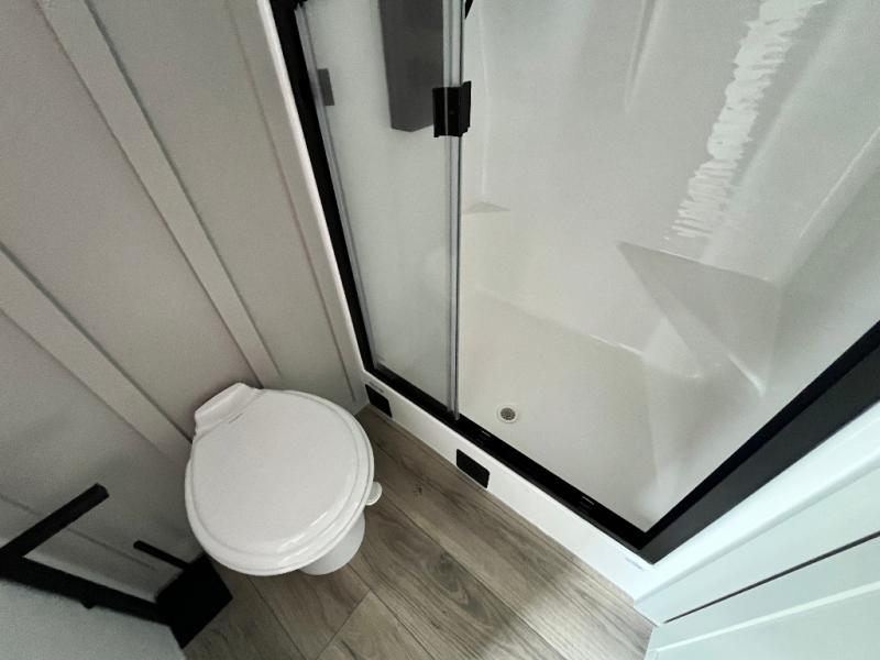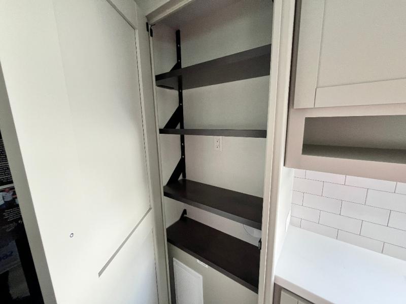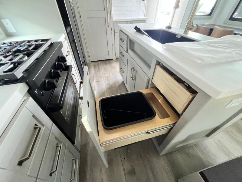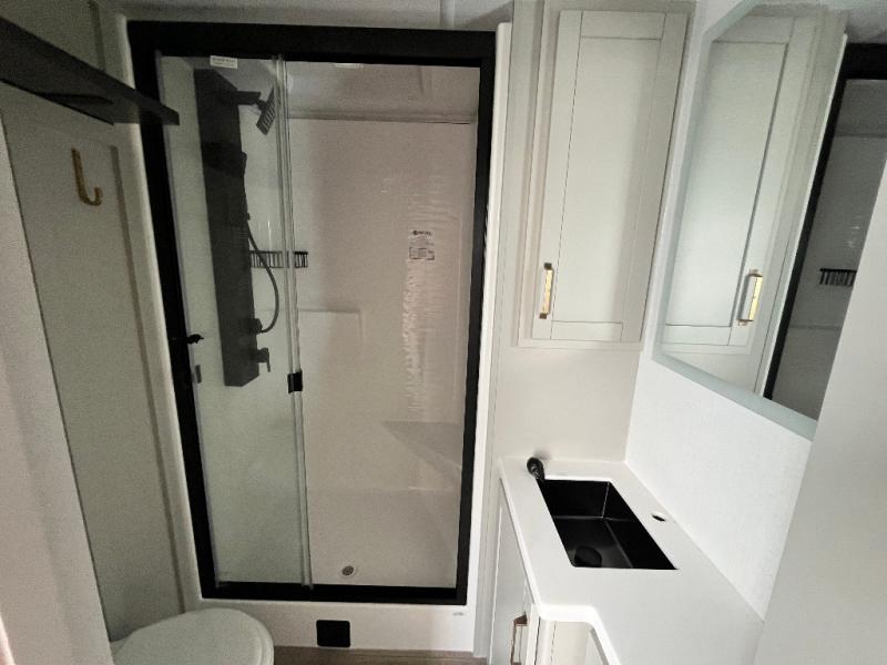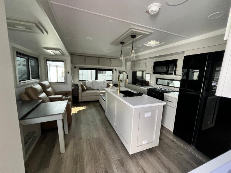 You will love all the space and features in this travel trailer! A luxurious rear living room offers plenty of room to spread out, with a 72" tri-fold sofa plus theater seats, all arranged with a perfect view of the 50" TV over the fireplace. A central kitchen area includes an island with hidden pet bowls. Find even more storage with the hutch plus pantry with adjustable shelves. The front bedroom comes with a queen bed, but if you'd like you can upgrade to a king for even more room. No matter which you choose, you will enjoy watching the 32" bedroom TV. The full-width wardrobe has room for all of your clothes and also includes prep for an optional washer and dryer. And the full bath includes a 30" x 42" one-piece fiberglass shower. Outside you'll enjoy two awnings, pass-through storage, and LED chassis lighting.