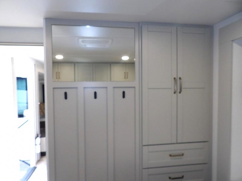 You will love all the space and features in this travel trailer! A luxurious rear living room offers plenty of room to spread out, with a 72" tri-fold sofa plus theater seats, all arranged with a perfect view of the 50" TV over the fireplace. A central kitchen area includes an island with hidden pet bowls. Find even more storage with the hutch plus pantry with adjustable shelves. The front bedroom comes with a queen bed, but if you'd like you can upgrade to a king for even more room. No matter which you choose, you will enjoy watching the 32" bedroom TV. The full-width wardrobe has room for all of your clothes and also includes prep for an optional washer and dryer. And the full bath includes a 30" x 42" one-piece fiberglass shower. Outside you'll enjoy two awnings, pass-through storage, and LED chassis lighting.