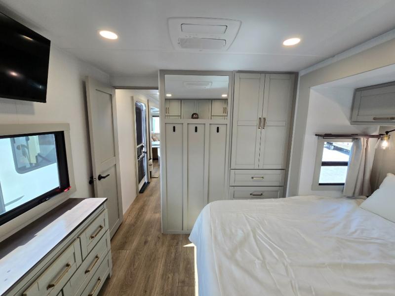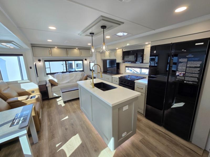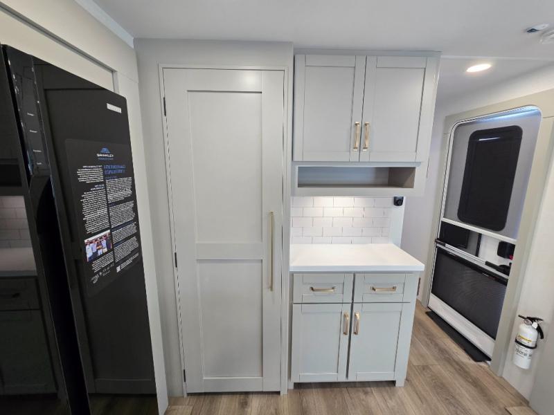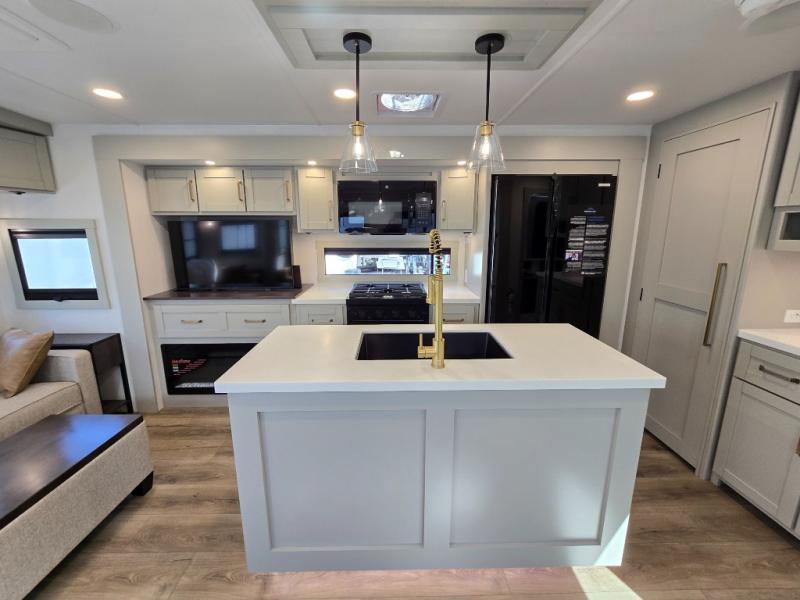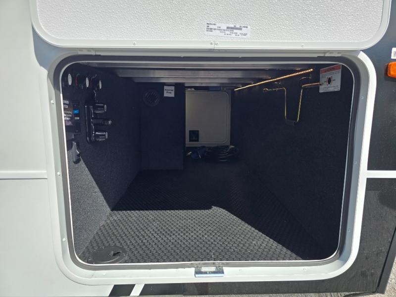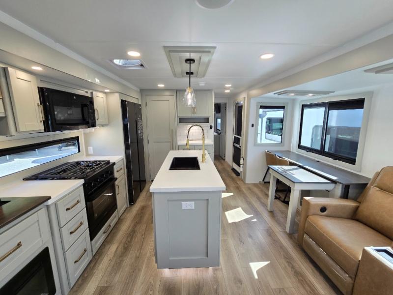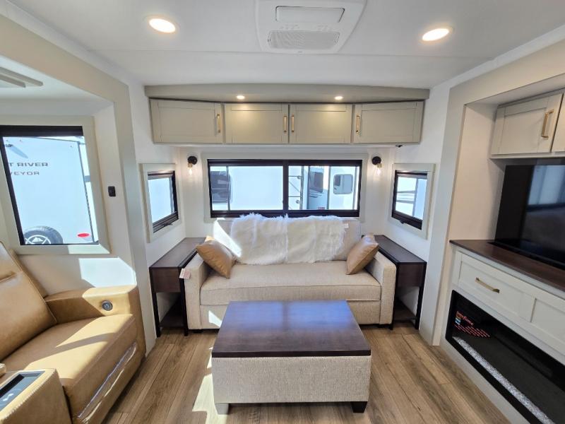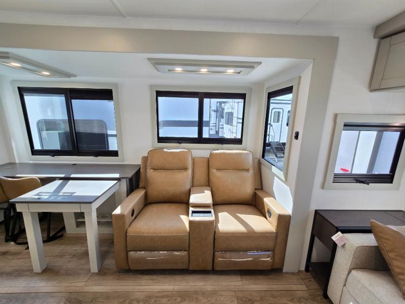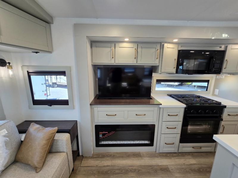 You will love all the space and features in this travel trailer! A luxurious rear living room offers plenty of room to spread out, with a 72" tri-fold sofa plus theater seats, all arranged with a perfect view of the 50" TV over the fireplace. A central kitchen area includes an island with hidden pet bowls. Find even more storage with the hutch plus pantry with adjustable shelves. The front bedroom comes with a queen bed, but if you'd like you can upgrade to a king for even more room. No matter which you choose, you will enjoy watching the 32" bedroom TV. The full-width wardrobe has room for all of your clothes and also includes prep for an optional washer and dryer. And the full bath includes a 30" x 42" one-piece fiberglass shower. Outside you'll enjoy two awnings, pass-through storage, and LED chassis lighting.
