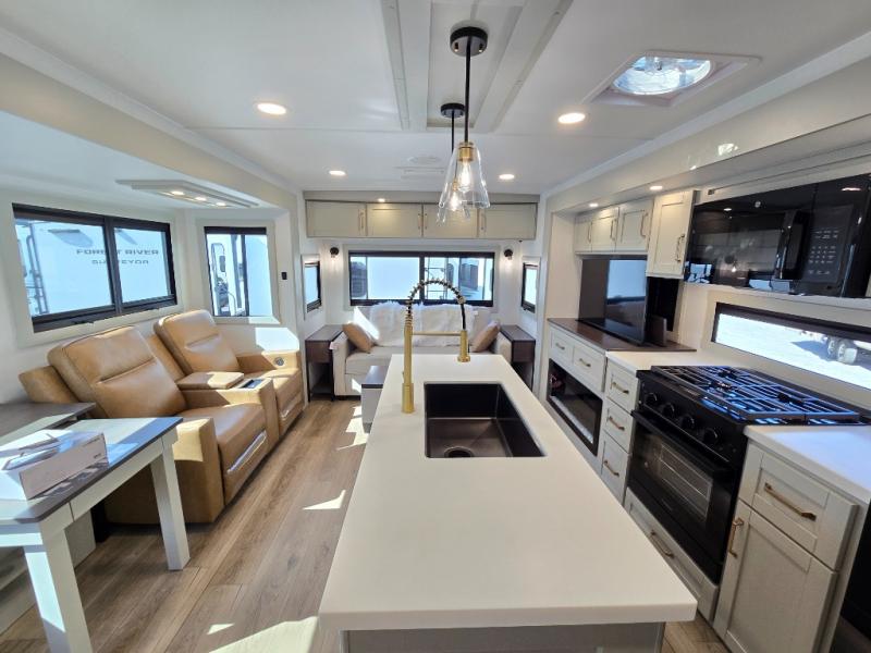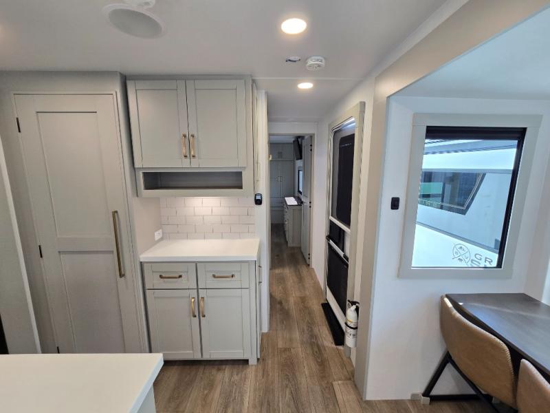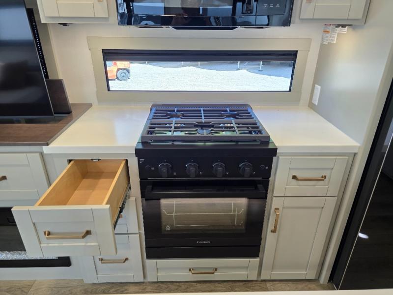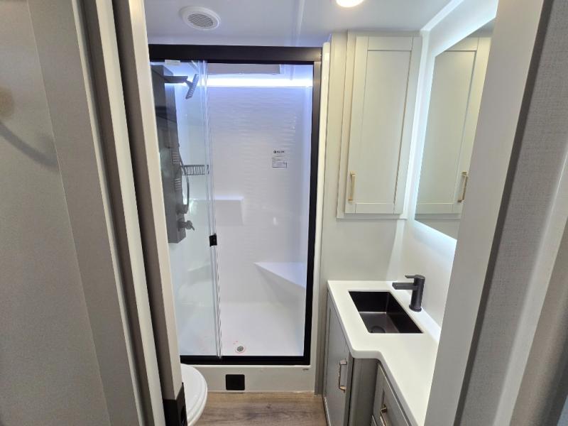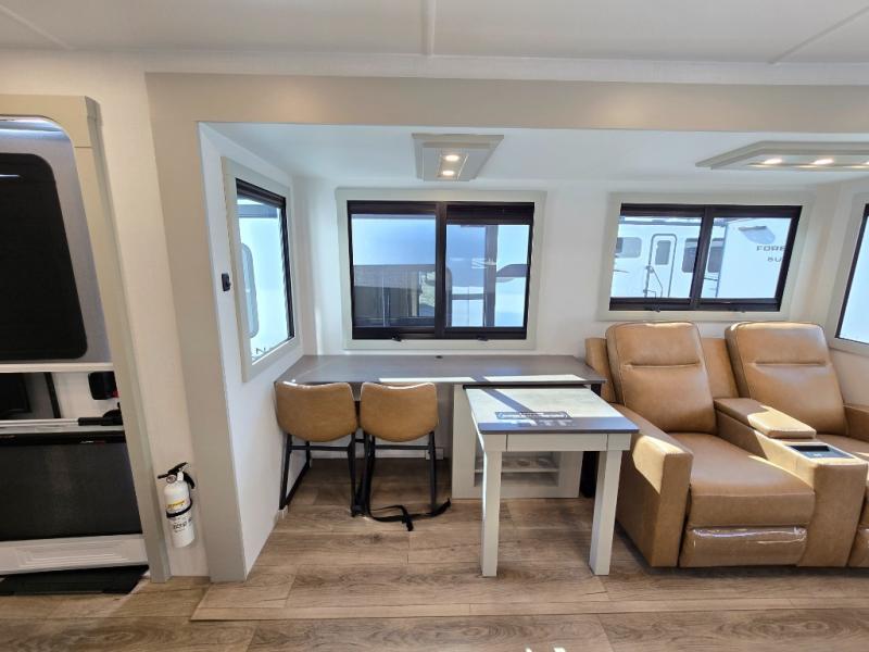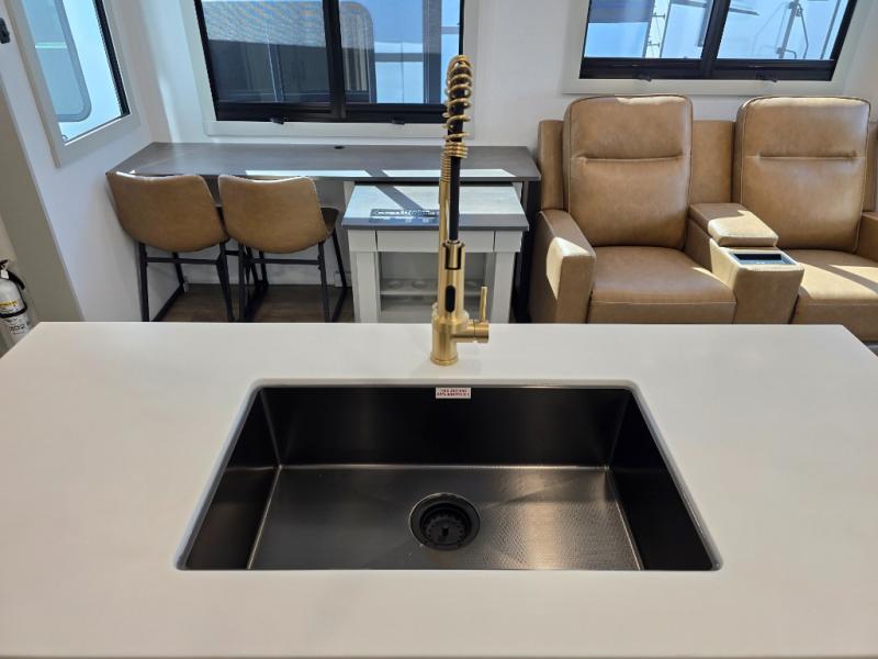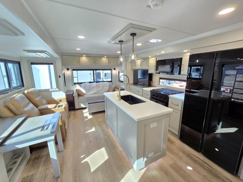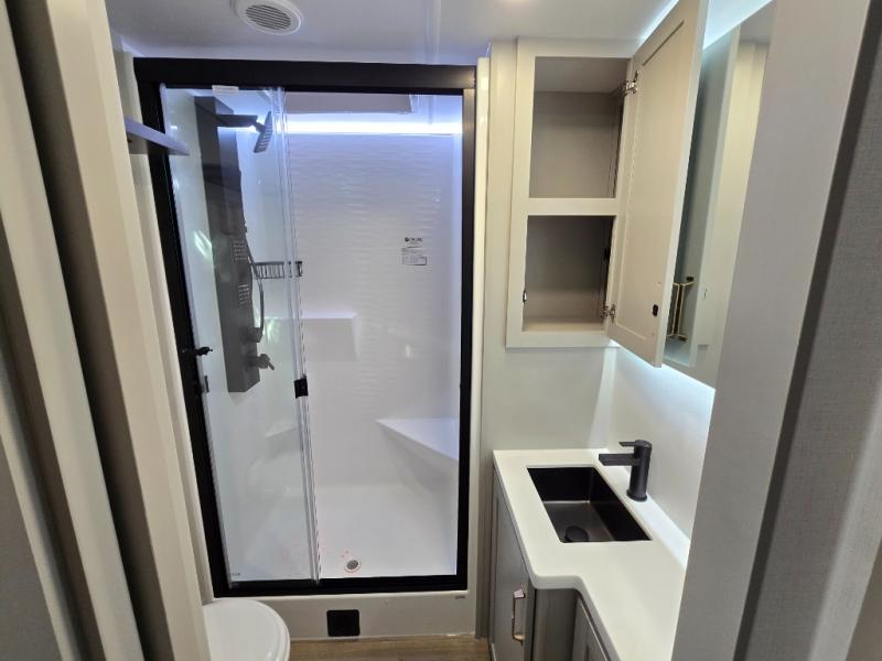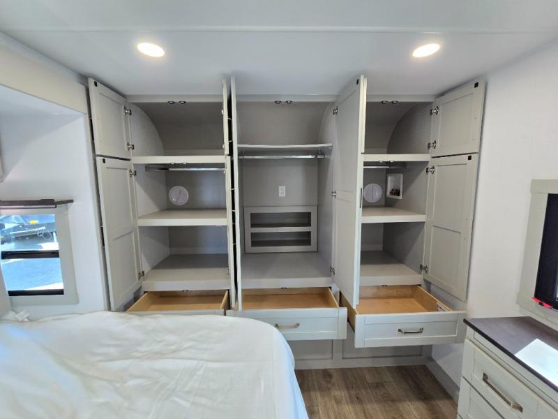 You will love all the space and features in this travel trailer! A luxurious rear living room offers plenty of room to spread out, with a 72" tri-fold sofa plus theater seats, all arranged with a perfect view of the 50" TV over the fireplace. A central kitchen area includes an island with hidden pet bowls. Find even more storage with the hutch plus pantry with adjustable shelves. The front bedroom comes with a queen bed, but if you'd like you can upgrade to a king for even more room. No matter which you choose, you will enjoy watching the 32" bedroom TV. The full-width wardrobe has room for all of your clothes and also includes prep for an optional washer and dryer. And the full bath includes a 30" x 42" one-piece fiberglass shower. Outside you'll enjoy two awnings, pass-through storage, and LED chassis lighting.