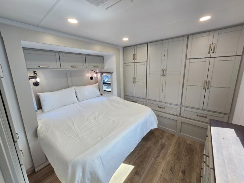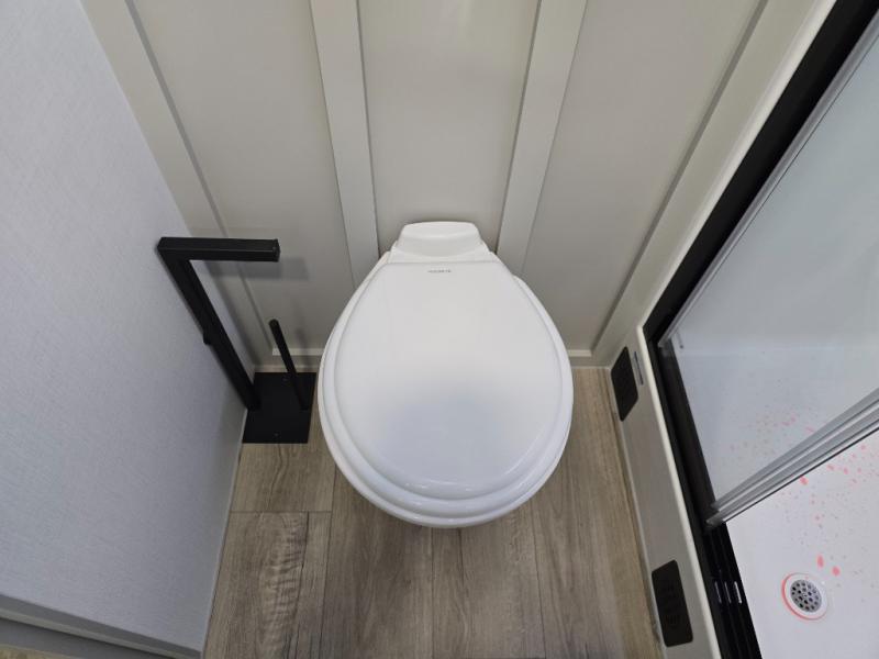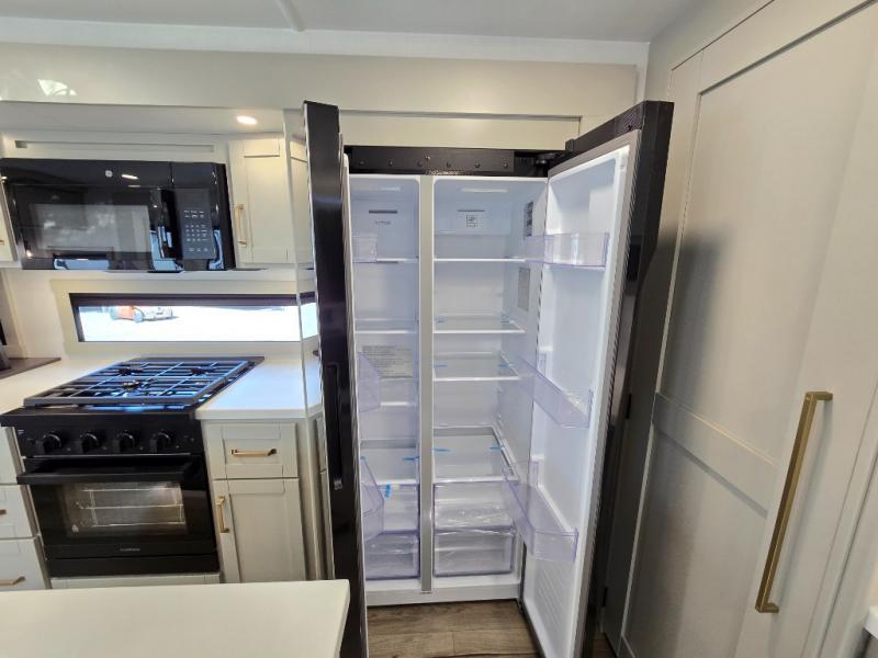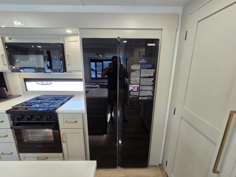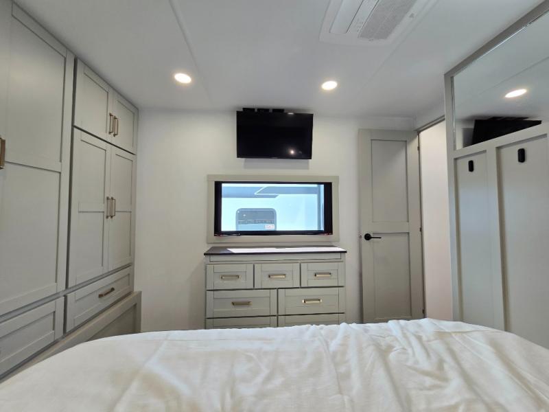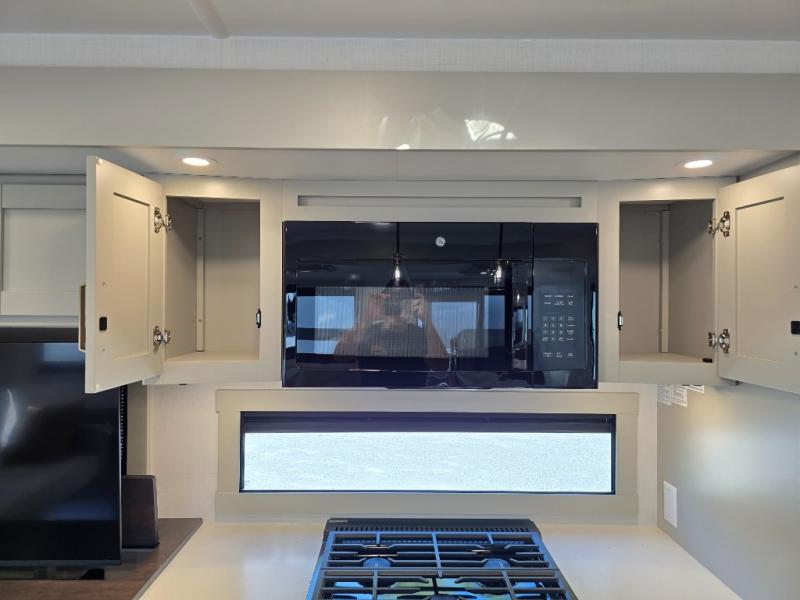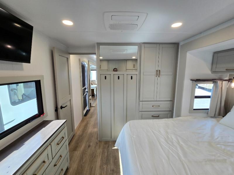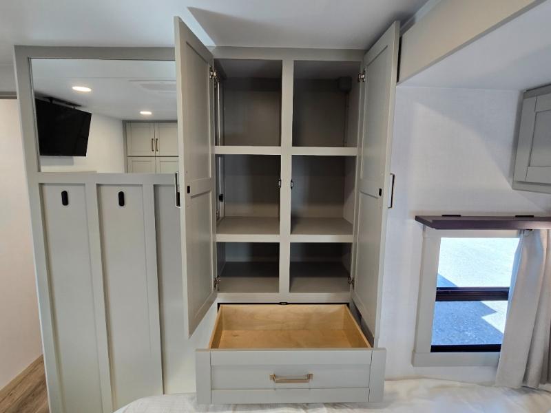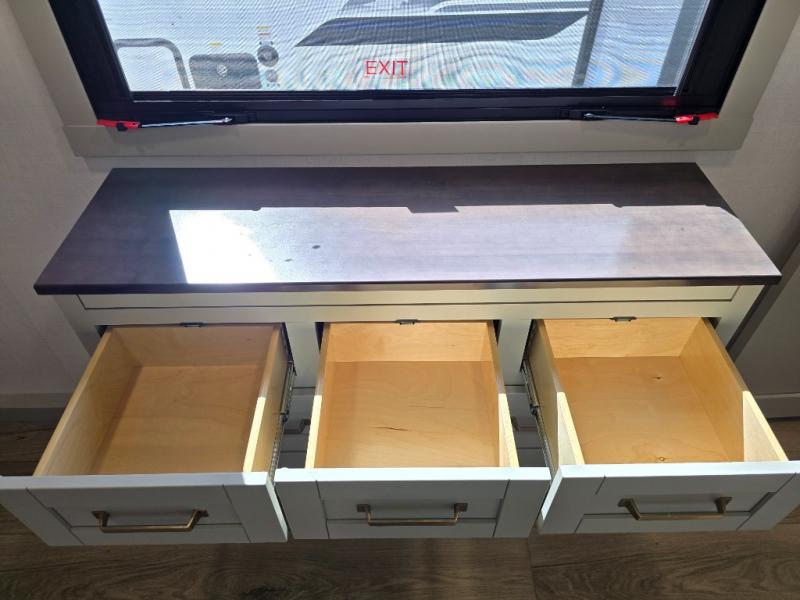 You will love all the space and features in this travel trailer! A luxurious rear living room offers plenty of room to spread out, with a 72" tri-fold sofa plus theater seats, all arranged with a perfect view of the 50" TV over the fireplace. A central kitchen area includes an island with hidden pet bowls. Find even more storage with the hutch plus pantry with adjustable shelves. The front bedroom comes with a queen bed, but if you'd like you can upgrade to a king for even more room. No matter which you choose, you will enjoy watching the 32" bedroom TV. The full-width wardrobe has room for all of your clothes and also includes prep for an optional washer and dryer. And the full bath includes a 30" x 42" one-piece fiberglass shower. Outside you'll enjoy two awnings, pass-through storage, and LED chassis lighting.