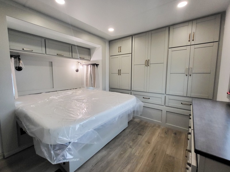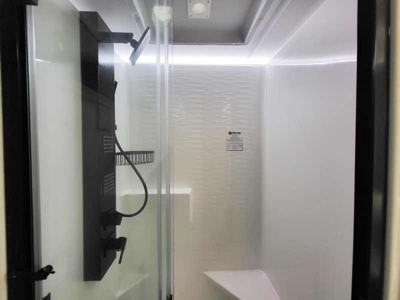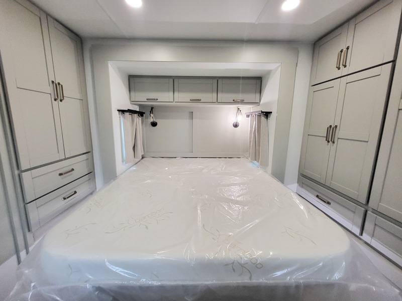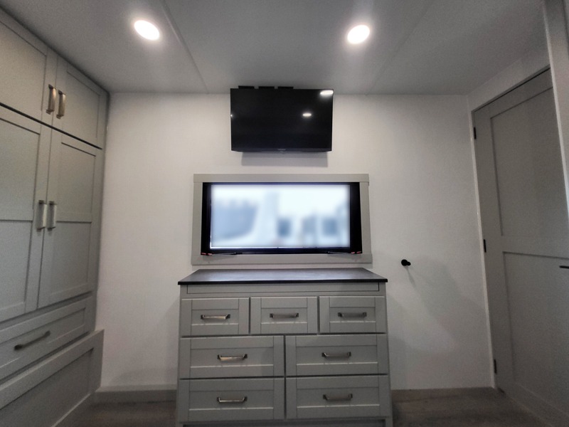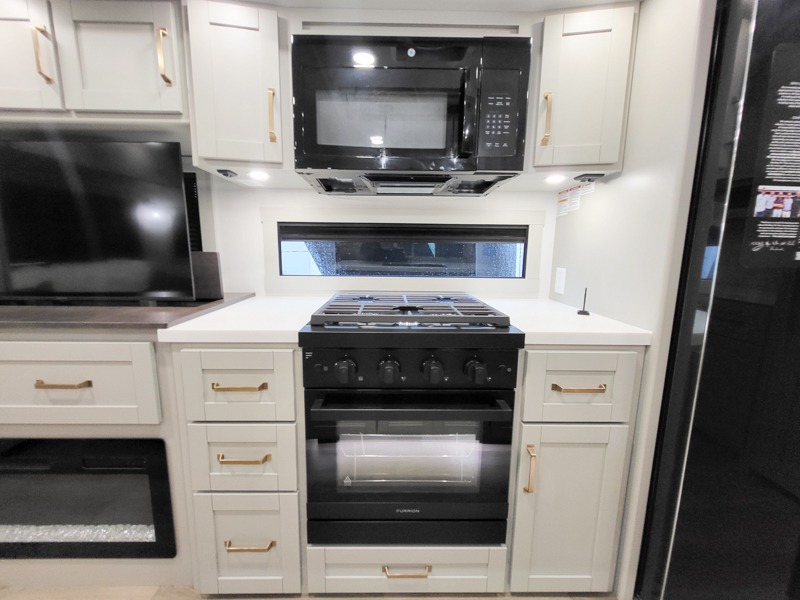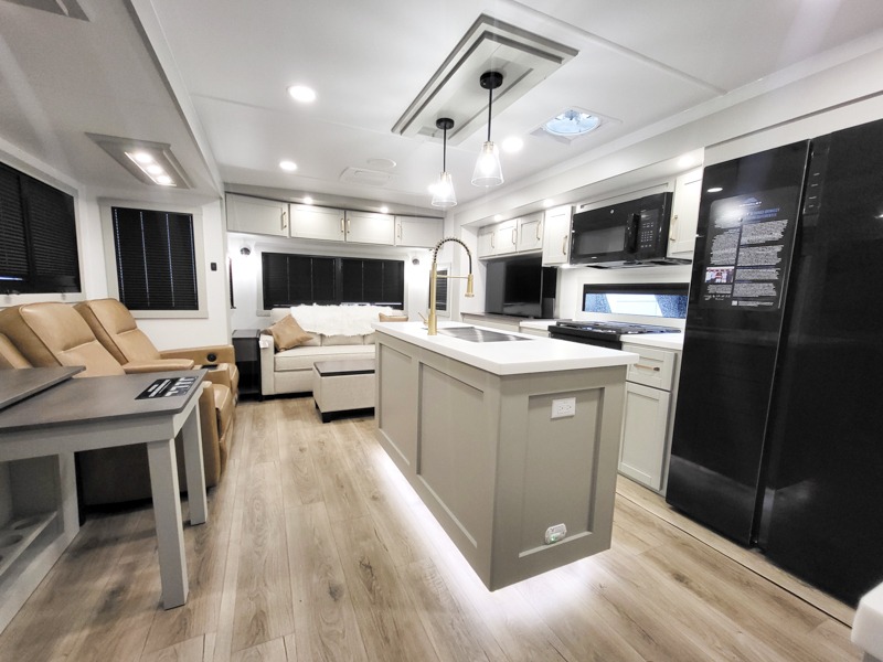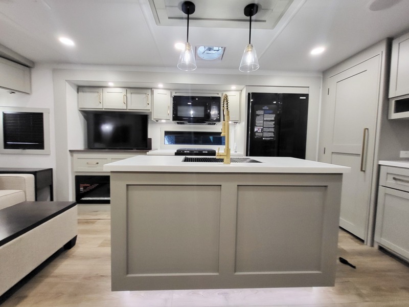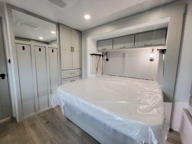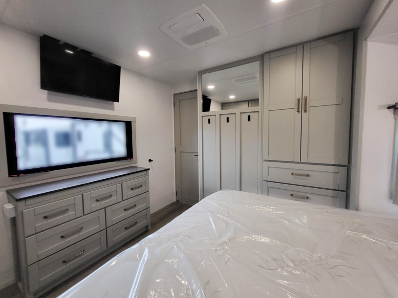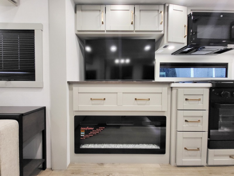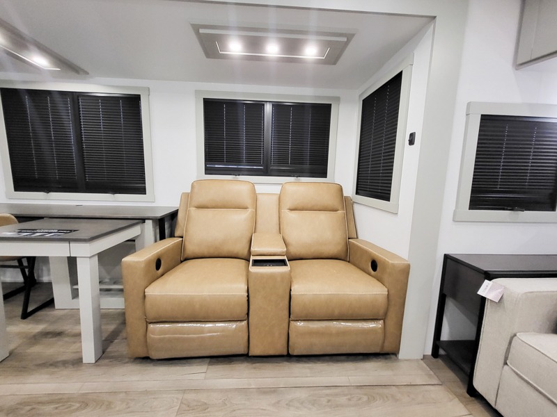 You will love all the space and features in this travel trailer! A luxurious rear living room offers plenty of room to spread out, with a 72" tri-fold sofa plus theater seats, all arranged with a perfect view of the 50" TV over the fireplace. A central kitchen area includes an island with hidden pet bowls. Find even more storage with the hutch plus pantry with adjustable shelves. The front bedroom comes with a queen bed, but if you'd like you can upgrade to a king for even more room. No matter which you choose, you will enjoy watching the 32" bedroom TV. The full-width wardrobe has room for all of your clothes and also includes prep for an optional washer and dryer. And the full bath includes a 30" x 42" one-piece fiberglass shower. Outside you'll enjoy two awnings, pass-through storage, and LED chassis lighting.