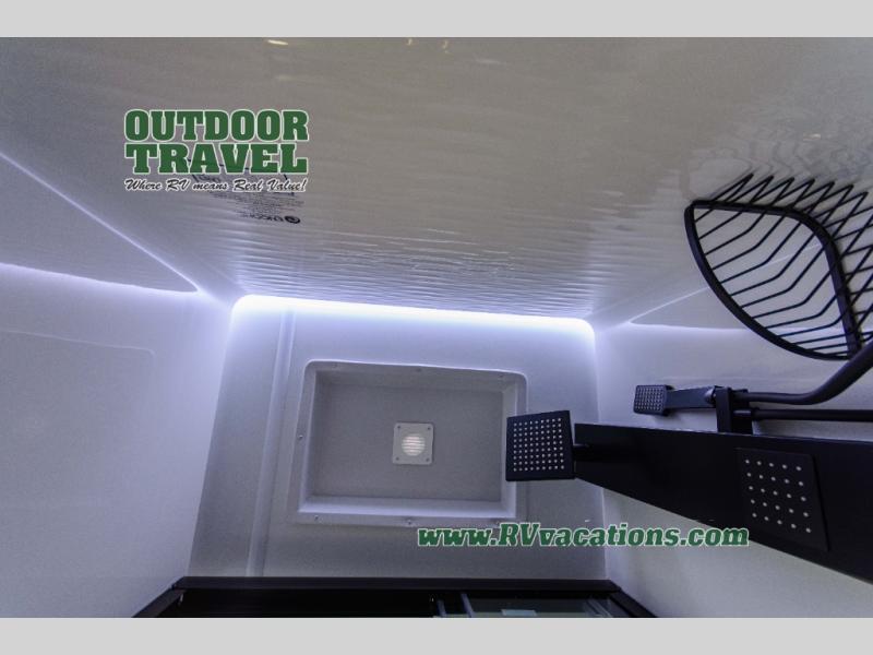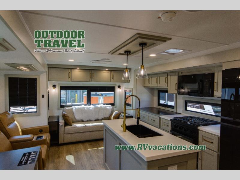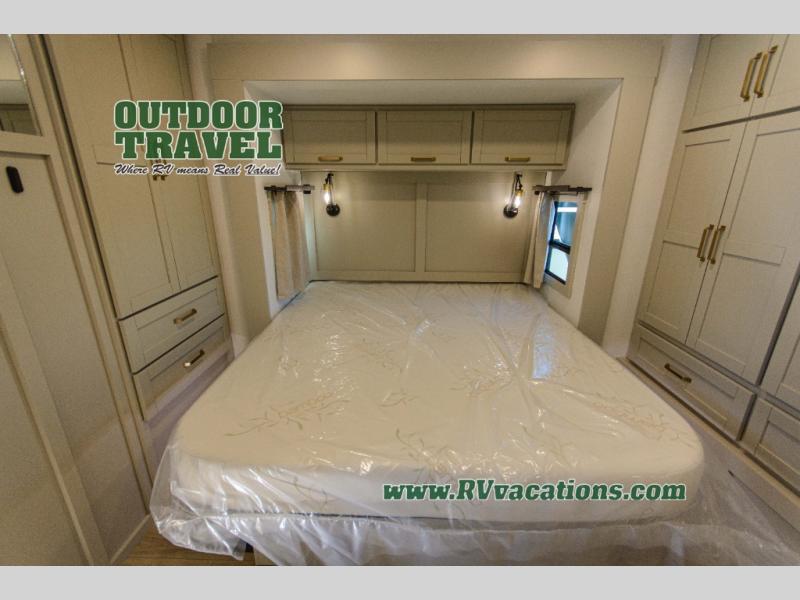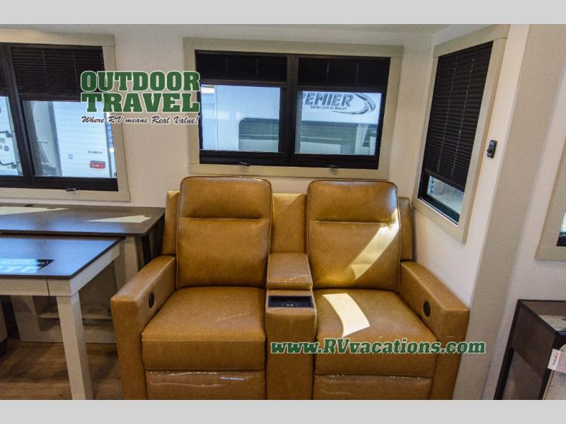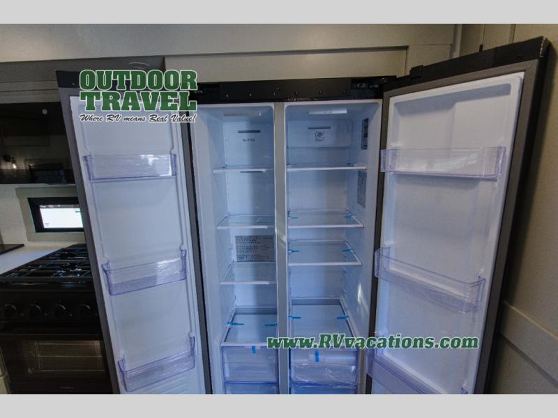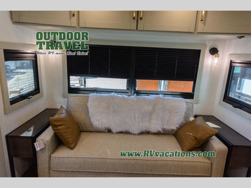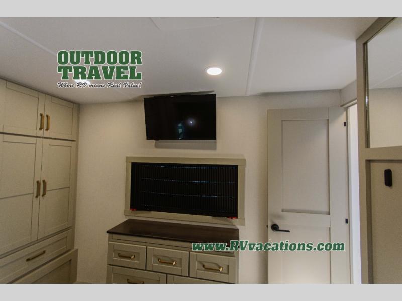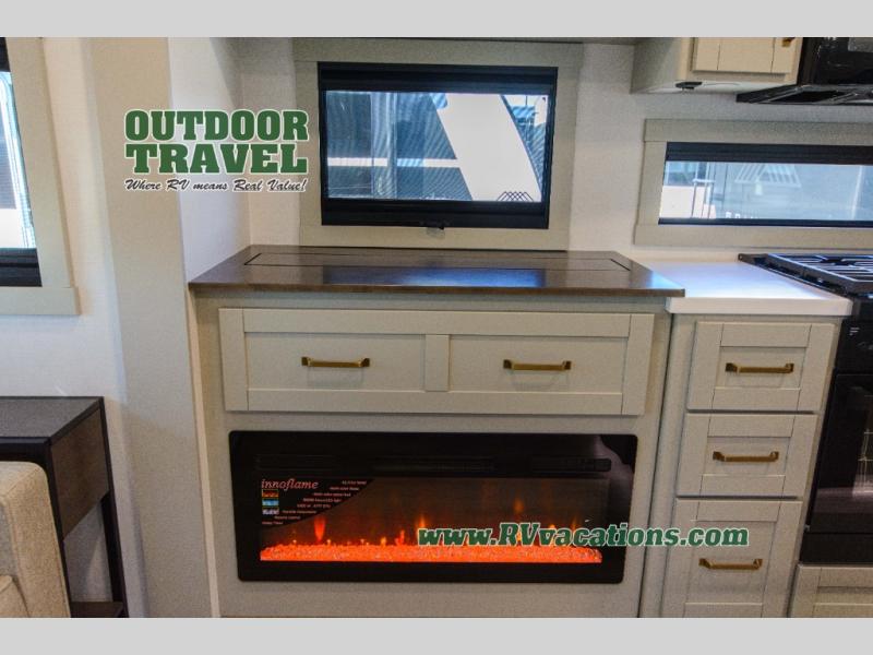 You will love all the space and features in this travel trailer! A luxurious rear living room offers plenty of room to spread out, with a 72" tri-fold sofa plus theater seats, all arranged with a perfect view of the 50" TV over the fireplace. A central kitchen area includes an island with hidden pet bowls. Find even more storage with the hutch plus pantry with adjustable shelves. The front bedroom comes with a queen bed, but if you'd like you can upgrade to a king for even more room. No matter which you choose, you will enjoy watching the 32" bedroom TV. The full-width wardrobe has room for all of your clothes and also includes prep for an optional washer and dryer. And the full bath includes a 30" x 42" one-piece fiberglass shower. Outside you'll enjoy two awnings, pass-through storage, and LED chassis lighting.