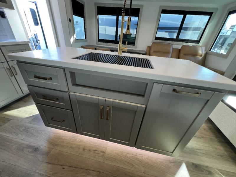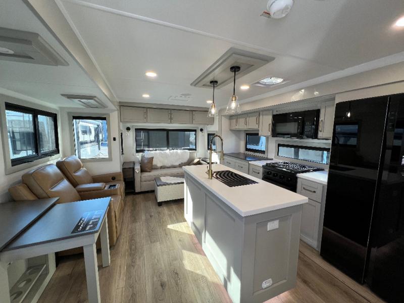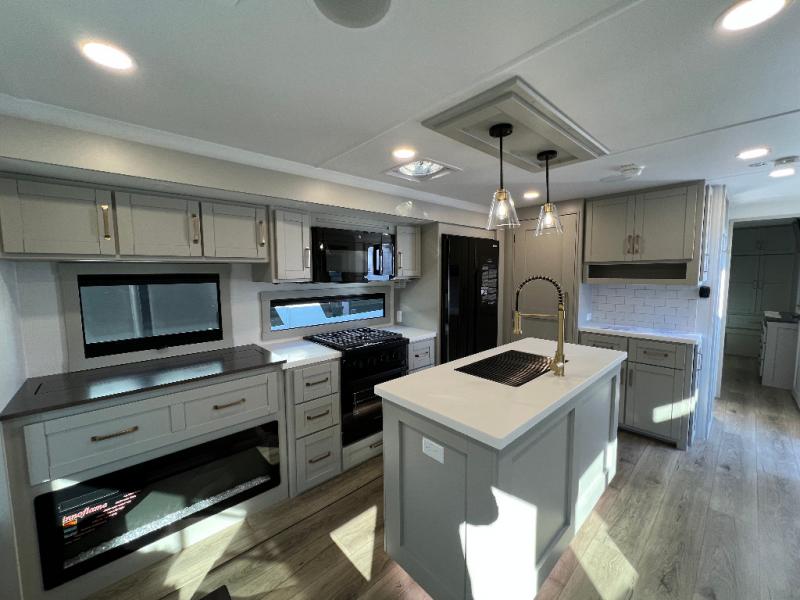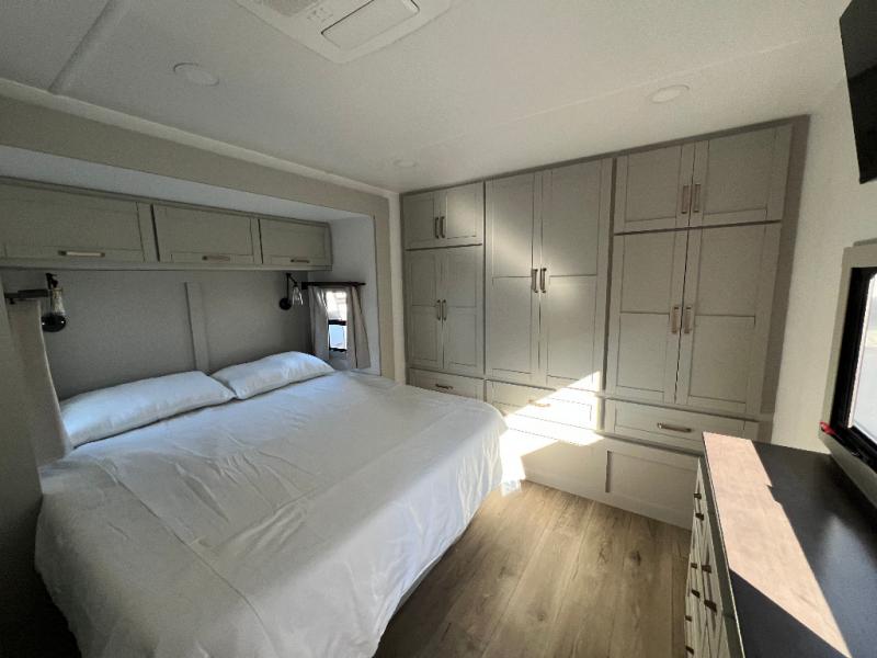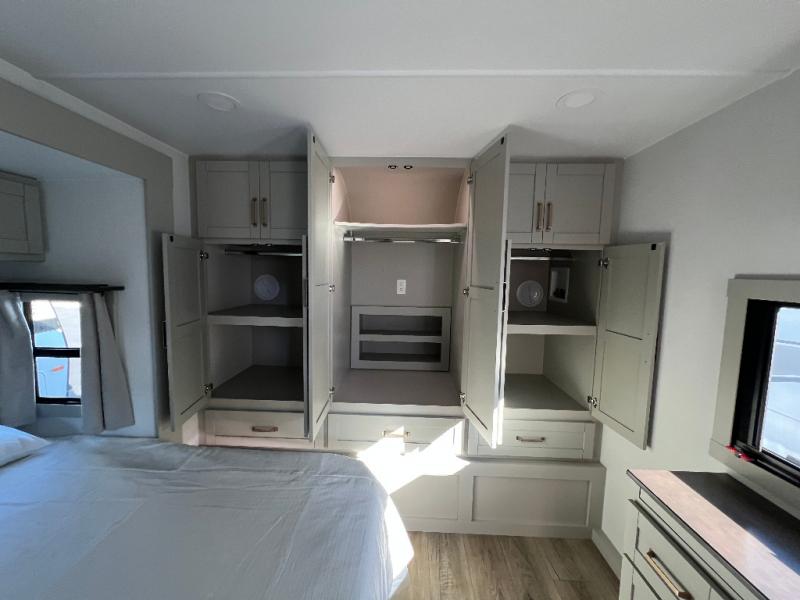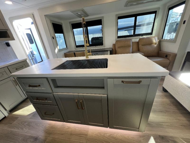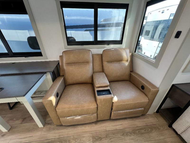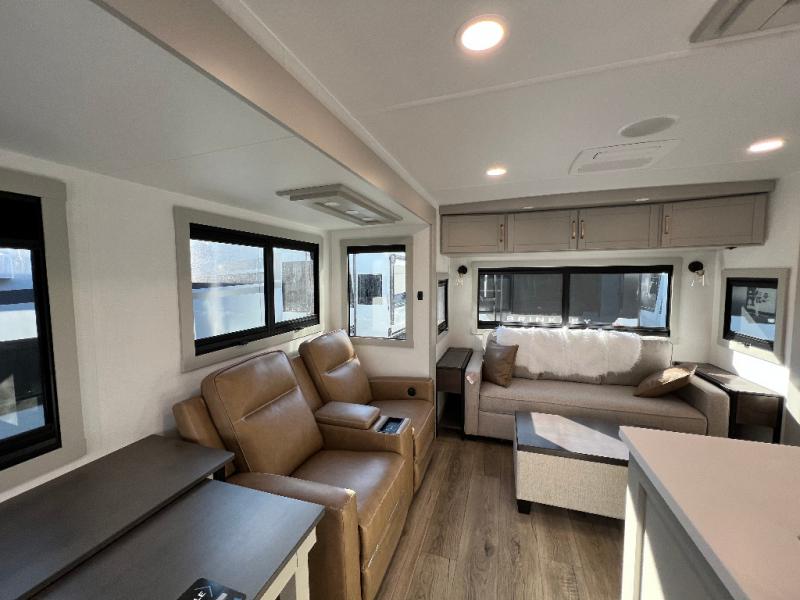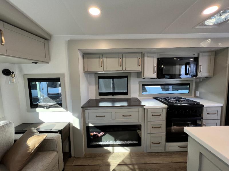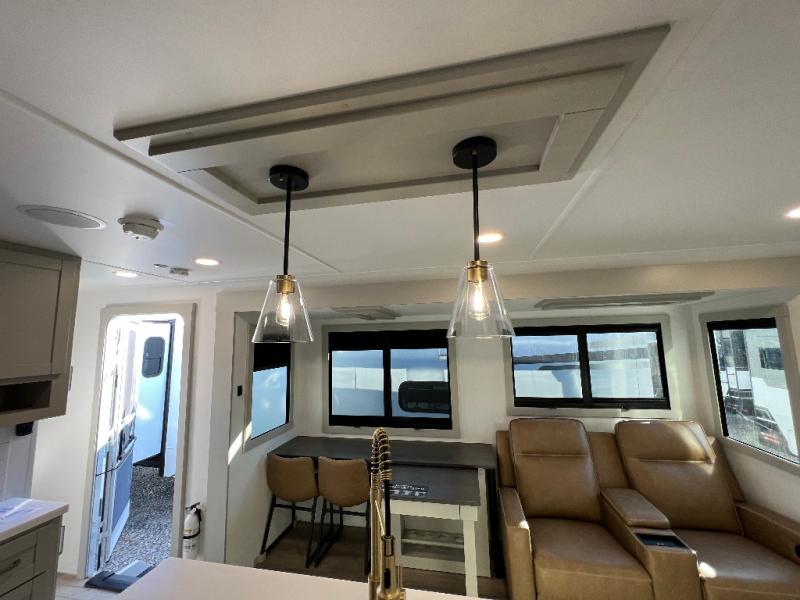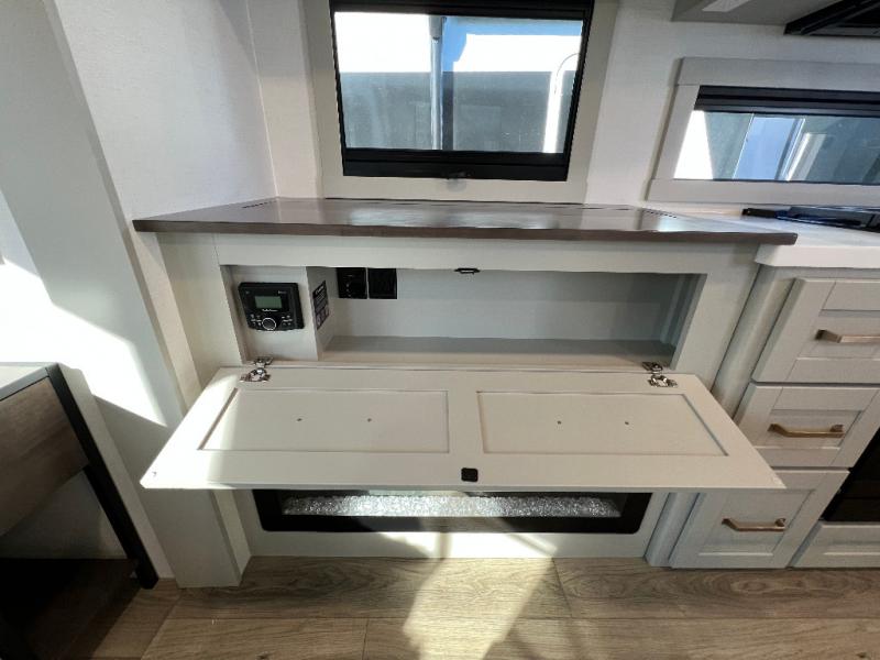 You will love all the space and features in this travel trailer! A luxurious rear living room offers plenty of room to spread out, with a 72" tri-fold sofa plus theater seats, all arranged with a perfect view of the 50" TV over the fireplace. A central kitchen area includes an island with hidden pet bowls. Find even more storage with the hutch plus pantry with adjustable shelves. The front bedroom comes with a queen bed, but if you'd like you can upgrade to a king for even more room. No matter which you choose, you will enjoy watching the 32" bedroom TV. The full-width wardrobe has room for all of your clothes and also includes prep for an optional washer and dryer. And the full bath includes a 30" x 42" one-piece fiberglass shower. Outside you'll enjoy two awnings, pass-through storage, and LED chassis lighting.