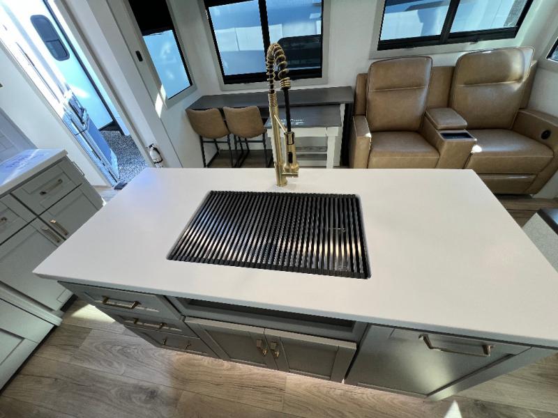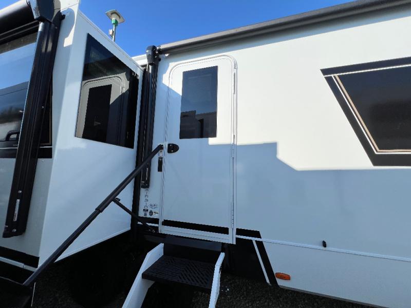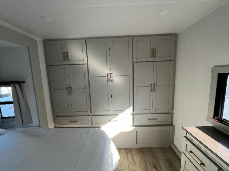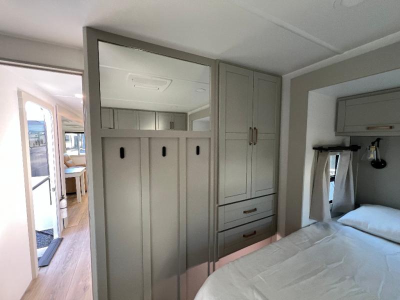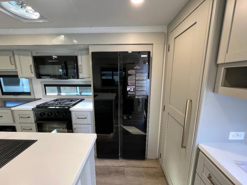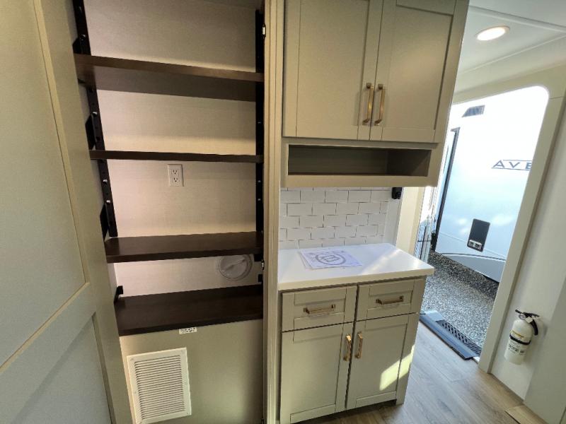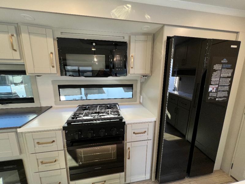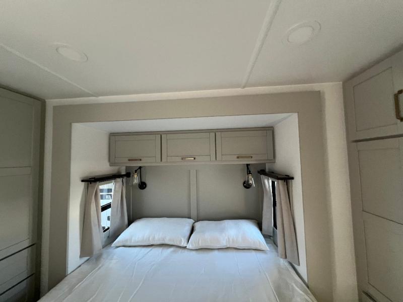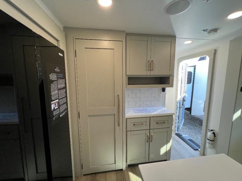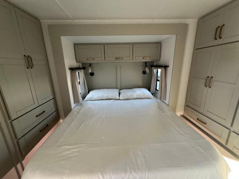 You will love all the space and features in this travel trailer! A luxurious rear living room offers plenty of room to spread out, with a 72" tri-fold sofa plus theater seats, all arranged with a perfect view of the 50" TV over the fireplace. A central kitchen area includes an island with hidden pet bowls. Find even more storage with the hutch plus pantry with adjustable shelves. The front bedroom comes with a queen bed, but if you'd like you can upgrade to a king for even more room. No matter which you choose, you will enjoy watching the 32" bedroom TV. The full-width wardrobe has room for all of your clothes and also includes prep for an optional washer and dryer. And the full bath includes a 30" x 42" one-piece fiberglass shower. Outside you'll enjoy two awnings, pass-through storage, and LED chassis lighting.