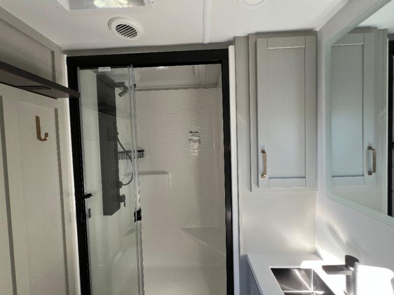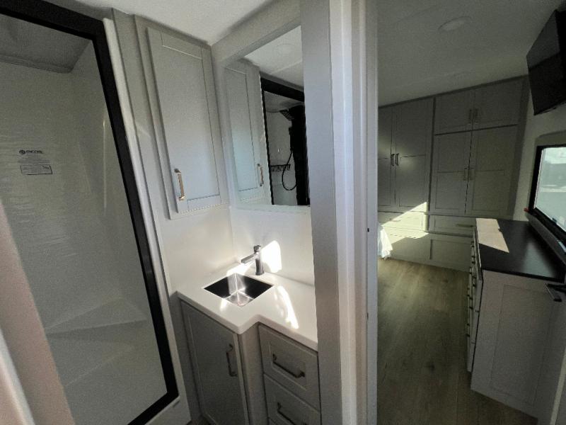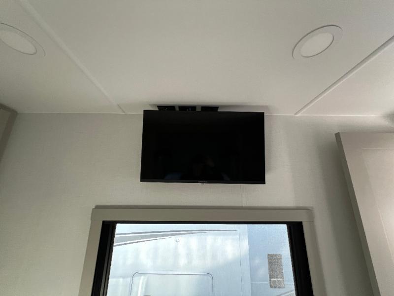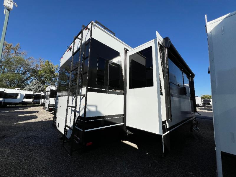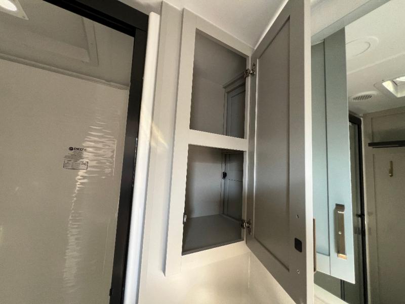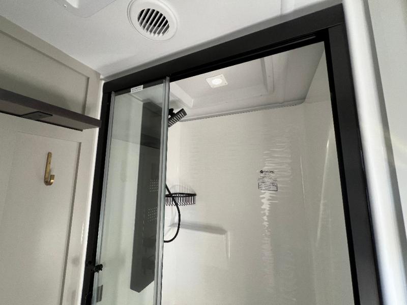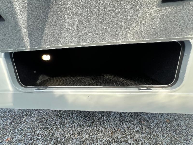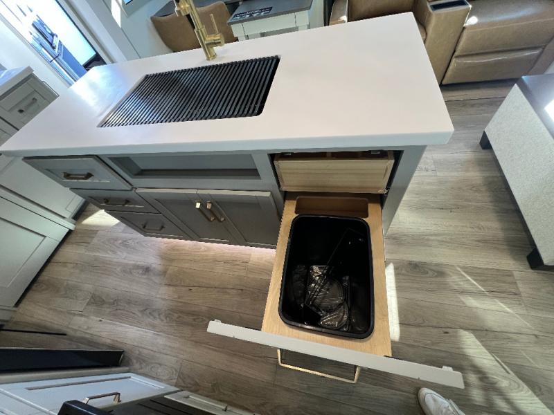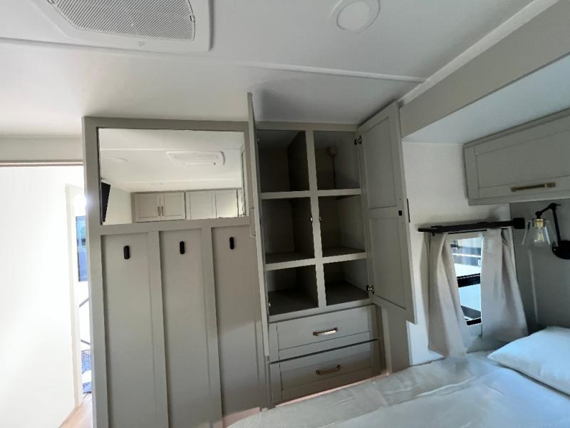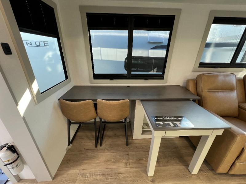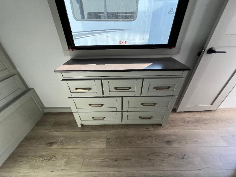 You will love all the space and features in this travel trailer! A luxurious rear living room offers plenty of room to spread out, with a 72" tri-fold sofa plus theater seats, all arranged with a perfect view of the 50" TV over the fireplace. A central kitchen area includes an island with hidden pet bowls. Find even more storage with the hutch plus pantry with adjustable shelves. The front bedroom comes with a queen bed, but if you'd like you can upgrade to a king for even more room. No matter which you choose, you will enjoy watching the 32" bedroom TV. The full-width wardrobe has room for all of your clothes and also includes prep for an optional washer and dryer. And the full bath includes a 30" x 42" one-piece fiberglass shower. Outside you'll enjoy two awnings, pass-through storage, and LED chassis lighting.