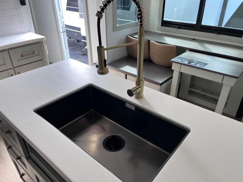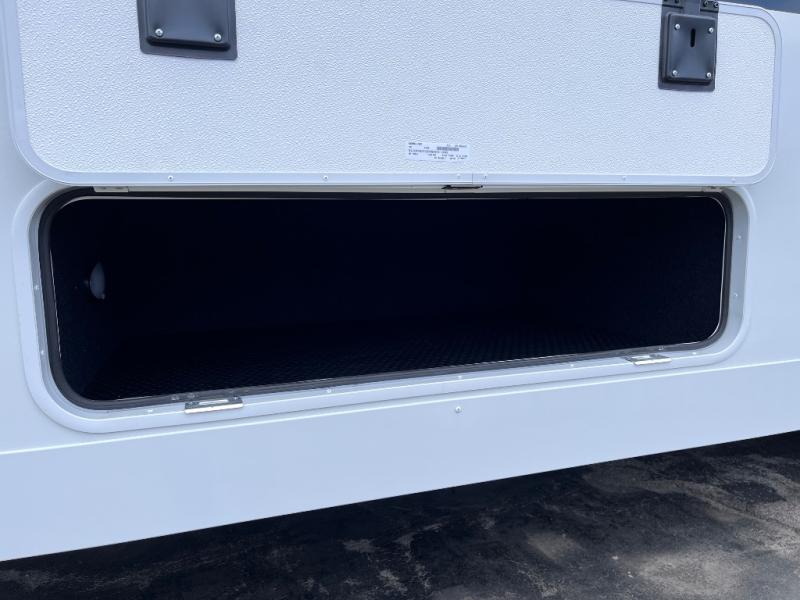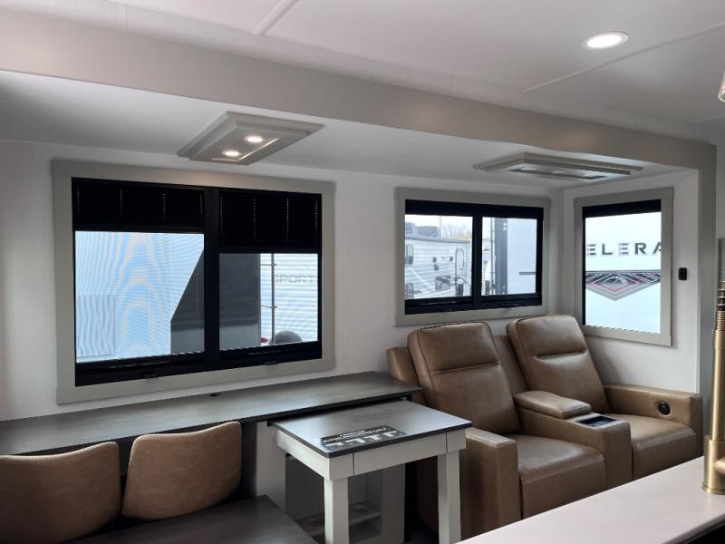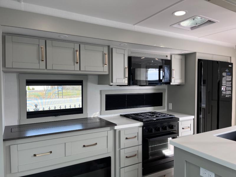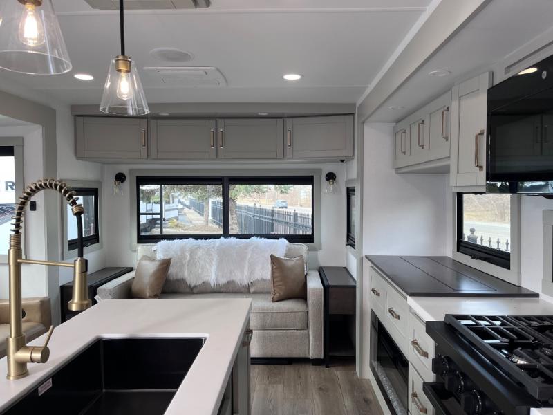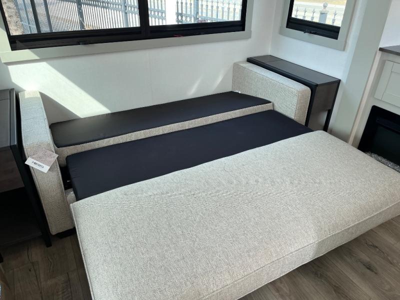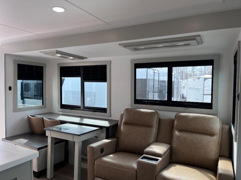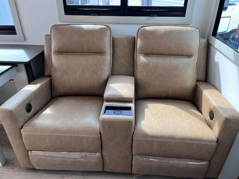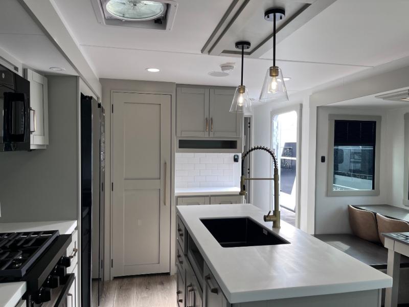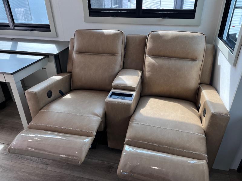 You will love all the space and features in this travel trailer! A luxurious rear living room offers plenty of room to spread out, with a 72" tri-fold sofa plus theater seats, all arranged with a perfect view of the 42" TV over the fireplace. A central kitchen area includes an island with hidden pet bowls. Find even more storage with the hutch plus pantry with adjustable shelves. The front bedroom comes with a queen bed, but if you'd like you can upgrade to a king for even more room. No matter which you choose, you will enjoy watching the 32" bedroom TV. The full-width wardrobe has room for all of your clothes and also includes prep for an optional washer and dryer. And the full bath includes a 30" x 42" one-piece fiberglass shower. Outside you'll enjoy two awnings, pass-through storage, and LED ground lighting.
