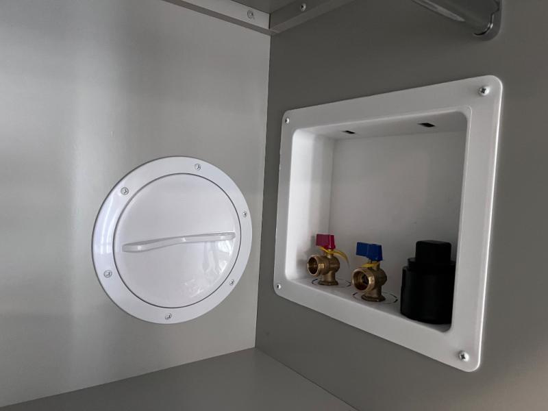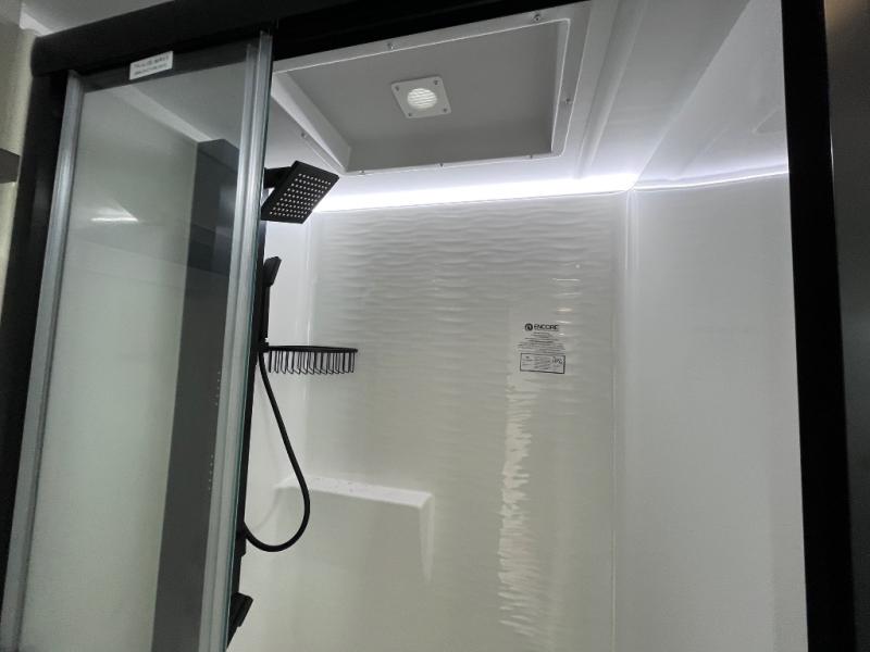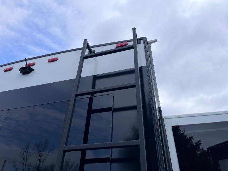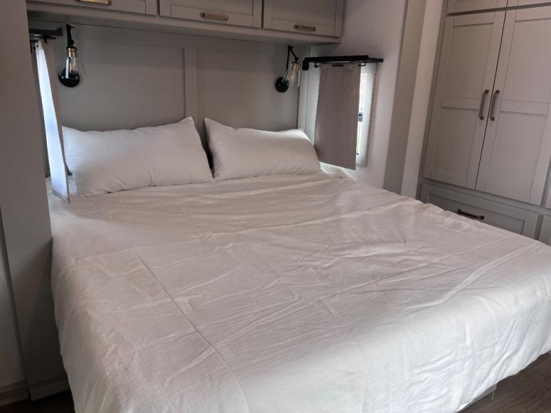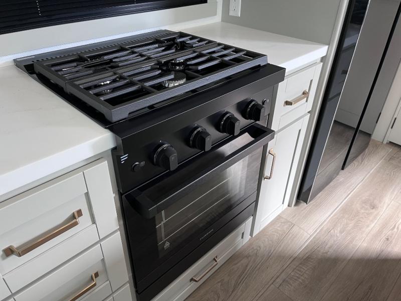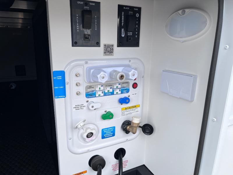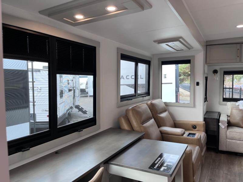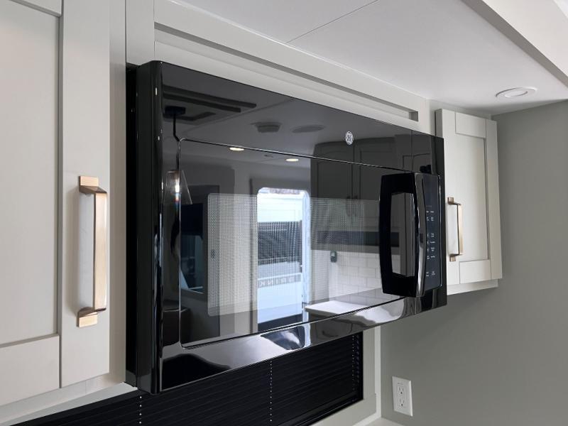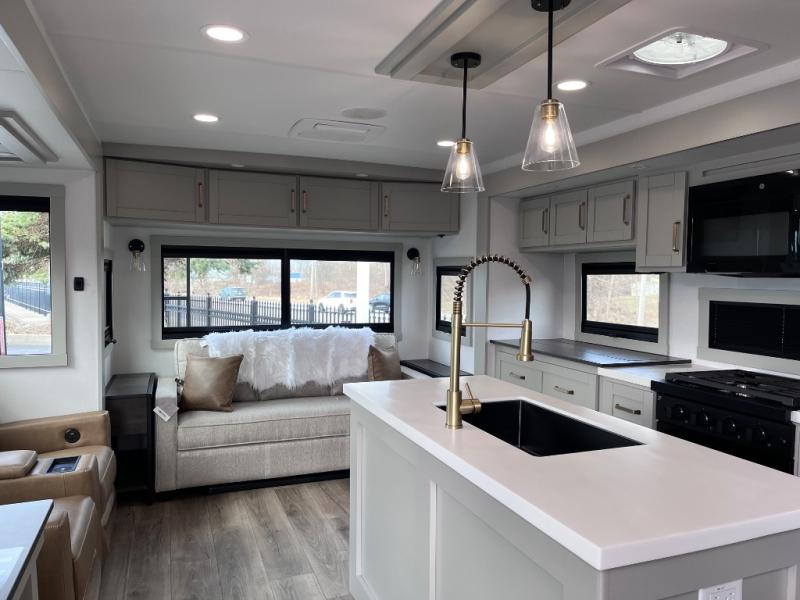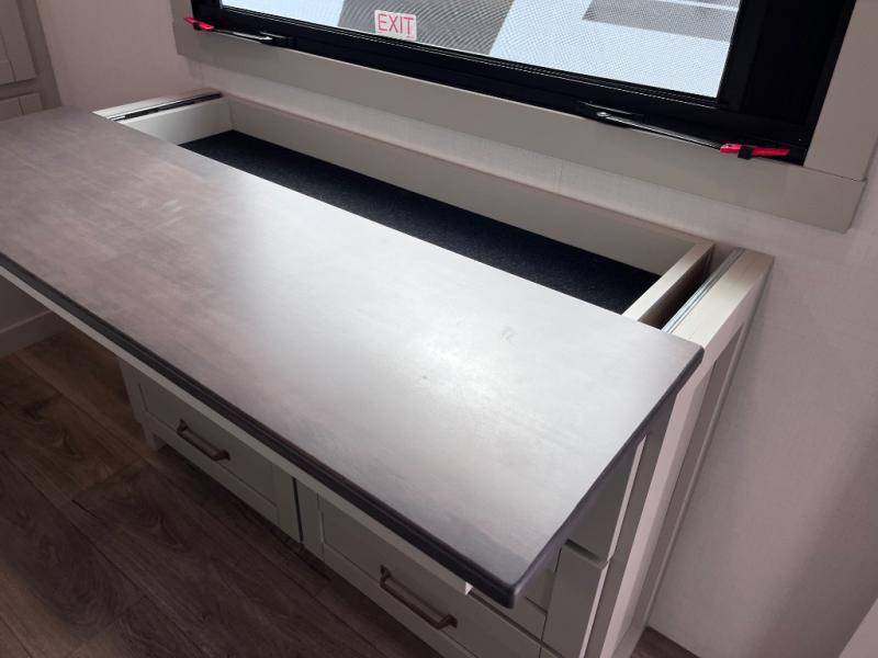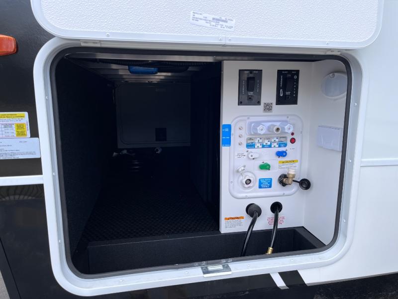 You will love all the space and features in this travel trailer! A luxurious rear living room offers plenty of room to spread out, with a 72" tri-fold sofa plus theater seats, all arranged with a perfect view of the 42" TV over the fireplace. A central kitchen area includes an island with hidden pet bowls. Find even more storage with the hutch plus pantry with adjustable shelves. The front bedroom comes with a queen bed, but if you'd like you can upgrade to a king for even more room. No matter which you choose, you will enjoy watching the 32" bedroom TV. The full-width wardrobe has room for all of your clothes and also includes prep for an optional washer and dryer. And the full bath includes a 30" x 42" one-piece fiberglass shower. Outside you'll enjoy two awnings, pass-through storage, and LED ground lighting.