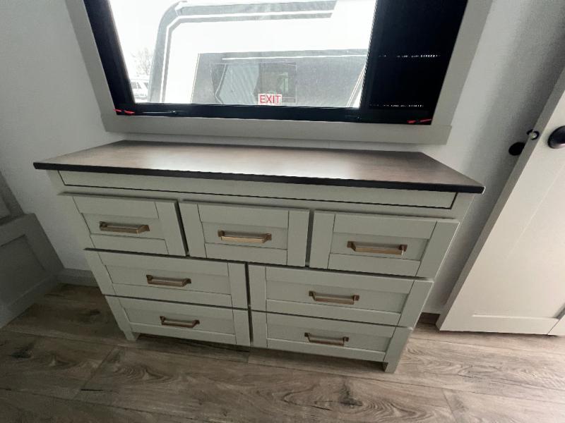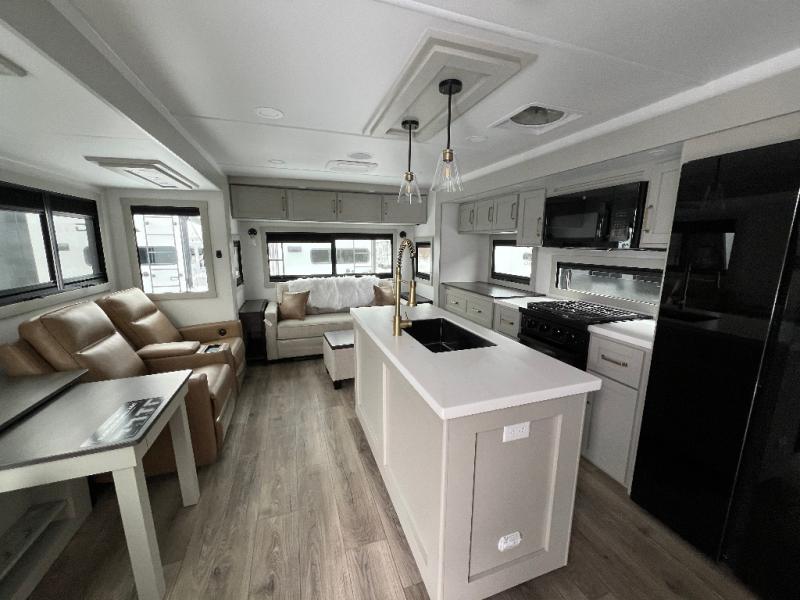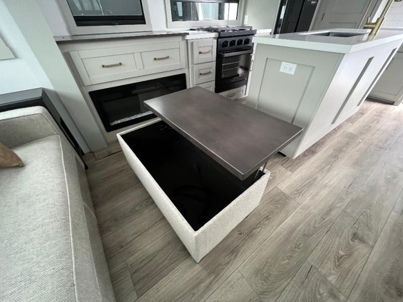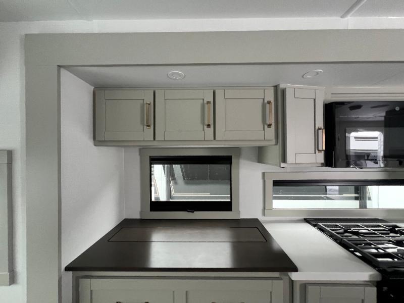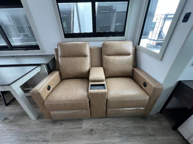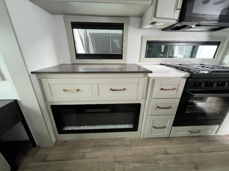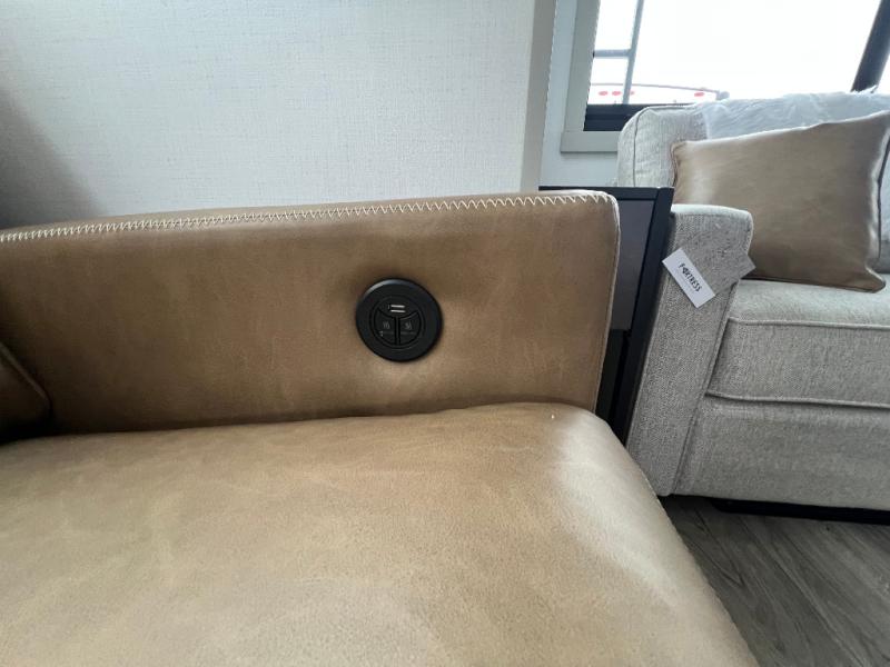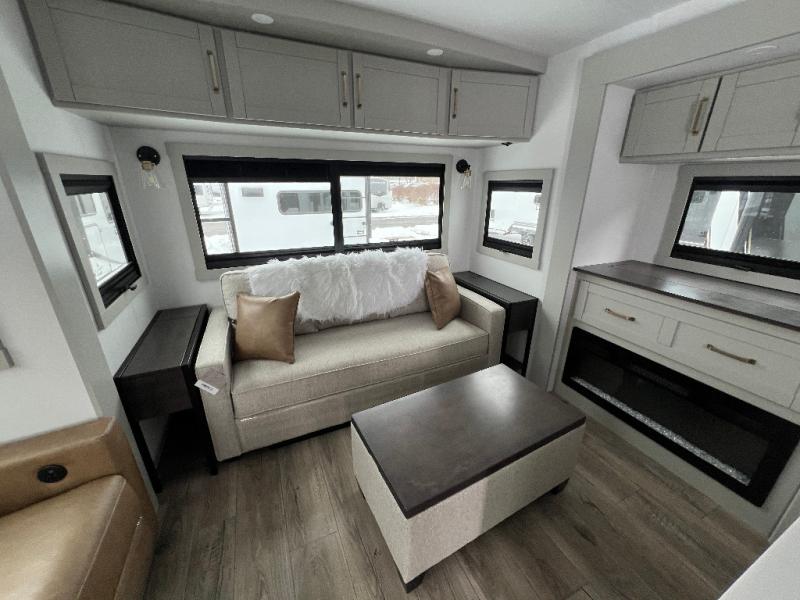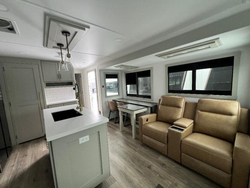 You will love all the space and features in this travel trailer! A luxurious rear living room offers plenty of room to spread out, with a 72" tri-fold sofa plus theater seats, all arranged with a perfect view of the 42" TV over the fireplace. A central kitchen area includes an island with hidden pet bowls. Find even more storage with the hutch plus pantry with adjustable shelves. The front bedroom comes with a queen bed, but if you'd like you can upgrade to a king for even more room. No matter which you choose, you will enjoy watching the 32" bedroom TV. The full-width wardrobe has room for all of your clothes and also includes prep for an optional washer and dryer. And the full bath includes a 30" x 42" one-piece fiberglass shower. Outside you'll enjoy two awnings, pass-through storage, and LED ground lighting.