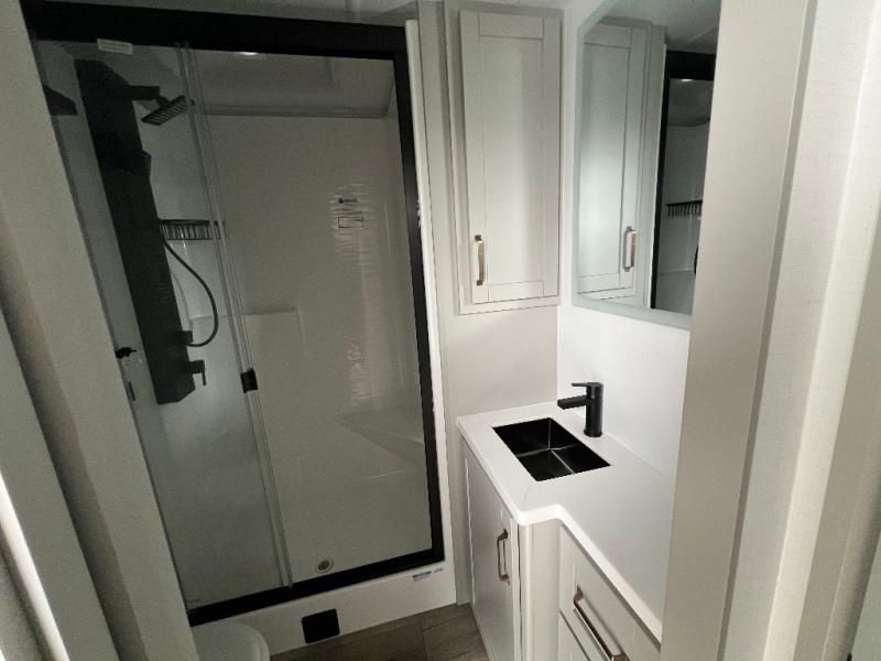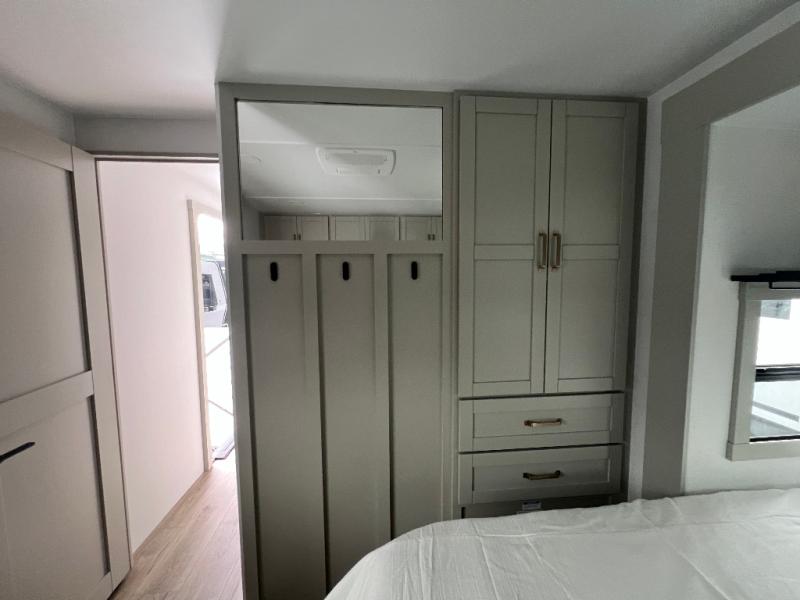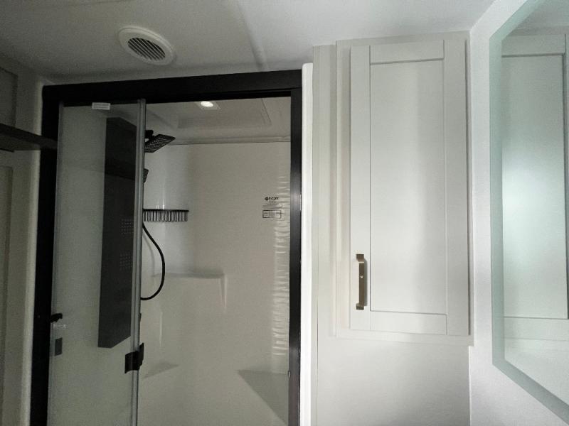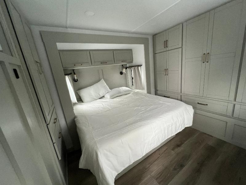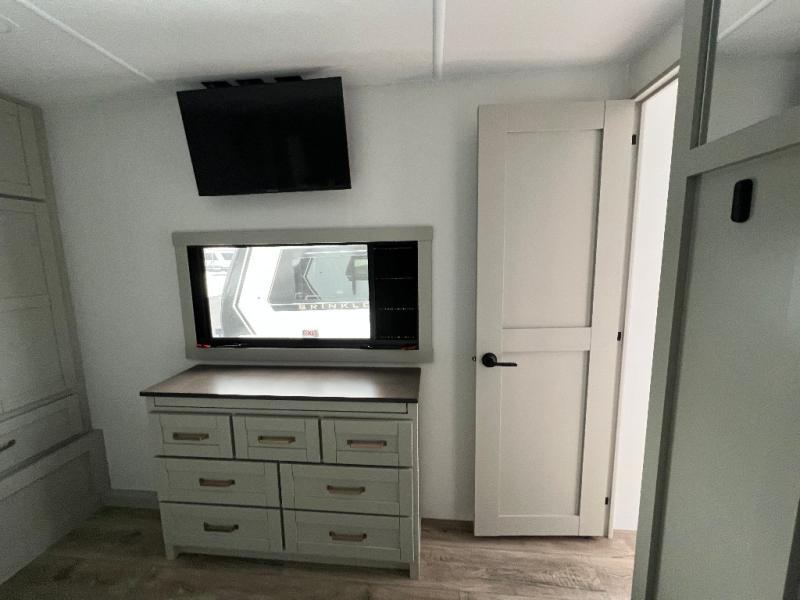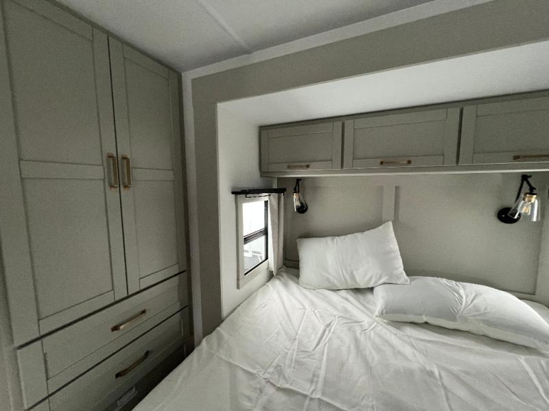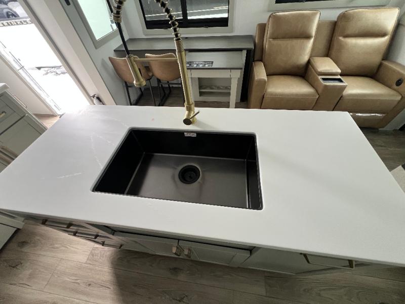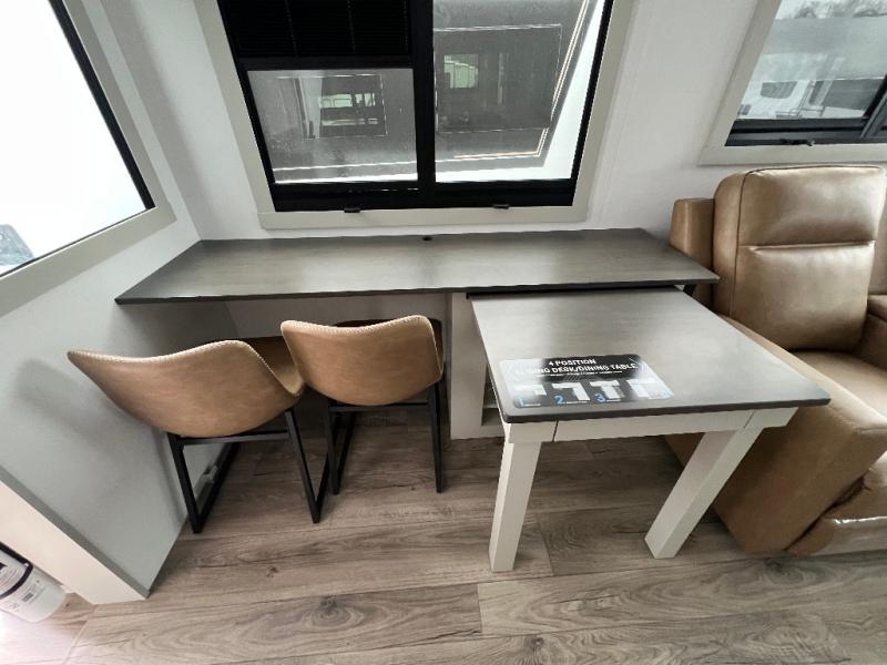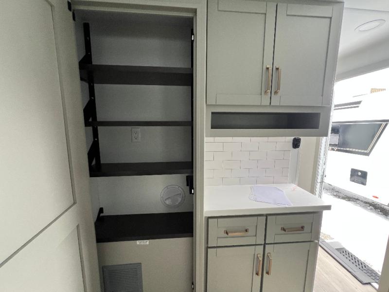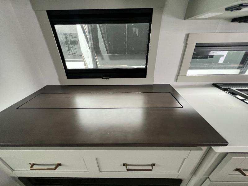 You will love all the space and features in this travel trailer! A luxurious rear living room offers plenty of room to spread out, with a 72" tri-fold sofa plus theater seats, all arranged with a perfect view of the 42" TV over the fireplace. A central kitchen area includes an island with hidden pet bowls. Find even more storage with the hutch plus pantry with adjustable shelves. The front bedroom comes with a queen bed, but if you'd like you can upgrade to a king for even more room. No matter which you choose, you will enjoy watching the 32" bedroom TV. The full-width wardrobe has room for all of your clothes and also includes prep for an optional washer and dryer. And the full bath includes a 30" x 42" one-piece fiberglass shower. Outside you'll enjoy two awnings, pass-through storage, and LED ground lighting.