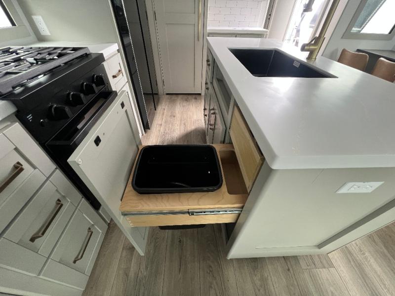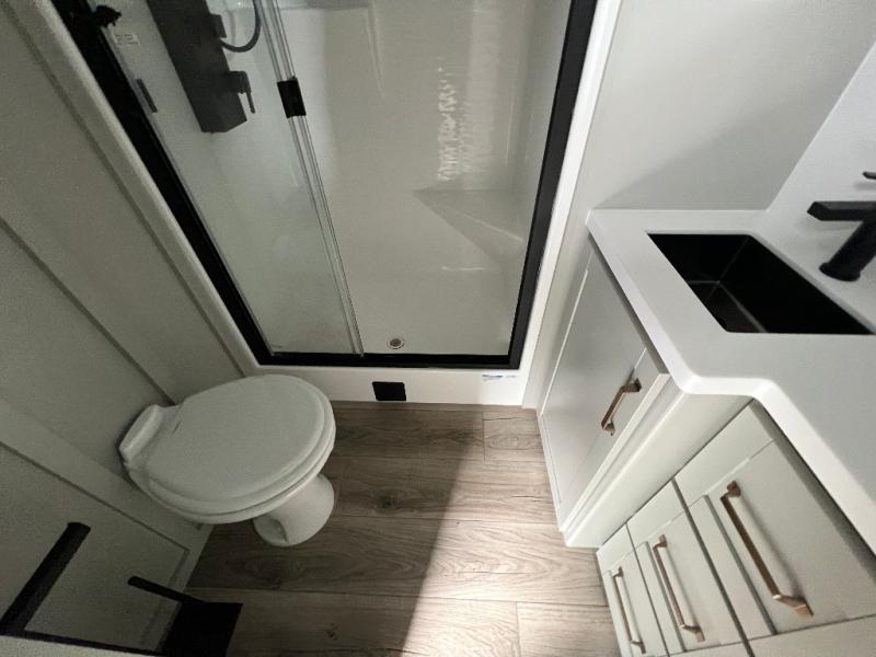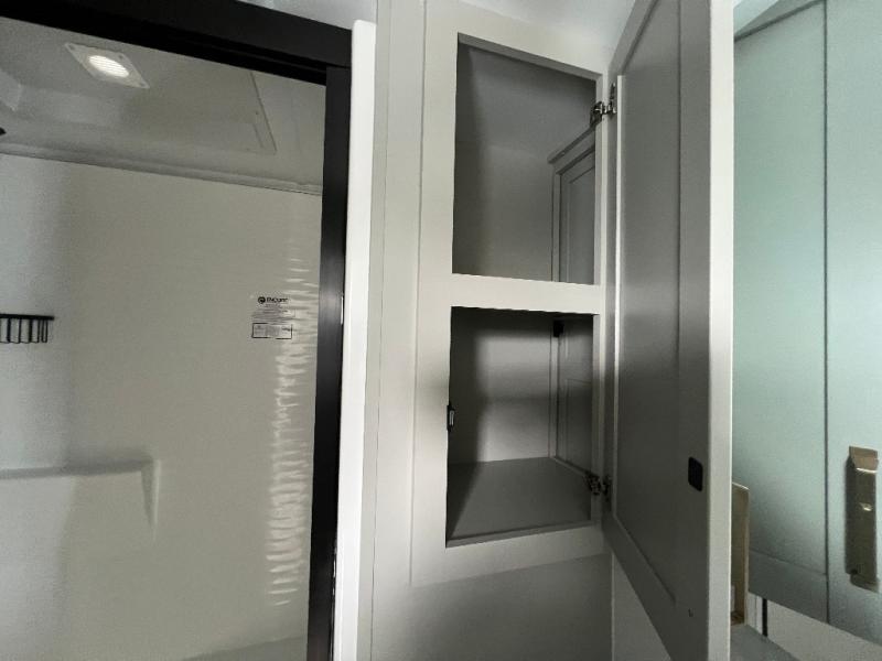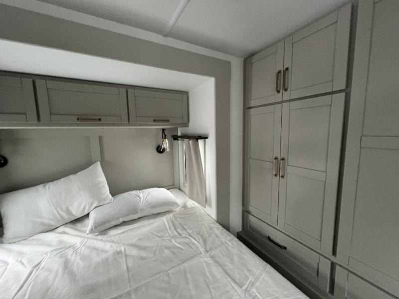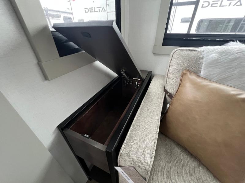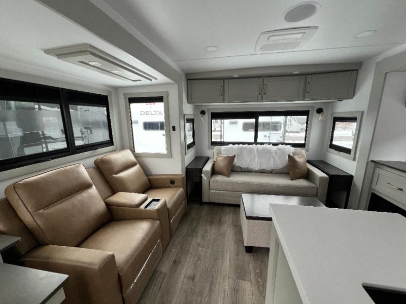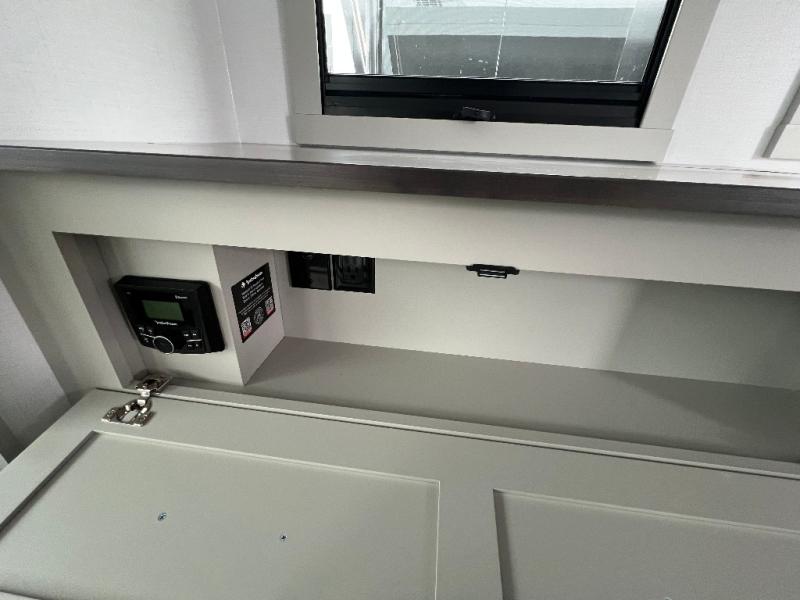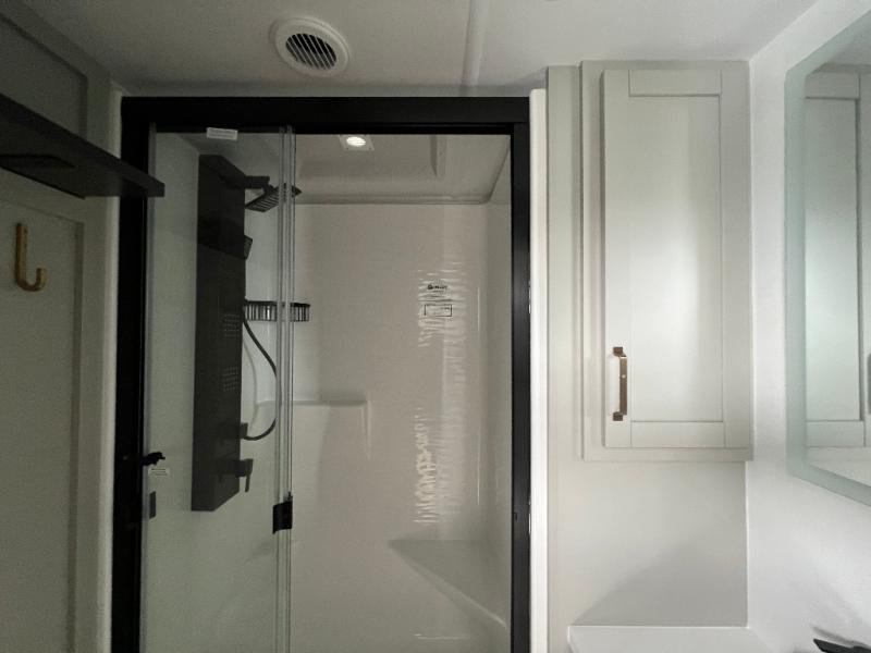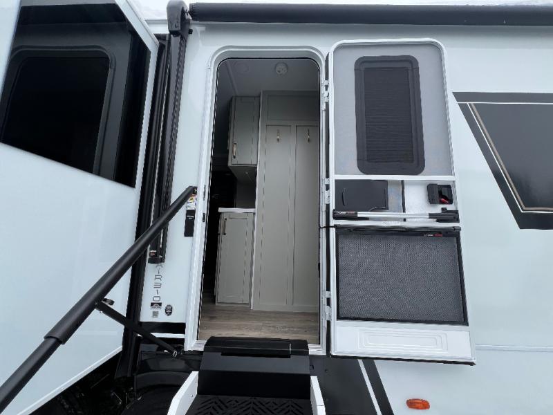 You will love all the space and features in this travel trailer! A luxurious rear living room offers plenty of room to spread out, with a 72" tri-fold sofa plus theater seats, all arranged with a perfect view of the 42" TV over the fireplace. A central kitchen area includes an island with hidden pet bowls. Find even more storage with the hutch plus pantry with adjustable shelves. The front bedroom comes with a queen bed, but if you'd like you can upgrade to a king for even more room. No matter which you choose, you will enjoy watching the 32" bedroom TV. The full-width wardrobe has room for all of your clothes and also includes prep for an optional washer and dryer. And the full bath includes a 30" x 42" one-piece fiberglass shower. Outside you'll enjoy two awnings, pass-through storage, and LED ground lighting.