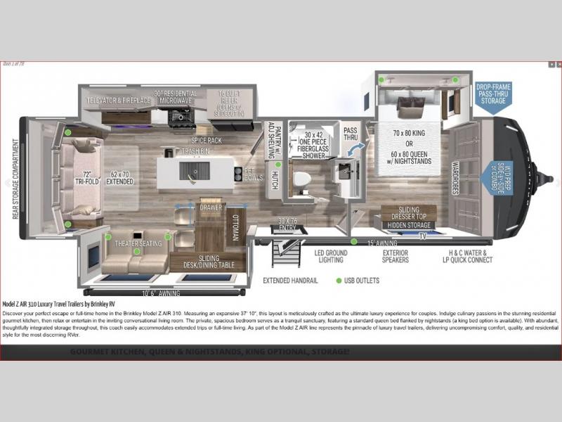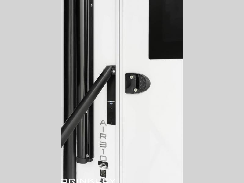 With any Model Z Air travel trailer by Brinkley, you will enjoy premium features at every turn. The industry-first low maintenance roof is sure to be appreciated, plus there are industry-first brass plumbing connections for excellent resistance to corrosion. The drop-frame chassis with over 100 cu. ft. of exterior storage will allow you to bring along camp gear galore, plus there are motion lighting and power outlets for added convenience! You'll also find two hot/cold showers outdoors, along with a 370-watt solar panel, a custom LP box with locked battery storage, and a premium utility center with a retractable 65' water hose to wash off mud from the lake. The interior is just as accommodating with its solid surface countertops, Brinkley CraftSense wood trim construction, integrated window screens and insulated blackout blinds, and the list of luxury features goes on!