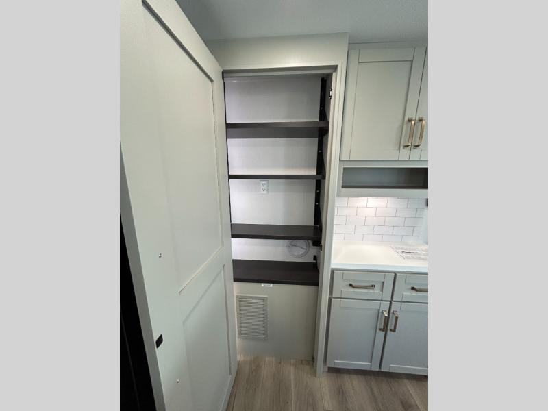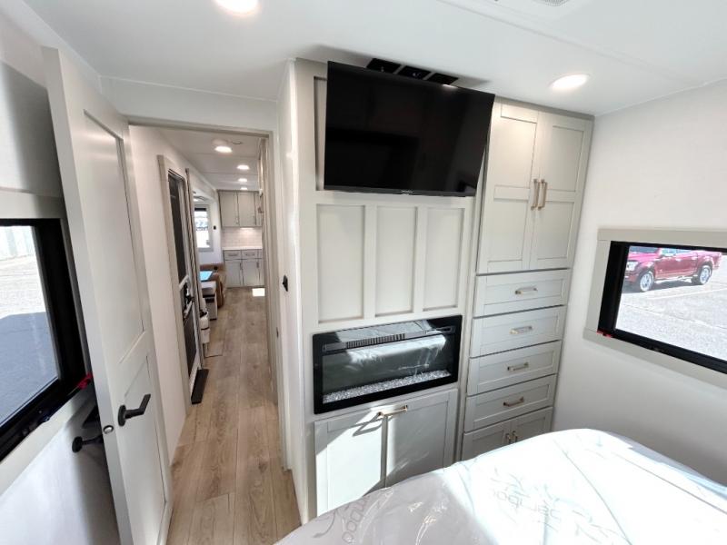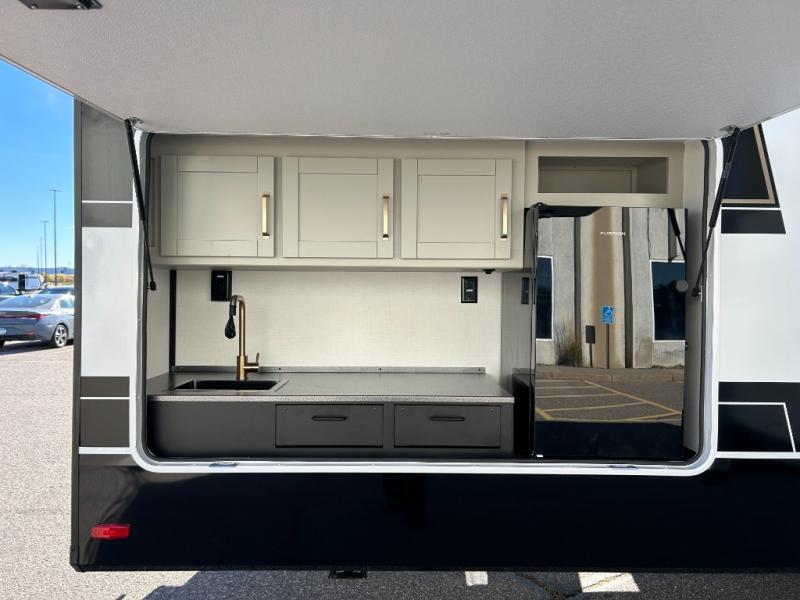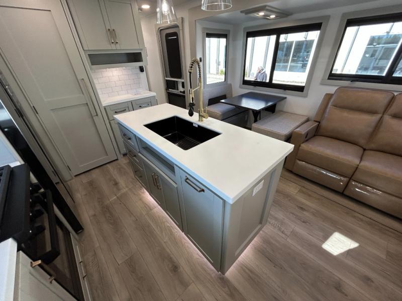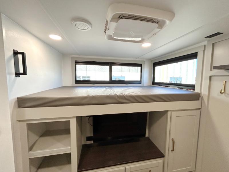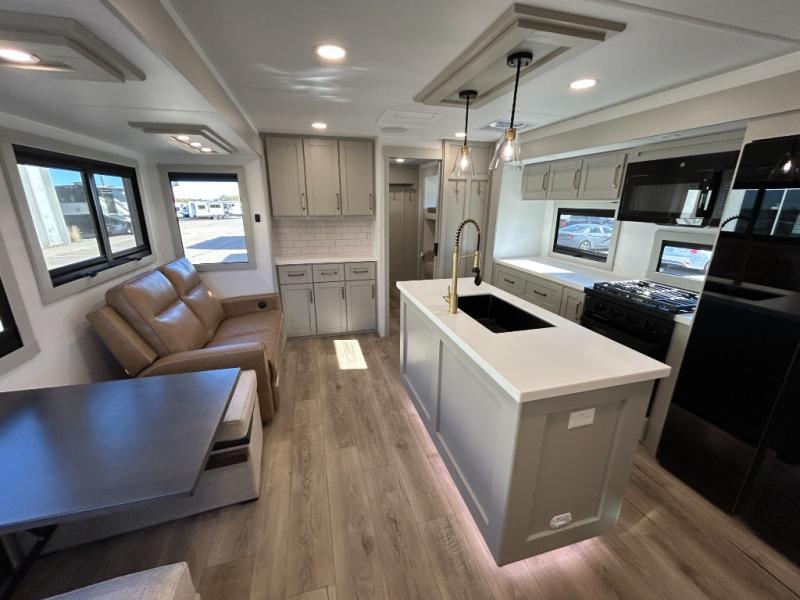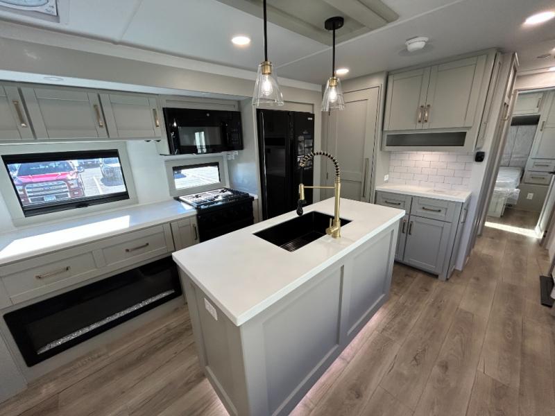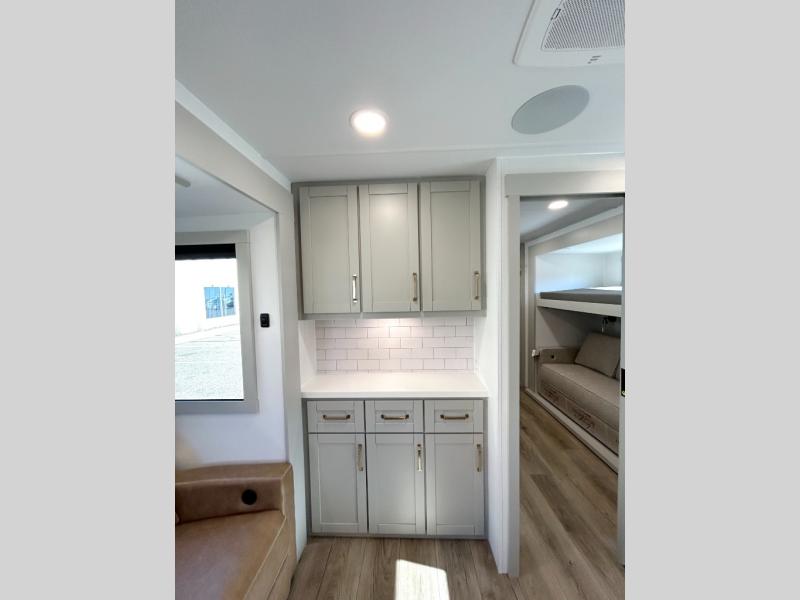 The whole gang will love camping in this spacious travel trailer for six to seven! Your guests or little ones will have the rear bunkhouse all to themselves, which includes a tri-fold sofa with a reclining back, a flip-up bunk, plus a second bunk bed across the room for even more sleeping space. There is even a bunkroom 42" Smart TV with a wardrobe for entertainment and storage! The front private bedroom includes a walk-around queen bed with four under-bed drawers for clothes, extra blankets and more. Head to the combined kitchen and living room to prep dinner on the kitchen island, relax on the theater seating, and dine at the sleeper dinette. There is also a pantry with adjustable shelves here, along with a hutch, 16 cu. ft. refrigerator that opens with the slide out, plus a televator and fireplace to make your space feel more like home! Outside, you'll find two power awnings, LED ground lighting, drop-frame pass-thru storage, and an outdoor kitchen with a refrigerator, sink, and storage!