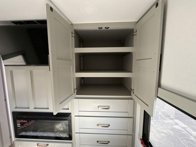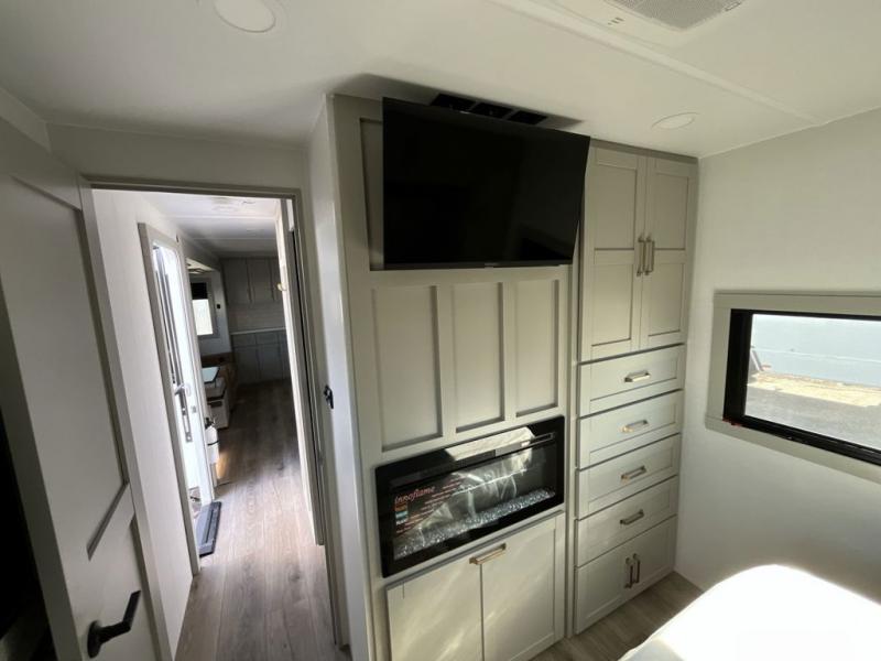 The whole gang will love camping in this spacious travel trailer for six to seven! Your guests or little ones will have the rear bunkhouse all to themselves, which includes a tri-fold sofa with a reclining back, a flip-up bunk, plus a second bunk bed across the room for even more sleeping space. There is even a bunkroom 42" Smart TV with a wardrobe for entertainment and storage! The front private bedroom includes a walk-around queen bed with four under-bed drawers for clothes, extra blankets and more. Head to the combined kitchen and living room to prep dinner on the kitchen island, relax on the theater seating, and dine at the sleeper dinette. There is also a pantry with adjustable shelves here, along with a hutch, 16 cu. ft. refrigerator that opens with the slide out, plus a televator and fireplace to make your space feel more like home! Outside, you'll find two power awnings, LED ground lighting, drop-frame pass-thru storage, and an outdoor kitchen with a refrigerator, sink, and storage!