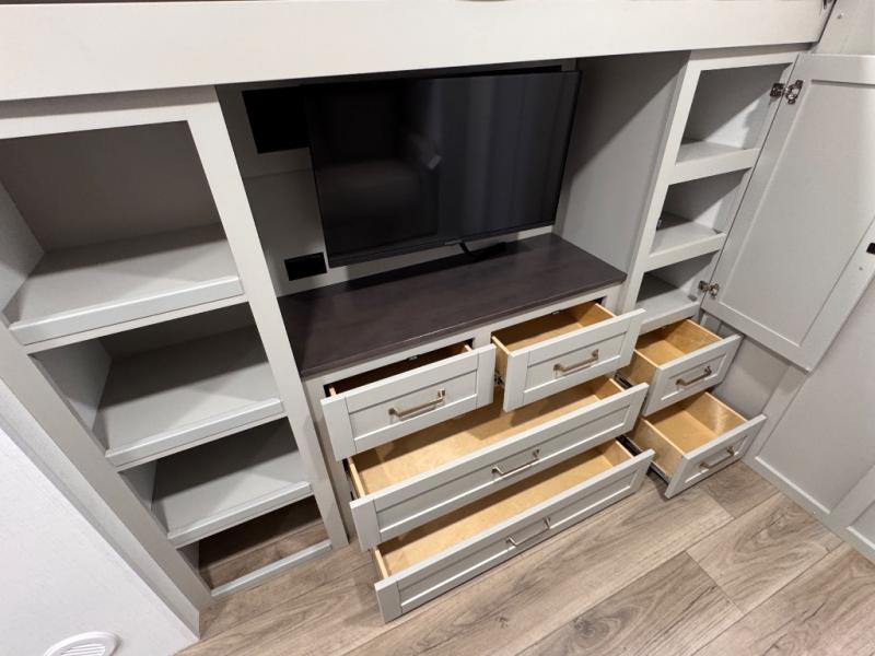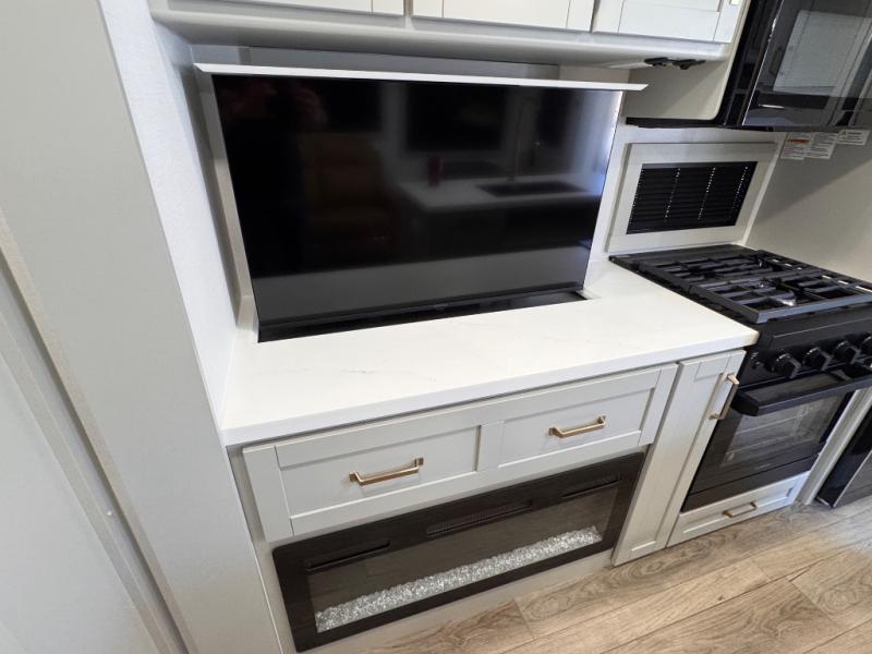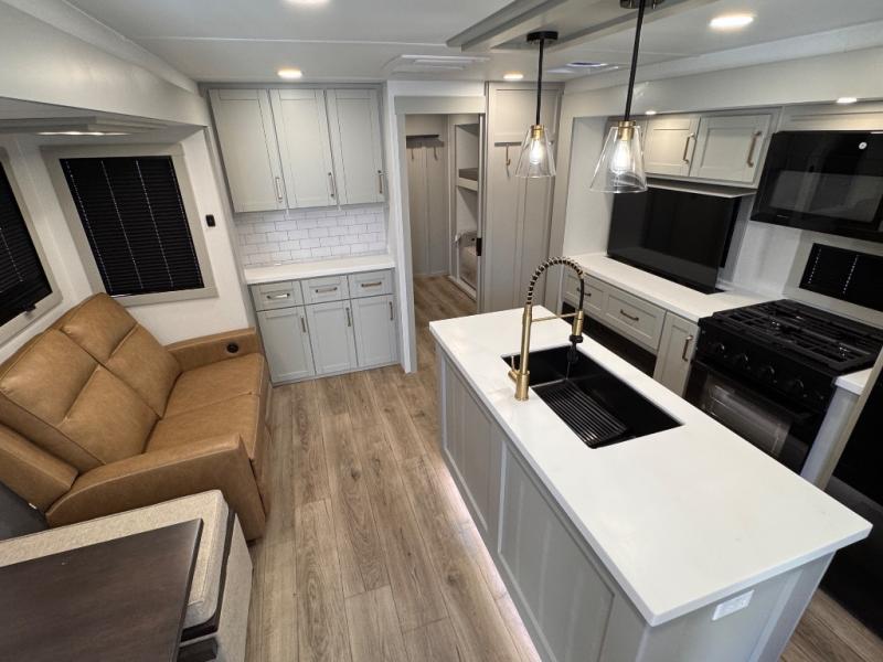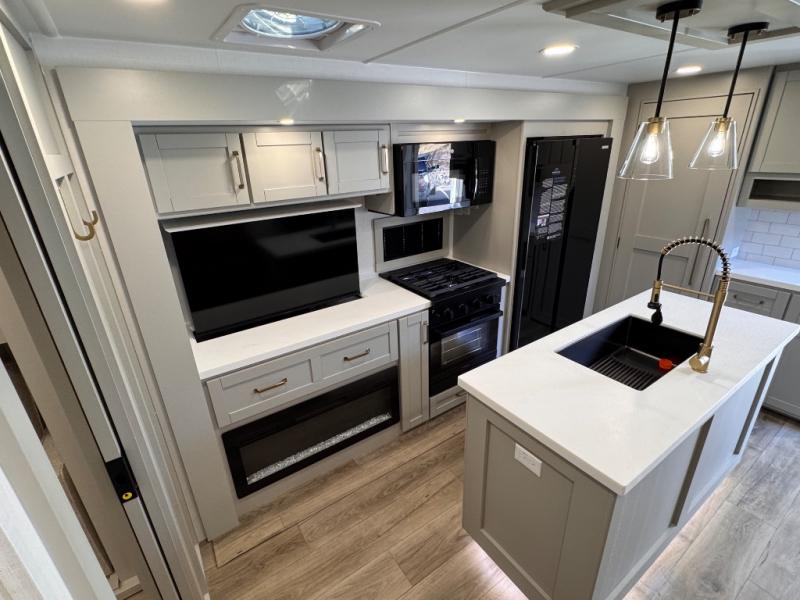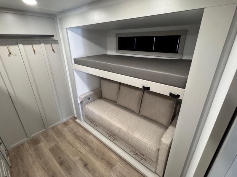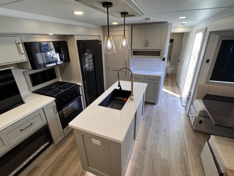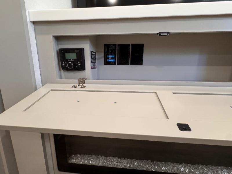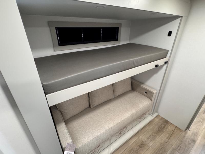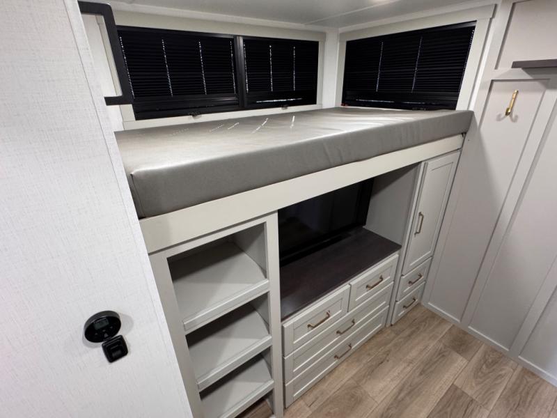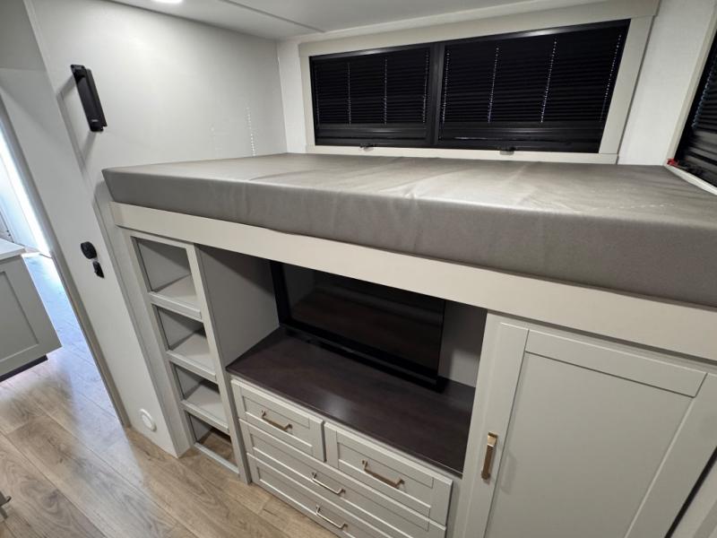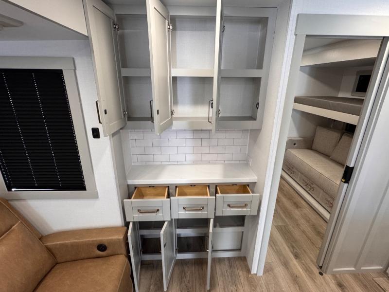 The whole gang will love camping in this spacious travel trailer for six to seven! Your guests or little ones will have the rear bunkhouse all to themselves, which includes a tri-fold sofa with a reclining back, a flip-up bunk, plus a second bunk bed across the room for even more sleeping space. There is even a bunkroom 42" Smart TV with a wardrobe for entertainment and storage! The front private bedroom includes a walk-around queen bed with four under-bed drawers for clothes, extra blankets and more. Head to the combined kitchen and living room to prep dinner on the kitchen island, relax on the theater seating, and dine at the sleeper dinette. There is also a pantry with adjustable shelves here, along with a hutch, 16 cu. ft. refrigerator that opens with the slide out, plus a televator and fireplace to make your space feel more like home! Outside, you'll find two power awnings, LED ground lighting, drop-frame pass-thru storage, and an outdoor kitchen with a refrigerator, sink, and storage!