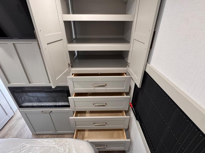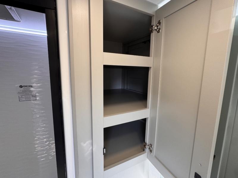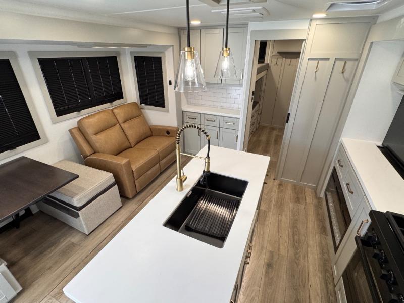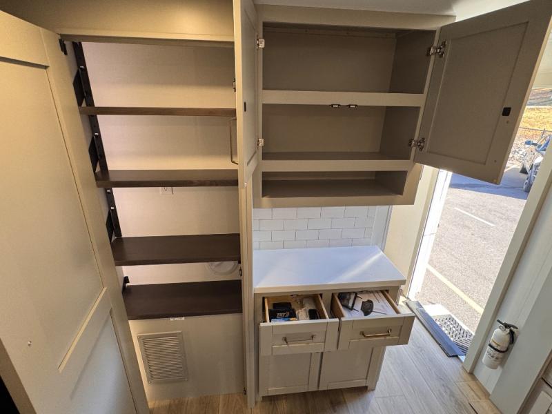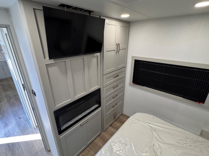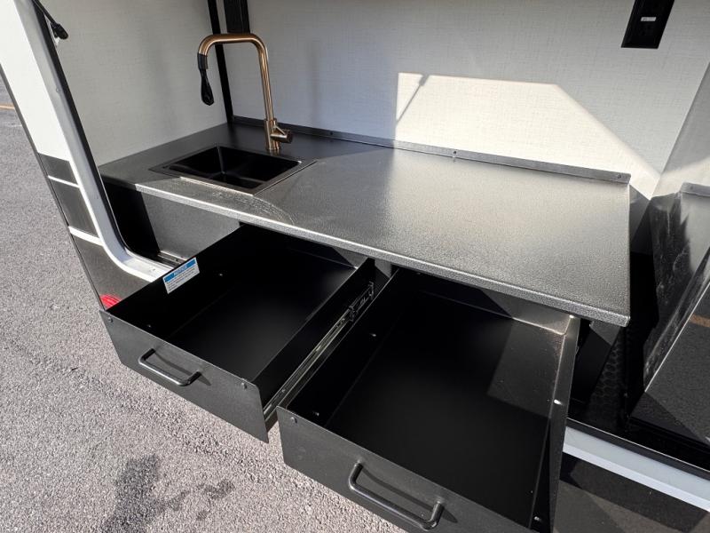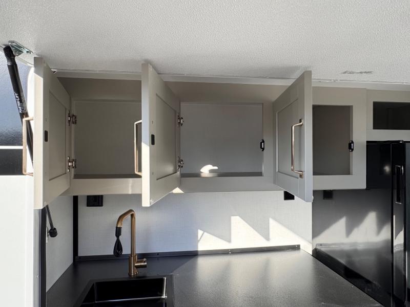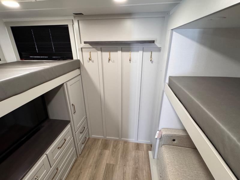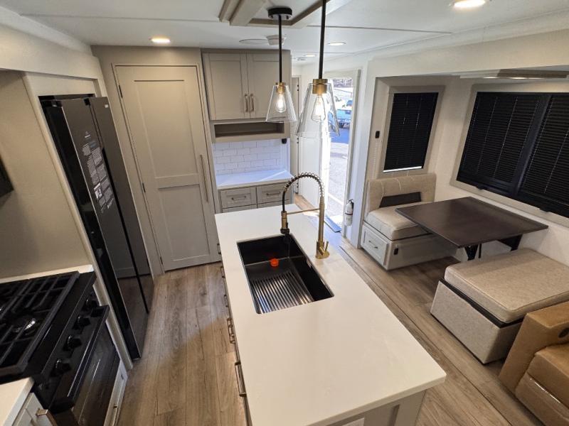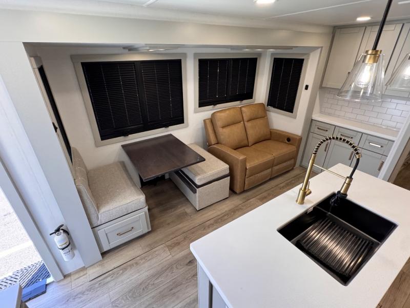 The whole gang will love camping in this spacious travel trailer for six to seven! Your guests or little ones will have the rear bunkhouse all to themselves, which includes a tri-fold sofa with a reclining back, a flip-up bunk, plus a second bunk bed across the room for even more sleeping space. There is even a bunkroom 42" Smart TV with a wardrobe for entertainment and storage! The front private bedroom includes a walk-around queen bed with four under-bed drawers for clothes, extra blankets and more. Head to the combined kitchen and living room to prep dinner on the kitchen island, relax on the theater seating, and dine at the sleeper dinette. There is also a pantry with adjustable shelves here, along with a hutch, 16 cu. ft. refrigerator that opens with the slide out, plus a televator and fireplace to make your space feel more like home! Outside, you'll find two power awnings, LED ground lighting, drop-frame pass-thru storage, and an outdoor kitchen with a refrigerator, sink, and storage!