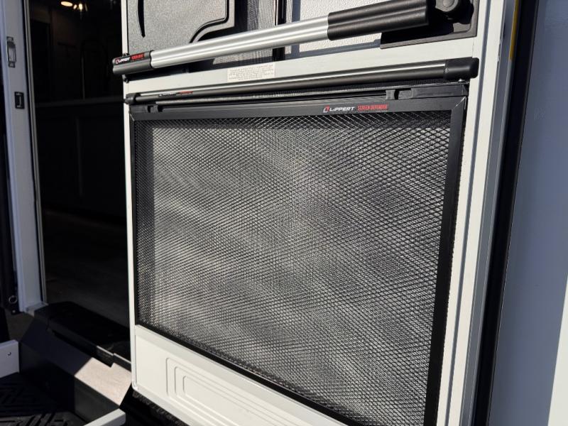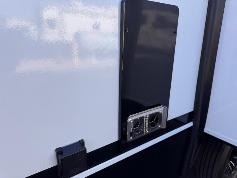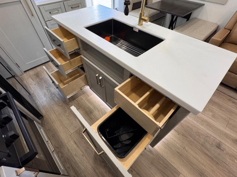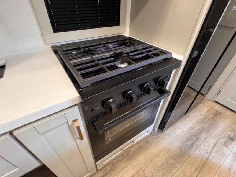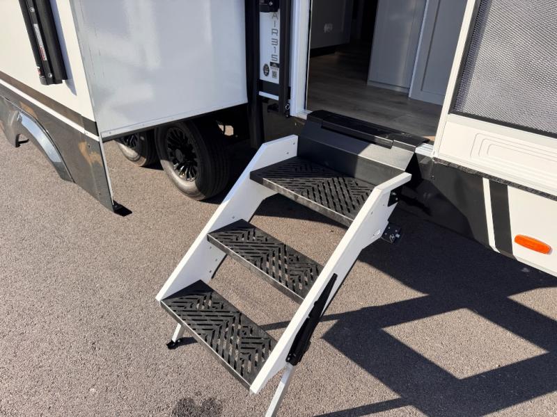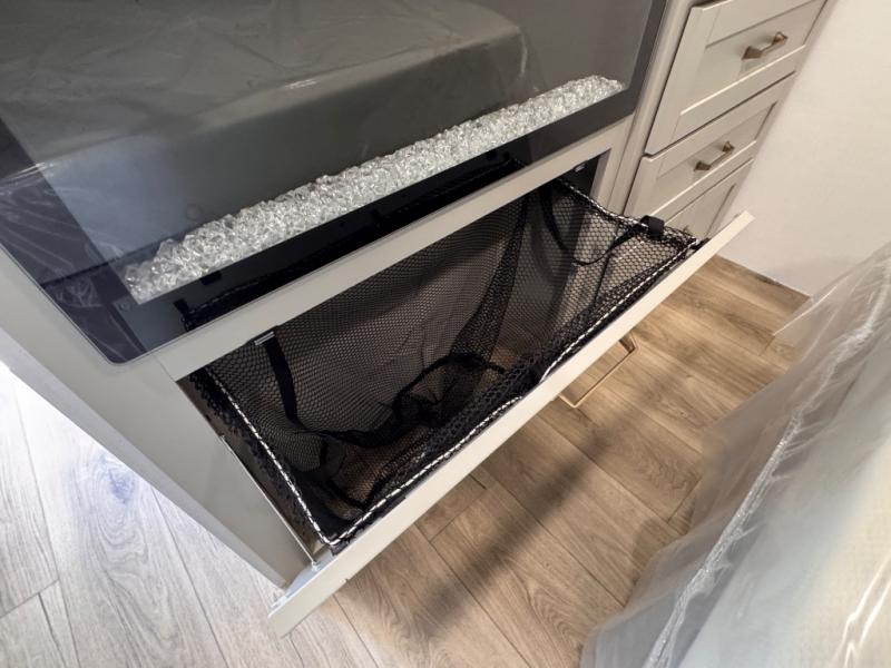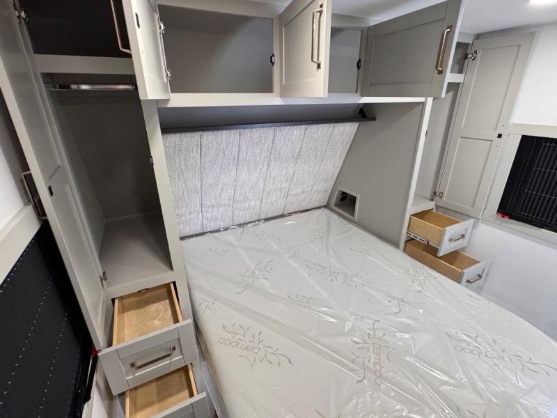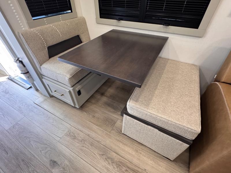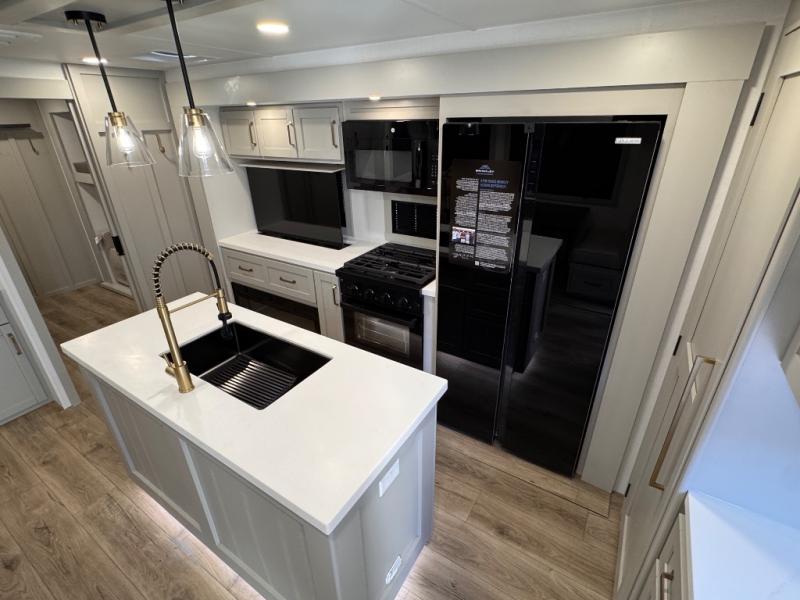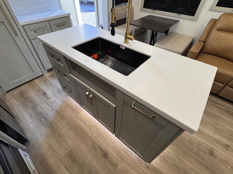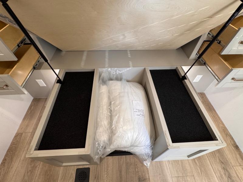 The whole gang will love camping in this spacious travel trailer for six to seven! Your guests or little ones will have the rear bunkhouse all to themselves, which includes a tri-fold sofa with a reclining back, a flip-up bunk, plus a second bunk bed across the room for even more sleeping space. There is even a bunkroom 42" Smart TV with a wardrobe for entertainment and storage! The front private bedroom includes a walk-around queen bed with four under-bed drawers for clothes, extra blankets and more. Head to the combined kitchen and living room to prep dinner on the kitchen island, relax on the theater seating, and dine at the sleeper dinette. There is also a pantry with adjustable shelves here, along with a hutch, 16 cu. ft. refrigerator that opens with the slide out, plus a televator and fireplace to make your space feel more like home! Outside, you'll find two power awnings, LED ground lighting, drop-frame pass-thru storage, and an outdoor kitchen with a refrigerator, sink, and storage!