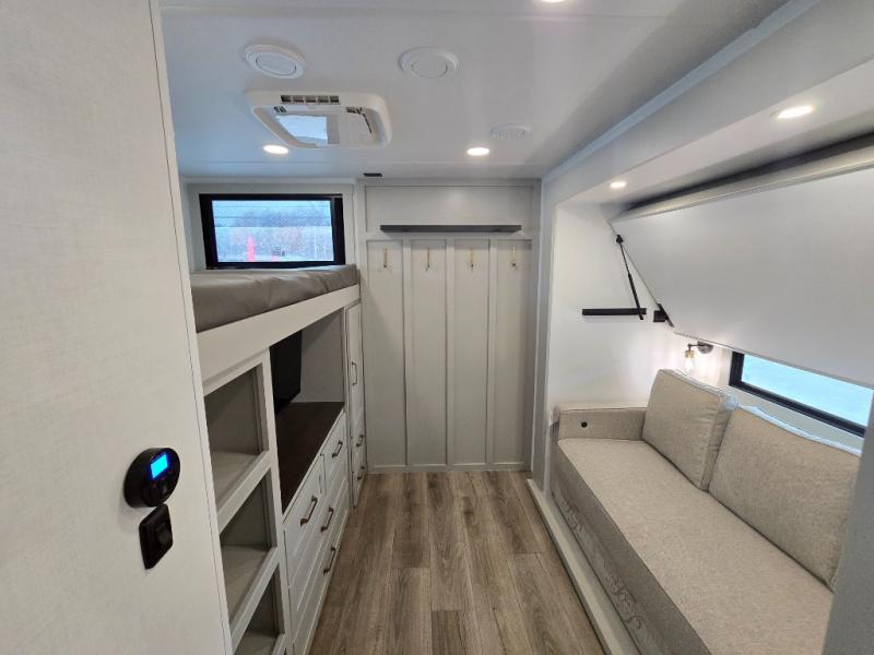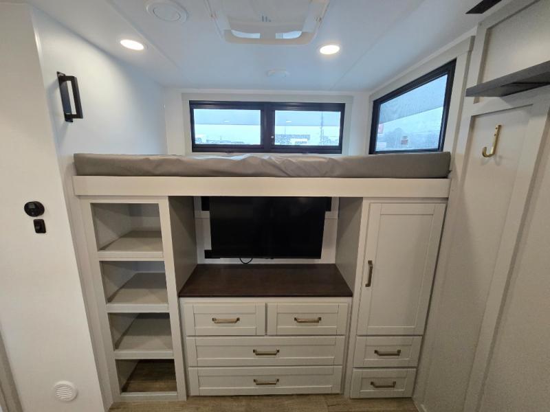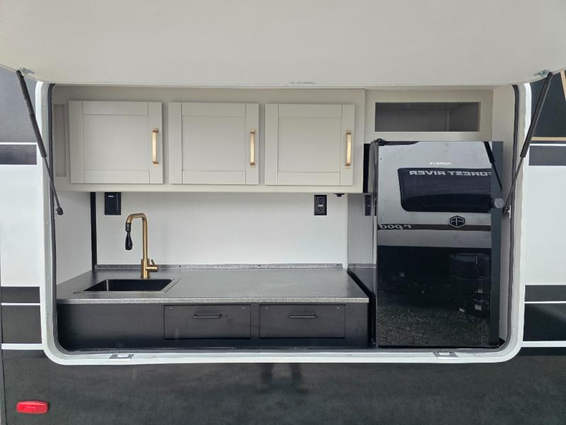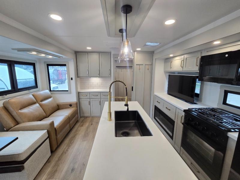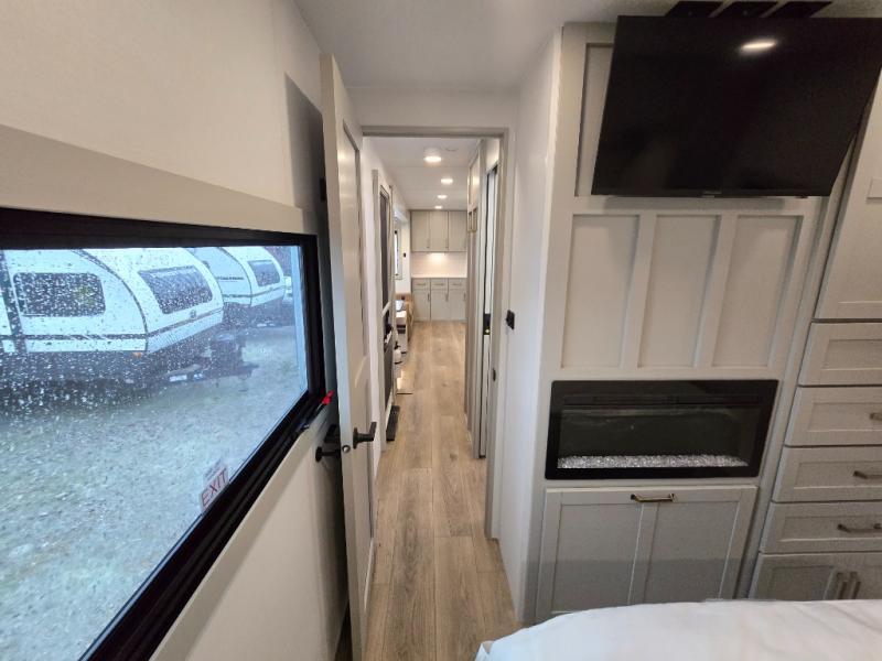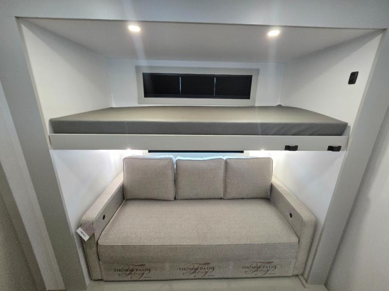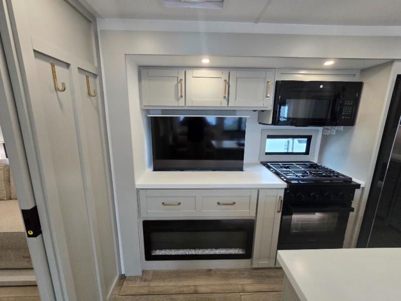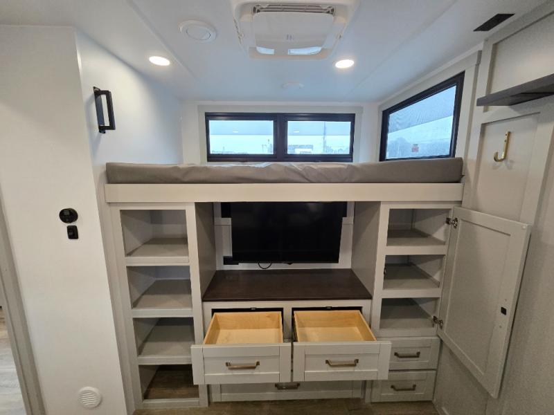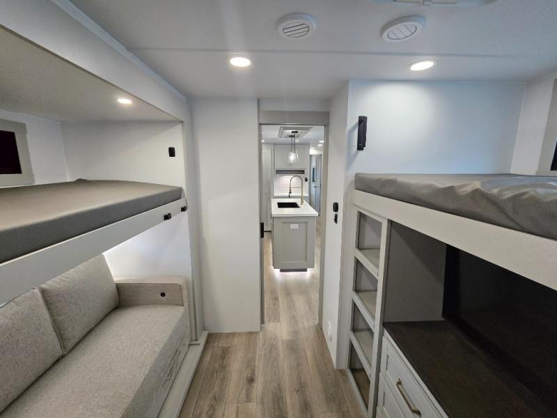 The whole gang will love camping in this spacious travel trailer for six to seven! Your guests or little ones will have the rear bunkhouse all to themselves, which includes a tri-fold sofa with a reclining back, a flip-up bunk, plus a second bunk bed across the room for even more sleeping space. There is even a bunkroom 42" Smart TV with a wardrobe for entertainment and storage! The front private bedroom includes a walk-around queen bed with four under-bed drawers for clothes, extra blankets and more. Head to the combined kitchen and living room to prep dinner on the kitchen island, relax on the theater seating, and dine at the sleeper dinette. There is also a pantry with adjustable shelves here, along with a hutch, 16 cu. ft. refrigerator that opens with the slide out, plus a televator and fireplace to make your space feel more like home! Outside, you'll find two power awnings, LED ground lighting, drop-frame pass-thru storage, and an outdoor kitchen with a refrigerator, sink, and storage!