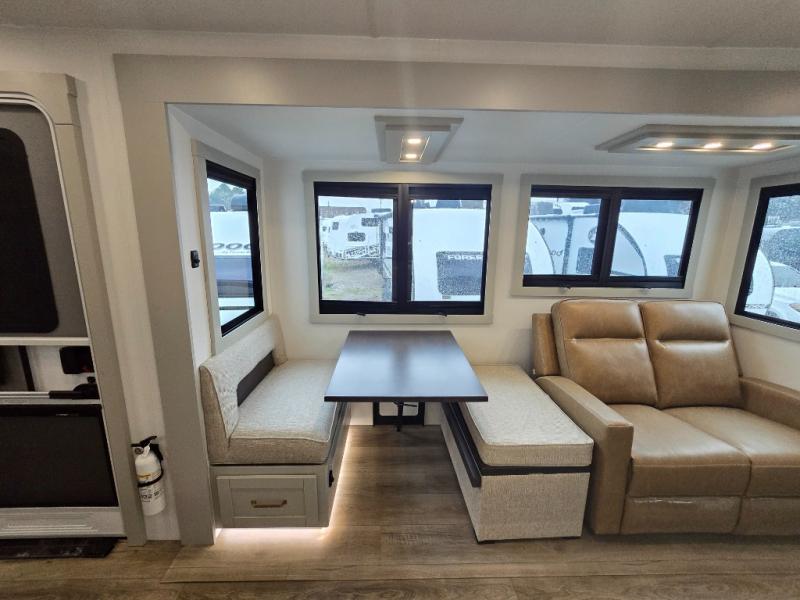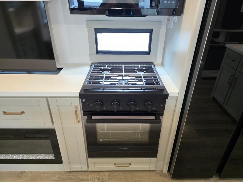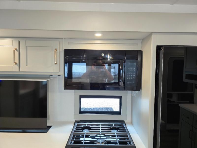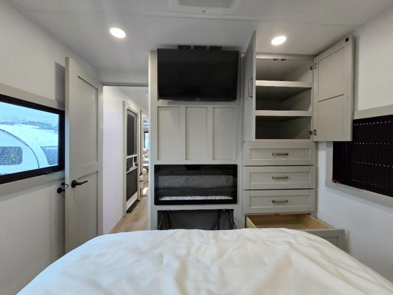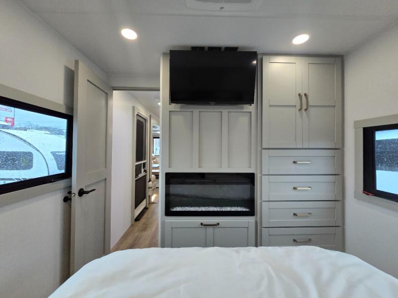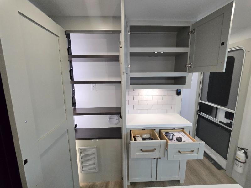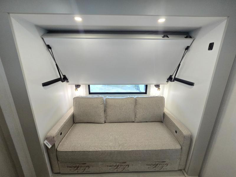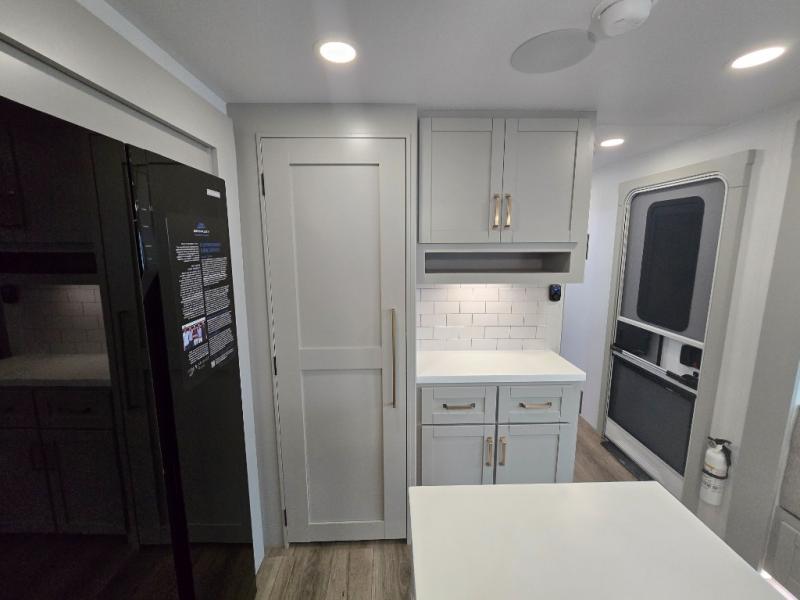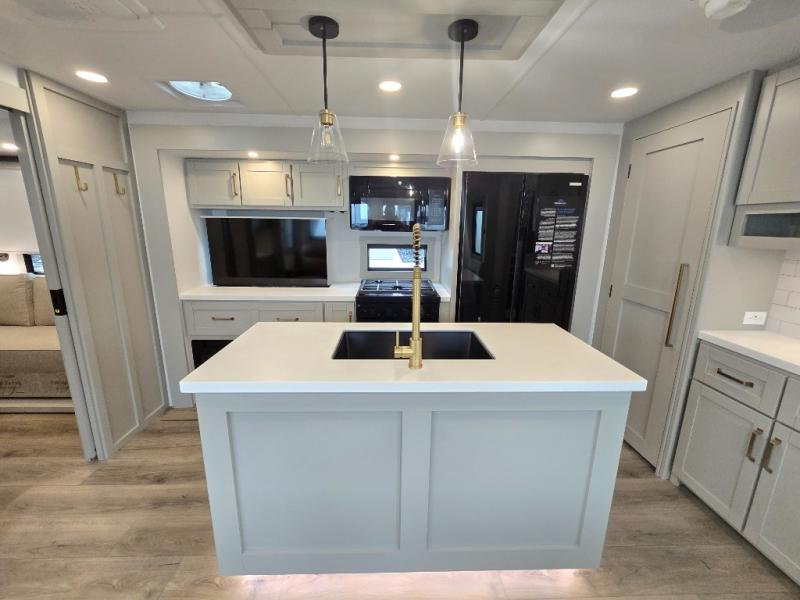 The whole gang will love camping in this spacious travel trailer for six to seven! Your guests or little ones will have the rear bunkhouse all to themselves, which includes a tri-fold sofa with a reclining back, a flip-up bunk, plus a second bunk bed across the room for even more sleeping space. There is even a bunkroom 42" Smart TV with a wardrobe for entertainment and storage! The front private bedroom includes a walk-around queen bed with four under-bed drawers for clothes, extra blankets and more. Head to the combined kitchen and living room to prep dinner on the kitchen island, relax on the theater seating, and dine at the sleeper dinette. There is also a pantry with adjustable shelves here, along with a hutch, 16 cu. ft. refrigerator that opens with the slide out, plus a televator and fireplace to make your space feel more like home! Outside, you'll find two power awnings, LED ground lighting, drop-frame pass-thru storage, and an outdoor kitchen with a refrigerator, sink, and storage!