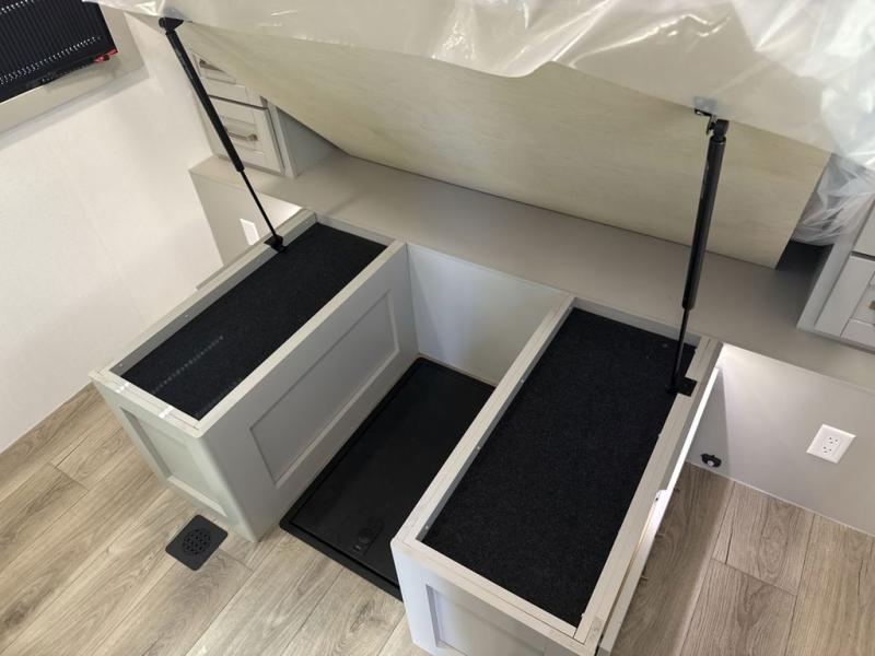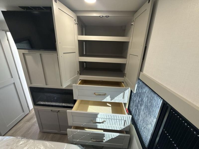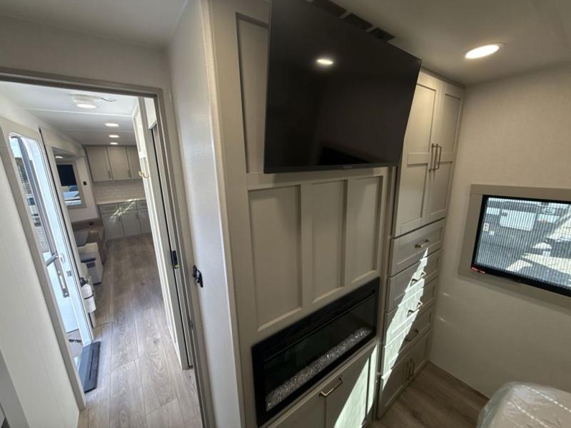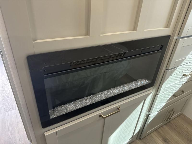 The whole gang will love camping in this spacious travel trailer for six to seven! Your guests or little ones will have the rear bunkhouse all to themselves, which includes a tri-fold sofa with a reclining back, a flip-up bunk, plus a second bunk bed across the room for even more sleeping space. There is even a bunkroom 42" Smart TV with a wardrobe for entertainment and storage! The front private bedroom includes a walk-around queen bed with four under-bed drawers for clothes, extra blankets and more. Head to the combined kitchen and living room to prep dinner on the kitchen island, relax on the theater seating, and dine at the sleeper dinette. There is also a pantry with adjustable shelves here, along with a hutch, 16 cu. ft. refrigerator that opens with the slide out, plus a televator and fireplace to make your space feel more like home! Outside, you'll find two power awnings, LED ground lighting, drop-frame pass-thru storage, and an outdoor kitchen with a refrigerator, sink, and storage!
