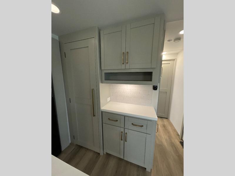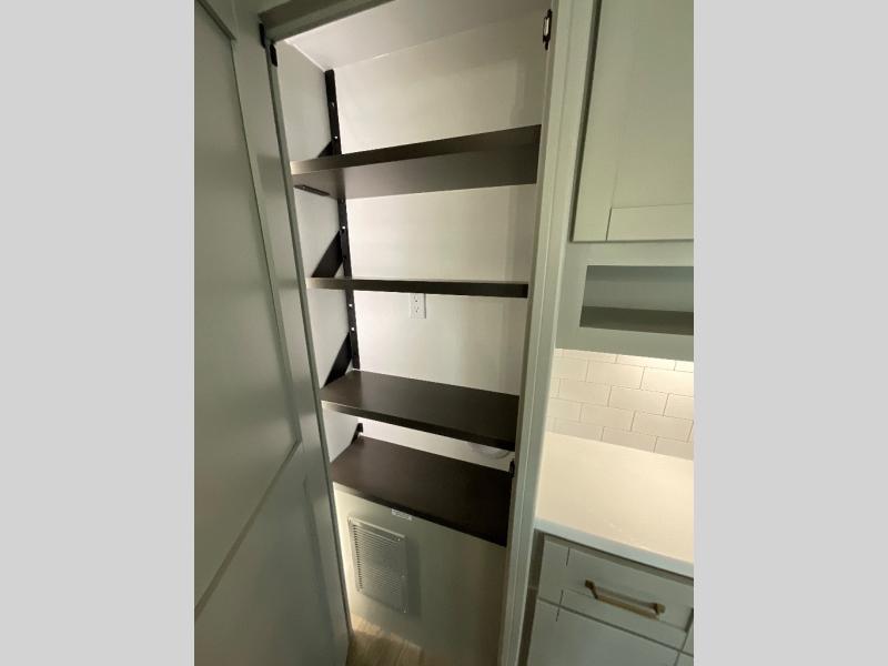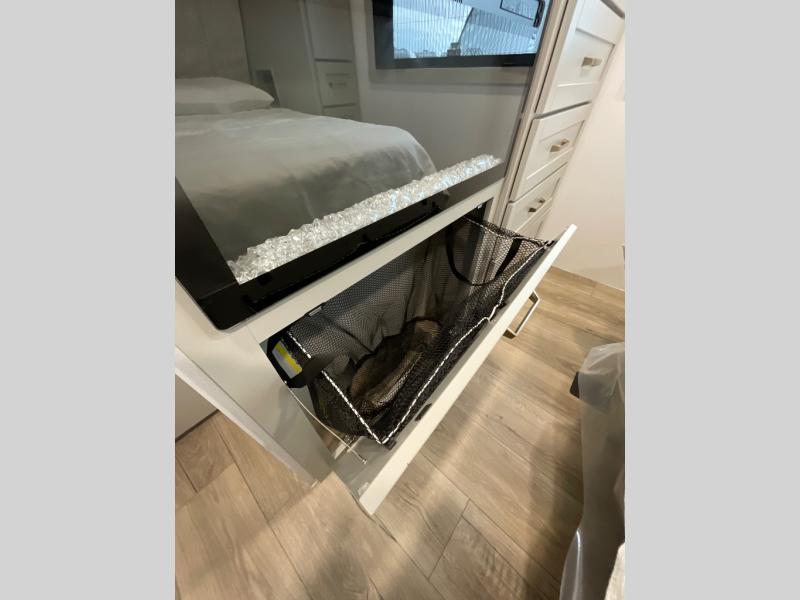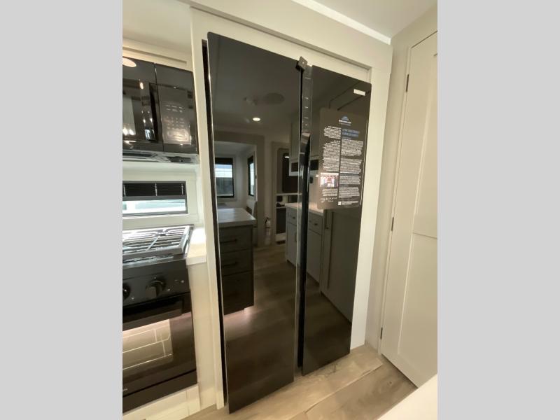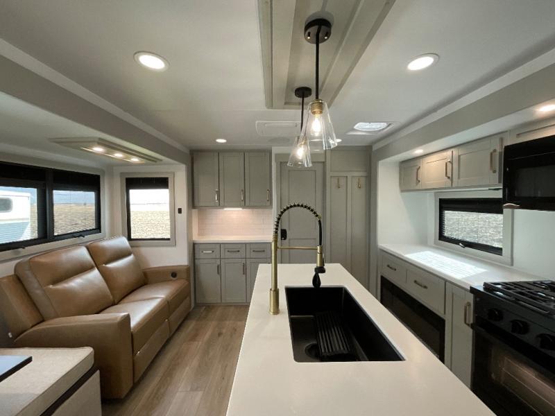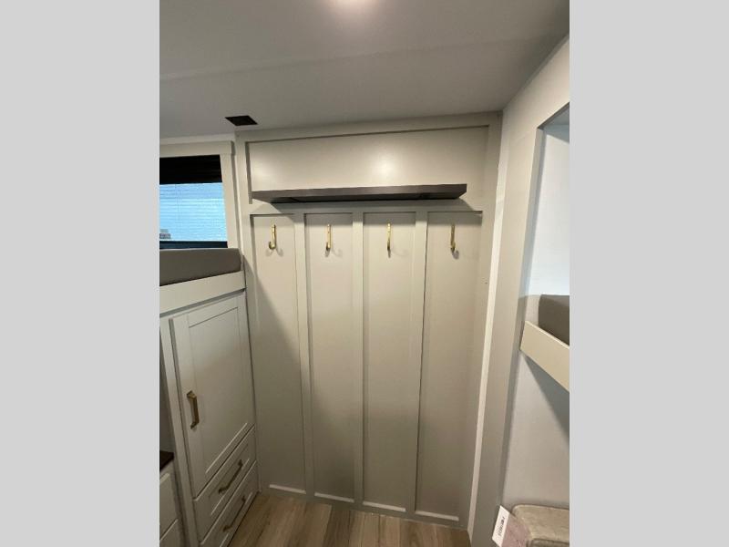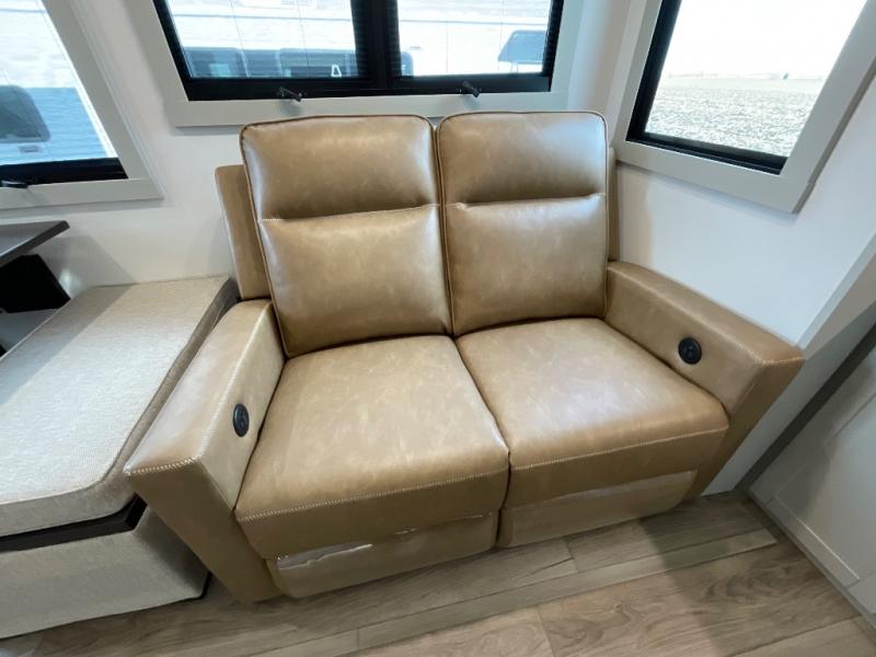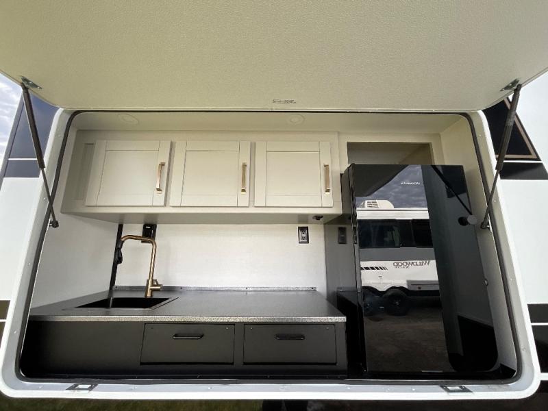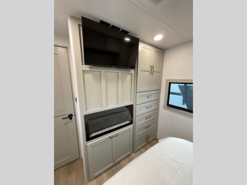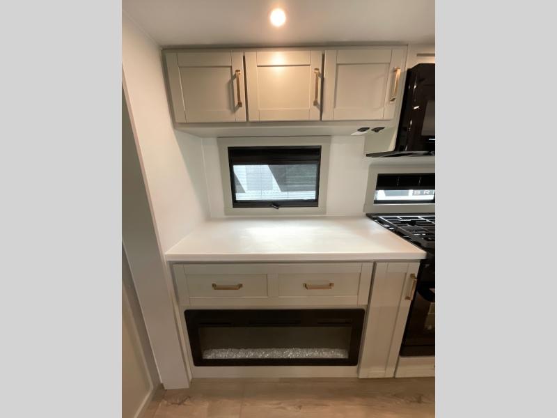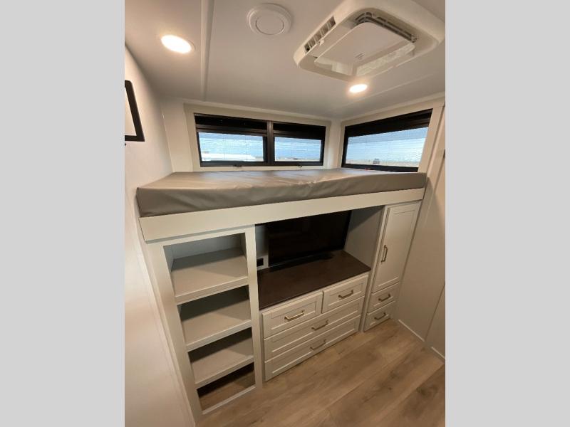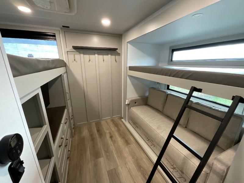 The whole gang will love camping in this spacious travel trailer for six to seven! Your guests or little ones will have the rear bunkhouse all to themselves, which includes a tri-fold sofa with a reclining back, a flip-up bunk, plus a second bunk bed across the room for even more sleeping space. There is even a bunkroom 42" Smart TV with a wardrobe for entertainment and storage! The front private bedroom includes a walk-around queen bed with four under-bed drawers for clothes, extra blankets and more. Head to the combined kitchen and living room to prep dinner on the kitchen island, relax on the theater seating, and dine at the sleeper dinette. There is also a pantry with adjustable shelves here, along with a hutch, 16 cu. ft. refrigerator that opens with the slide out, plus a televator and fireplace to make your space feel more like home! Outside, you'll find two power awnings, LED ground lighting, drop-frame pass-thru storage, and an outdoor kitchen with a refrigerator, sink, and storage!