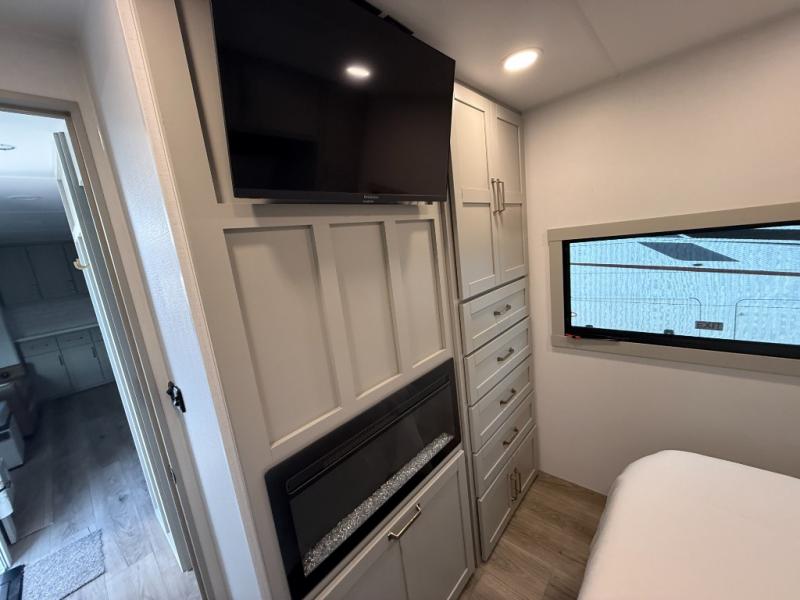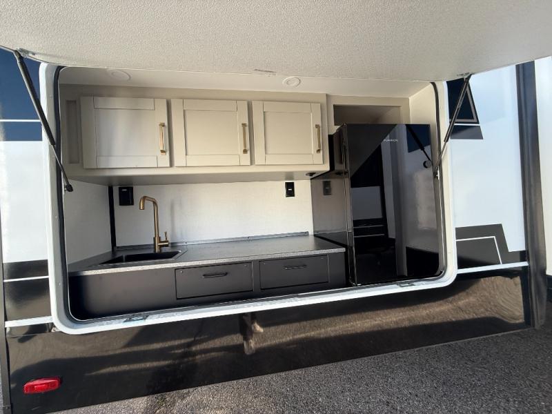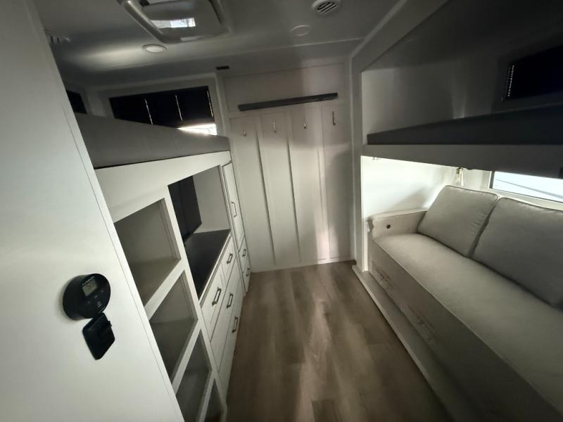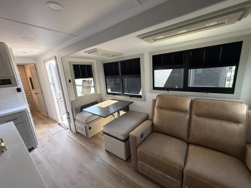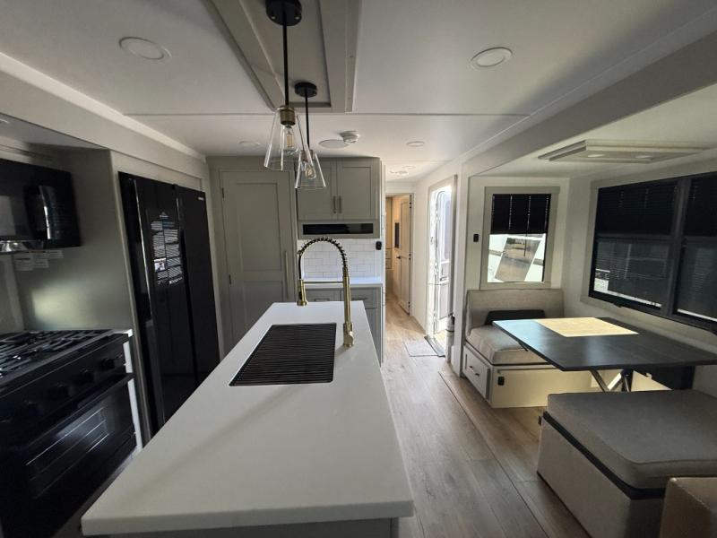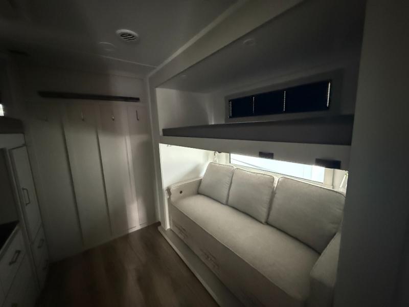 The whole gang will love camping in this spacious travel trailer for six to seven! Your guests or little ones will have the rear bunkhouse all to themselves, which includes a tri-fold sofa with a reclining back, a flip-up bunk, plus a second bunk bed across the room for even more sleeping space. There is even a bunkroom 42" Smart TV with a wardrobe for entertainment and storage! The front private bedroom includes a walk-around queen bed with four under-bed drawers for clothes, extra blankets and more. Head to the combined kitchen and living room to prep dinner on the kitchen island, relax on the theater seating, and dine at the sleeper dinette. There is also a pantry with adjustable shelves here, along with a hutch, 16 cu. ft. refrigerator that opens with the slide out, plus a televator and fireplace to make your space feel more like home! Outside, you'll find two power awnings, LED ground lighting, drop-frame pass-thru storage, and an outdoor kitchen with a refrigerator, sink, and storage!