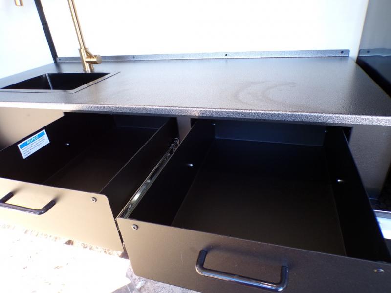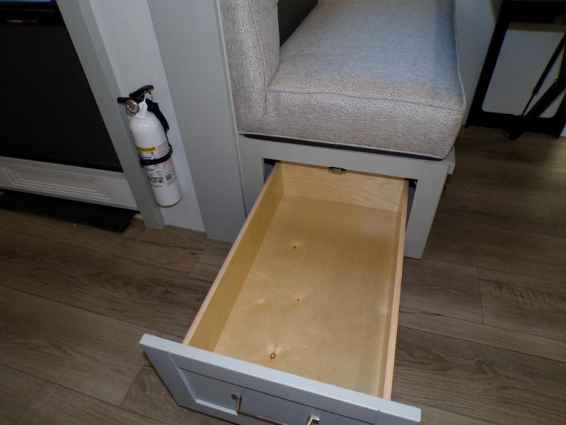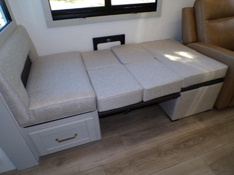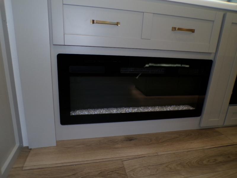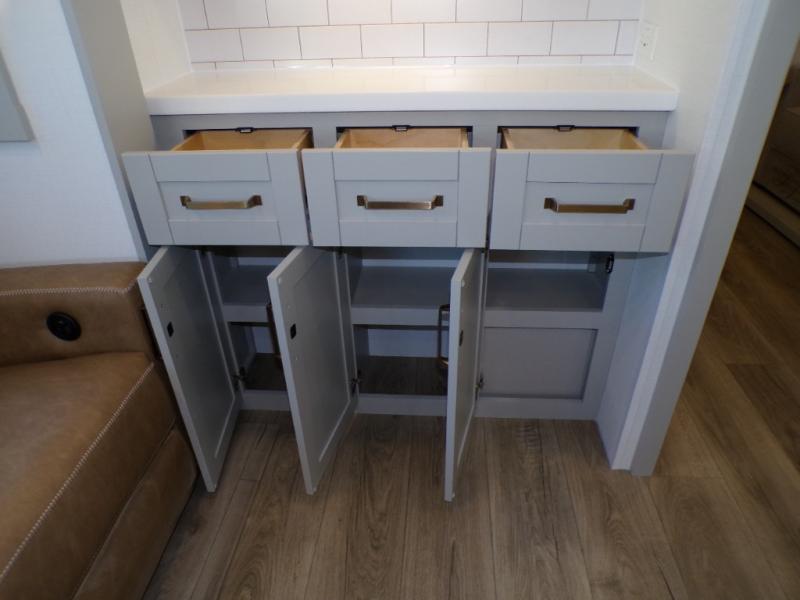 The whole gang will love camping in this spacious travel trailer for six to seven! Your guests or little ones will have the rear bunkhouse all to themselves, which includes a tri-fold sofa with a reclining back, a flip-up bunk, plus a second bunk bed across the room for even more sleeping space. There is even a bunkroom 42" Smart TV with a wardrobe for entertainment and storage! The front private bedroom includes a walk-around queen bed with four under-bed drawers for clothes, extra blankets and more. Head to the combined kitchen and living room to prep dinner on the kitchen island, relax on the theater seating, and dine at the sleeper dinette. There is also a pantry with adjustable shelves here, along with a hutch, 16 cu. ft. refrigerator that opens with the slide out, plus a televator and fireplace to make your space feel more like home! Outside, you'll find two power awnings, LED ground lighting, drop-frame pass-thru storage, and an outdoor kitchen with a refrigerator, sink, and storage!