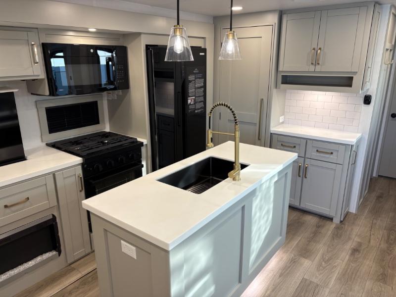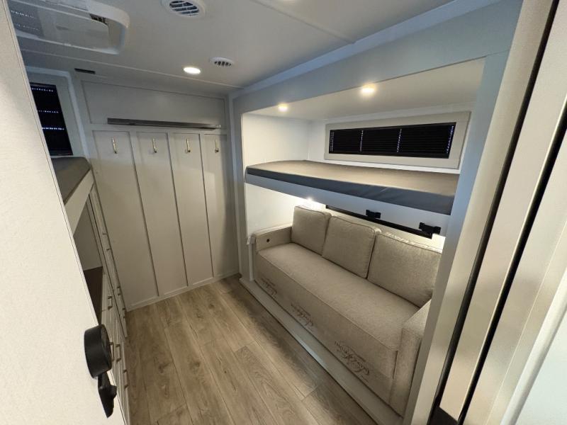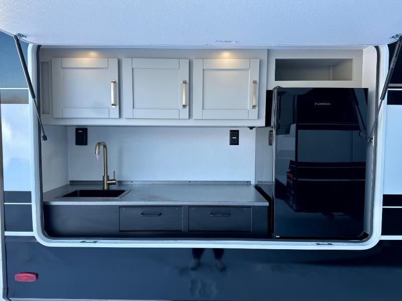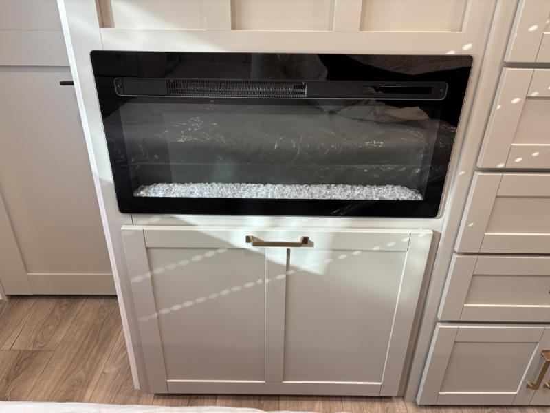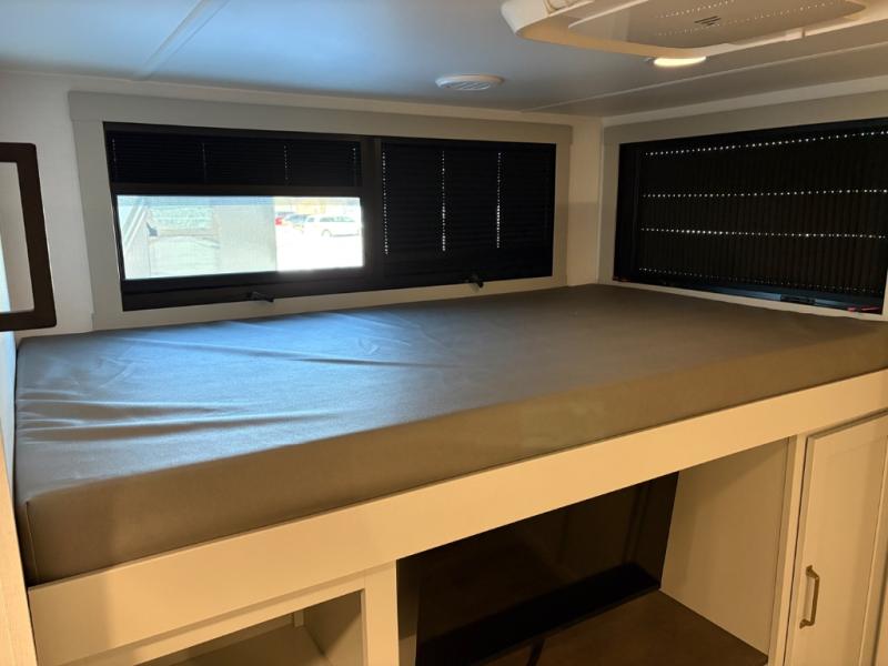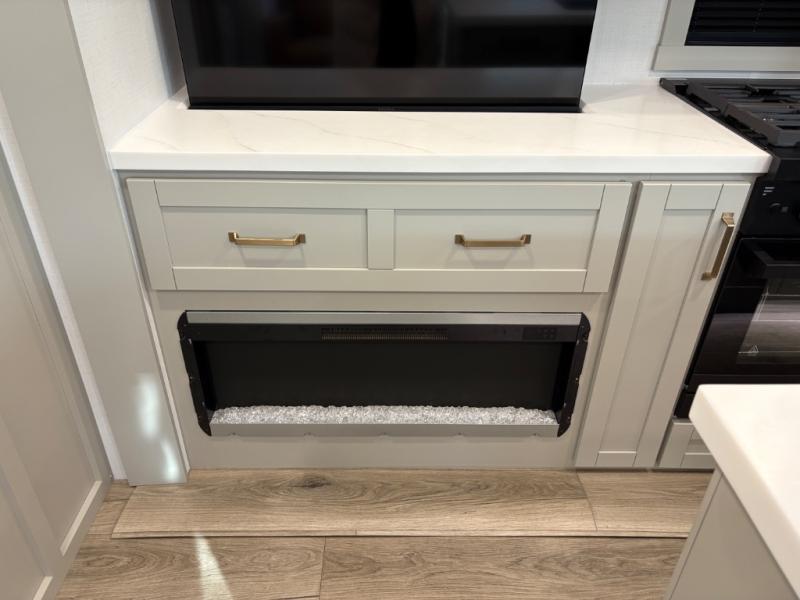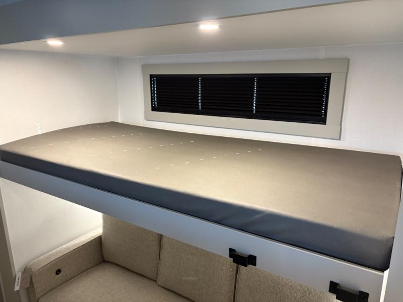 The whole gang will love camping in this spacious travel trailer for six to seven! Your guests or little ones will have the rear bunkhouse all to themselves, which includes a tri-fold sofa with a reclining back, a flip-up bunk, plus a second bunk bed across the room for even more sleeping space. There is even a bunkroom 42" Smart TV with a wardrobe for entertainment and storage! The front private bedroom includes a walk-around queen bed with four under-bed drawers for clothes, extra blankets and more. Head to the combined kitchen and living room to prep dinner on the kitchen island, relax on the theater seating, and dine at the sleeper dinette. There is also a pantry with adjustable shelves here, along with a hutch, 16 cu. ft. refrigerator that opens with the slide out, plus a televator and fireplace to make your space feel more like home! Outside, you'll find two power awnings, LED ground lighting, drop-frame pass-thru storage, and an outdoor kitchen with a refrigerator, sink, and storage!