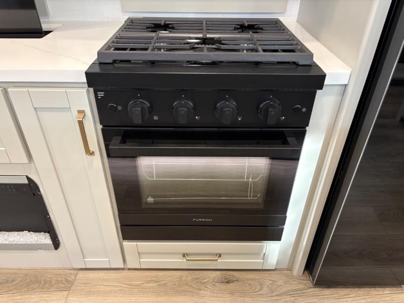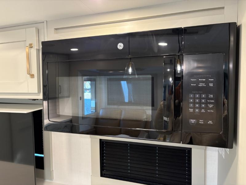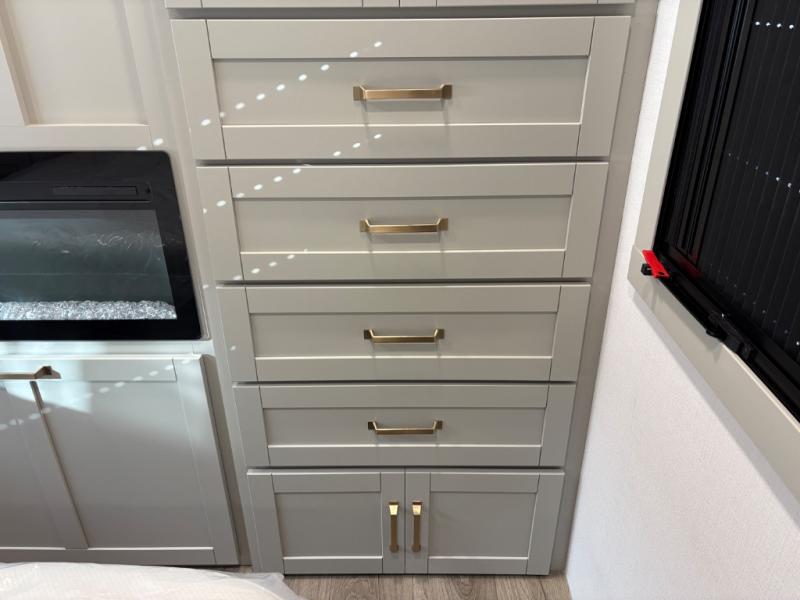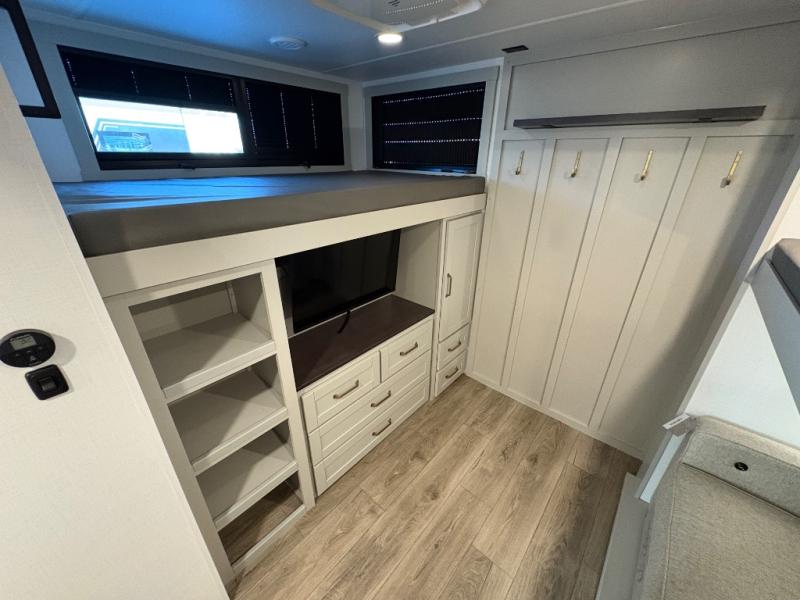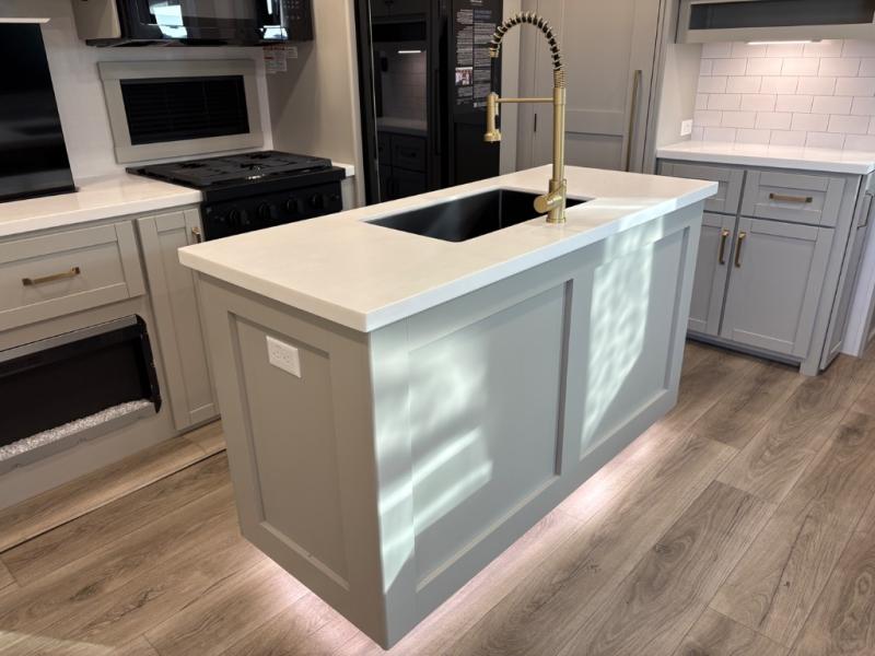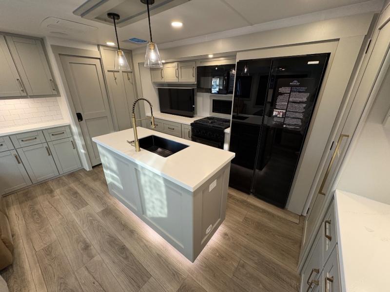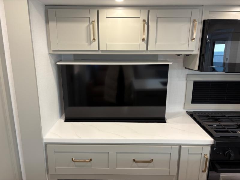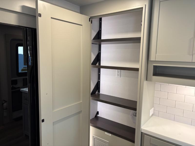 The whole gang will love camping in this spacious travel trailer for six to seven! Your guests or little ones will have the rear bunkhouse all to themselves, which includes a tri-fold sofa with a reclining back, a flip-up bunk, plus a second bunk bed across the room for even more sleeping space. There is even a bunkroom 42" Smart TV with a wardrobe for entertainment and storage! The front private bedroom includes a walk-around queen bed with four under-bed drawers for clothes, extra blankets and more. Head to the combined kitchen and living room to prep dinner on the kitchen island, relax on the theater seating, and dine at the sleeper dinette. There is also a pantry with adjustable shelves here, along with a hutch, 16 cu. ft. refrigerator that opens with the slide out, plus a televator and fireplace to make your space feel more like home! Outside, you'll find two power awnings, LED ground lighting, drop-frame pass-thru storage, and an outdoor kitchen with a refrigerator, sink, and storage!