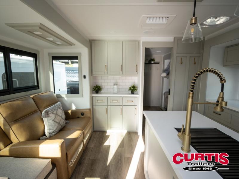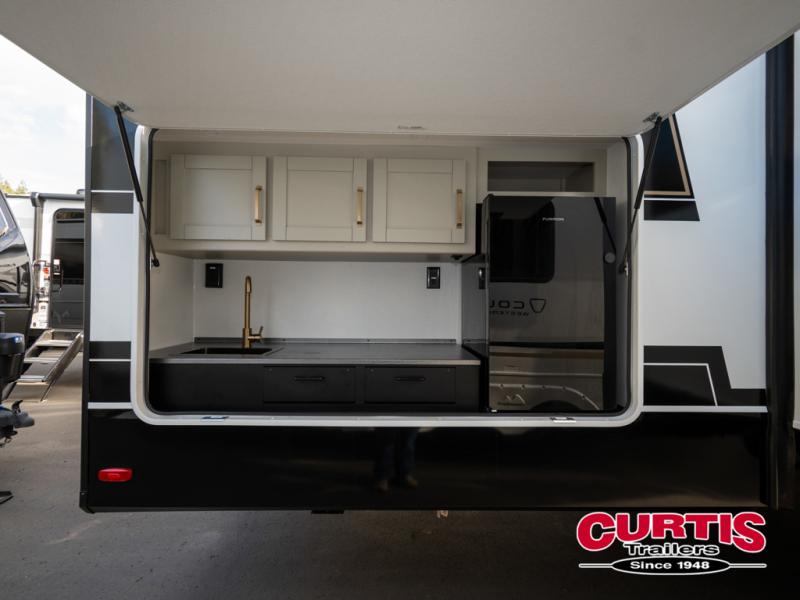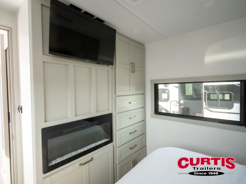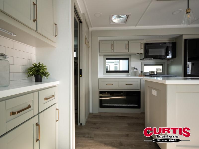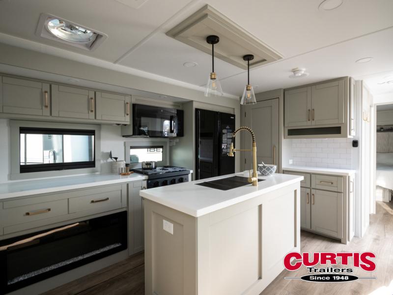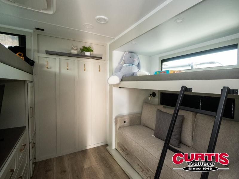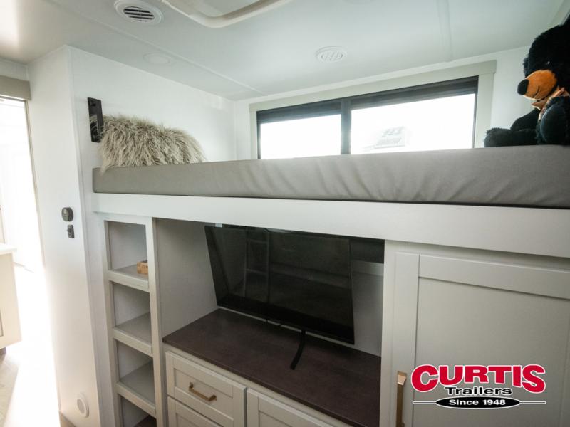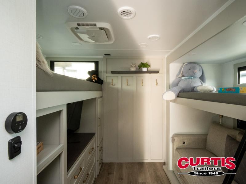 The whole gang will love camping in this spacious travel trailer for six to seven! Your guests or little ones will have the rear bunkhouse all to themselves, which includes a tri-fold sofa with a reclining back, a flip-up bunk, plus a second bunk bed across the room for even more sleeping space. There is even a bunkroom 42" Smart TV with a wardrobe for entertainment and storage! The front private bedroom includes a walk-around queen bed with four under-bed drawers for clothes, extra blankets and more. Head to the combined kitchen and living room to prep dinner on the kitchen island, relax on the theater seating, and dine at the sleeper dinette. There is also a pantry with adjustable shelves here, along with a hutch, 16 cu. ft. refrigerator that opens with the slide out, plus a televator and fireplace to make your space feel more like home! Outside, you'll find two power awnings, LED ground lighting, drop-frame pass-thru storage, and an outdoor kitchen with a refrigerator, sink, and storage!