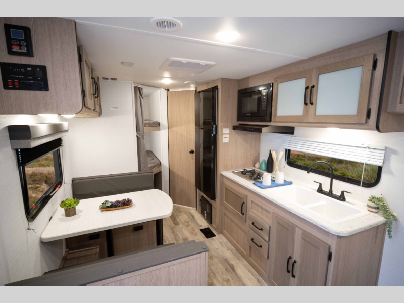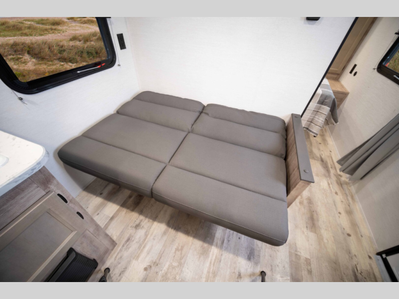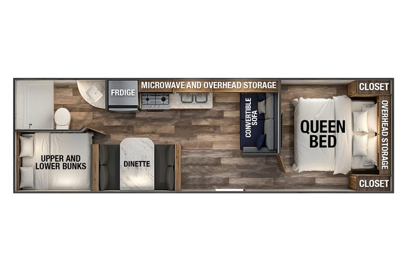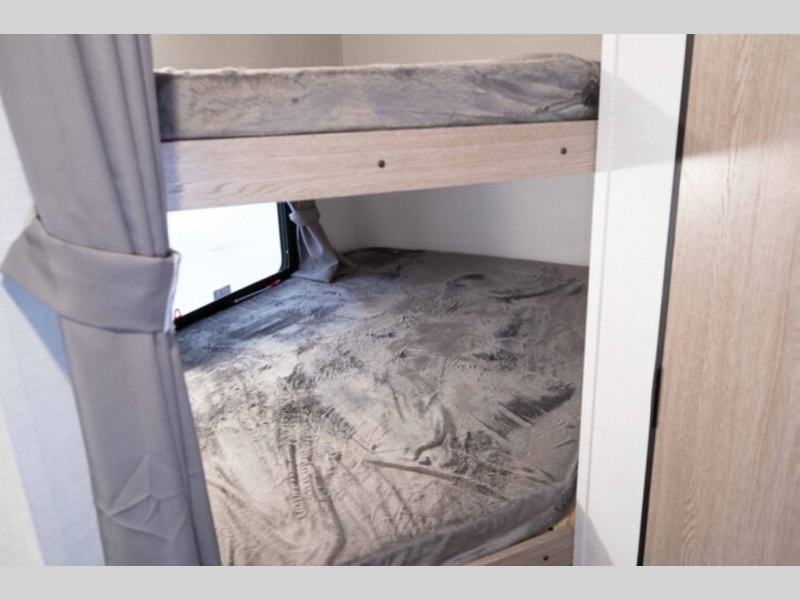 This model fits more sleeping space into a compact, no-slide layout with a walk-around queen, convertible dinette, and full-size double bunks.