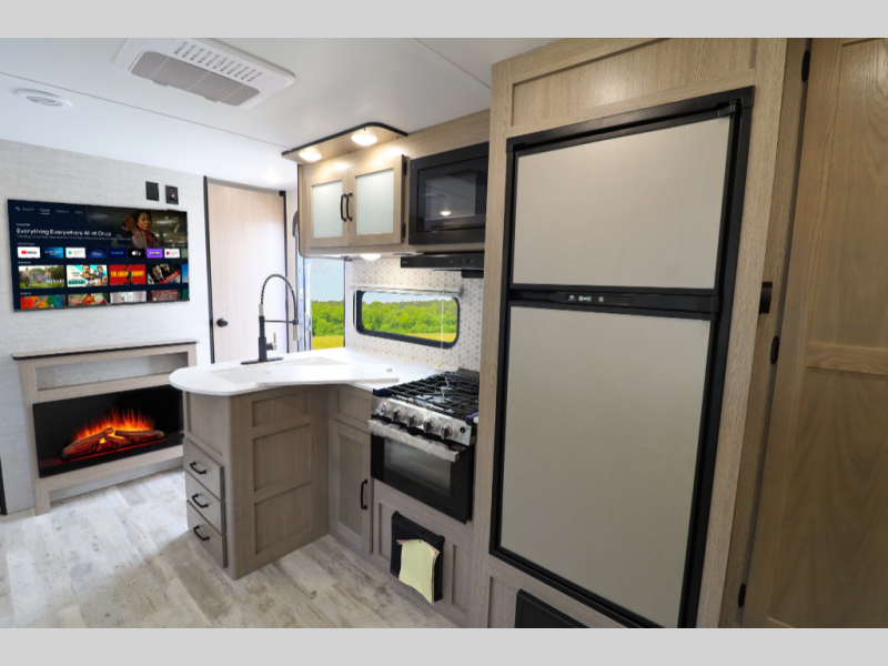 10.7 cu ft 12V refrigerator, 3-burner cooktop with oven, microwave, tankless water heater, 15K BTU A/C, and 20K BTU furnace.