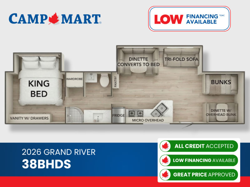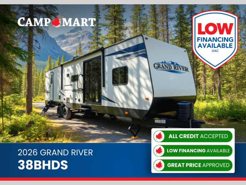 Stretch out and settle in. The 2026 Grand River Classic 38BHDS is a family-size bunkhouse with two slide-outs, dual entry including a sliding patio door, and a private rear king bedroom with its own slide. A bright, social kitchen anchors the living area, while a front bunkhouse adds flexible kid space with dedicated seating. Camp-ready systems—10.7 cu ft 12V refrigerator, 3-burner cooktop, microwave, tankless hot water, 13.5K BTU ducted A/C, and a 35K BTU furnace—keep weekends smooth, from shoulder season to summer.
