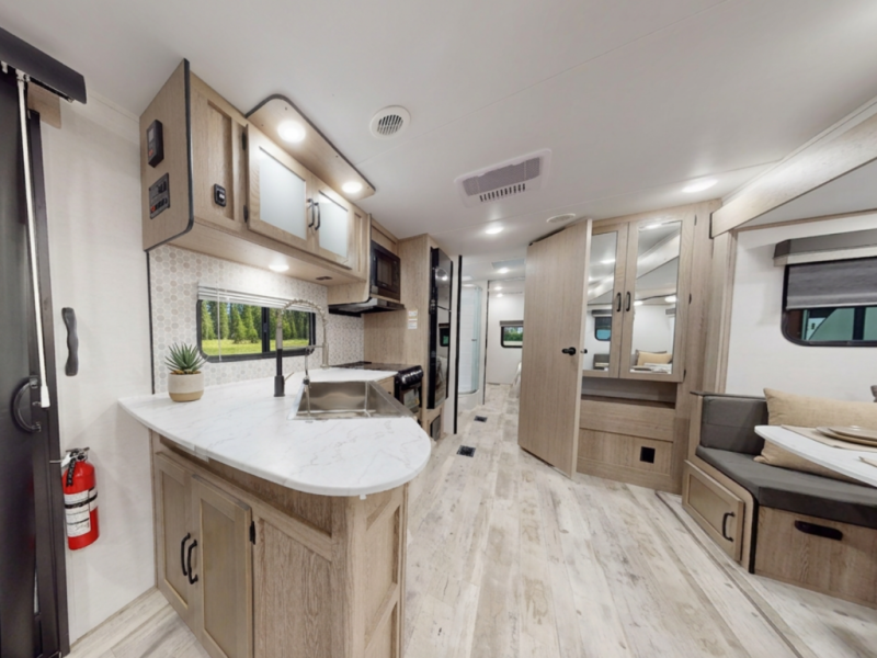A 10.7 cu ft 12V refrigerator, microwave, 3-burner cooktop, tankless water heater, 13.5K BTU ducted A/C, and a 35K BTU furnace.