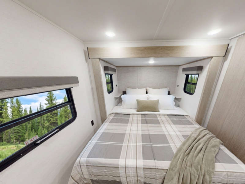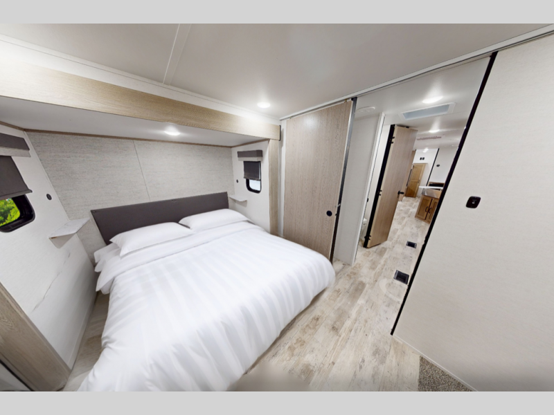 Private King Retreat — A rear king bed slide creates nightstand space, wardrobe storage, and a true door-closing retreat.