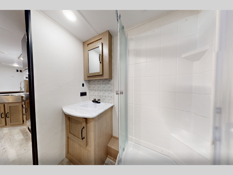 • 12V Cold Storage + Tankless Hot Water — Efficient 10.7 cu ft 12V fridge and on-demand hot water simplify camp life.