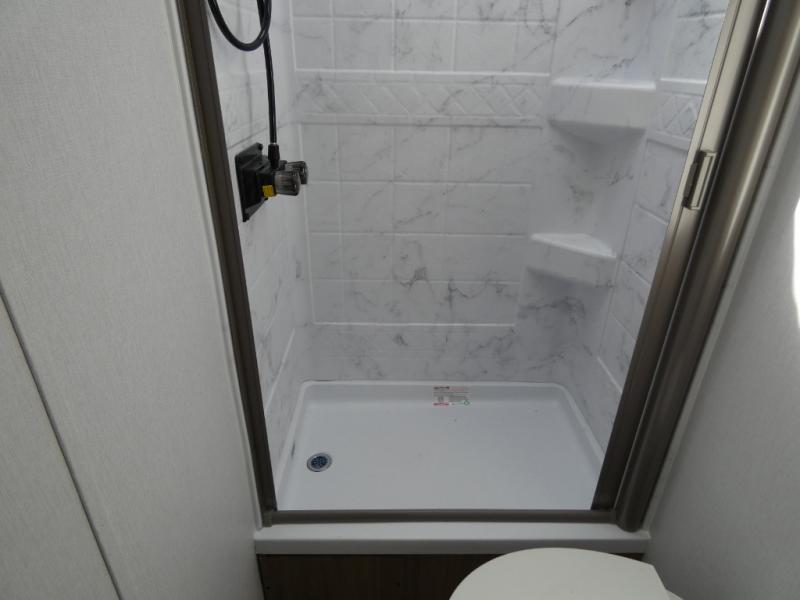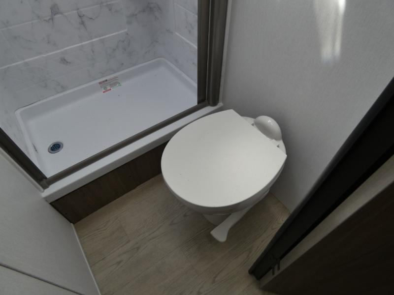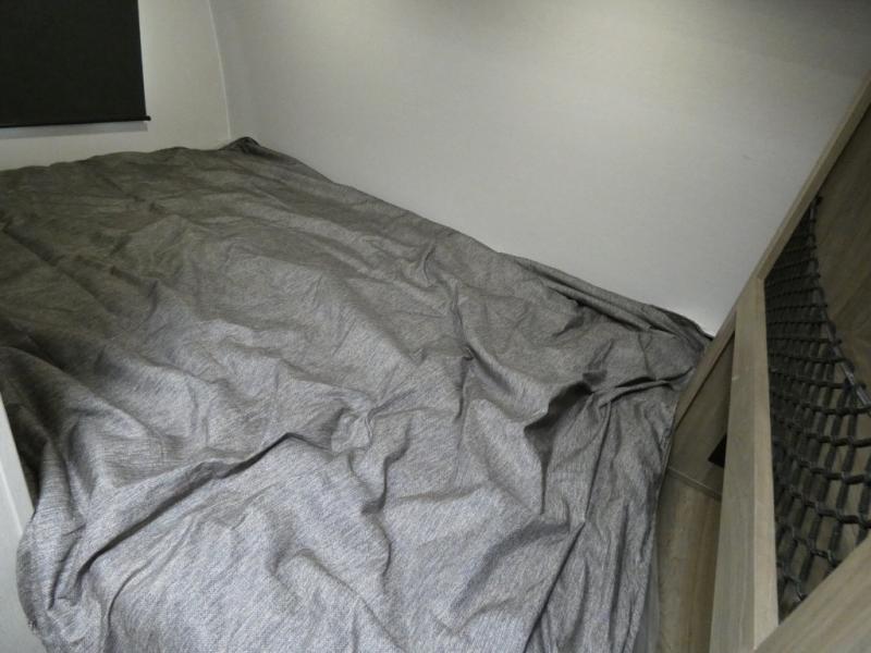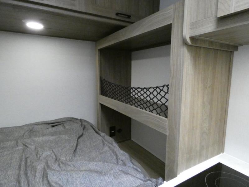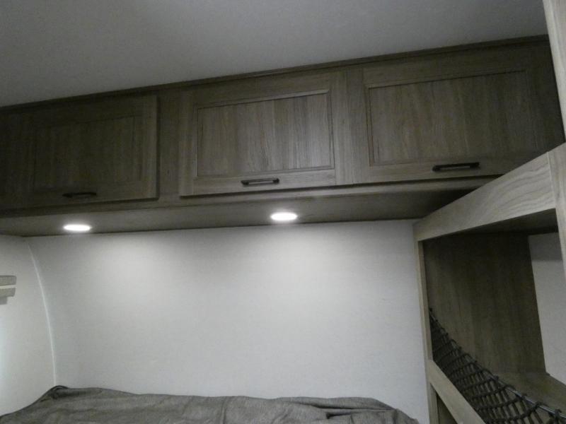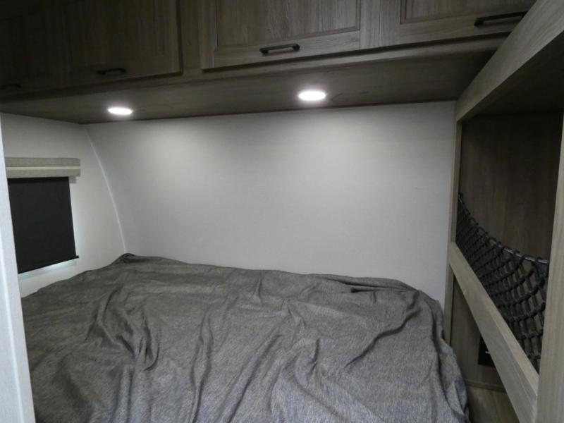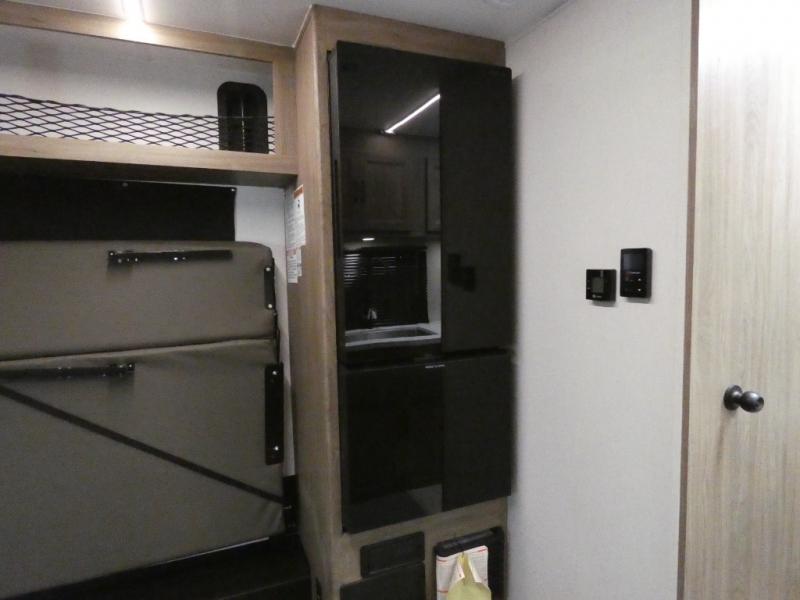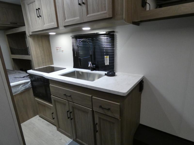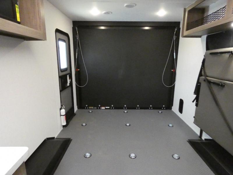 This toy hauler is perfect for three campers looking for adventure. There is 11' 7" total garage space to store your toys plus a ramp door for easy unloading. The rollover sofa with a free-standing table provides a place to dine together and let a guest sleep over. There is also an overhead shelf with a cargo net above the sofa for a smart storage space. A galley kitchen includes a two burner cooktop with a microwave below to cook meals, along with a 10 cu. ft. 12V refrigerator for food storage. You can sleep soundly each night on the 54" x 80" RV queen bed, and there is storage at the foot of the bed plus an overhead shelf for your things.