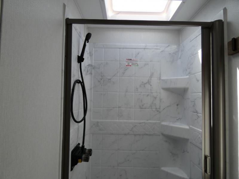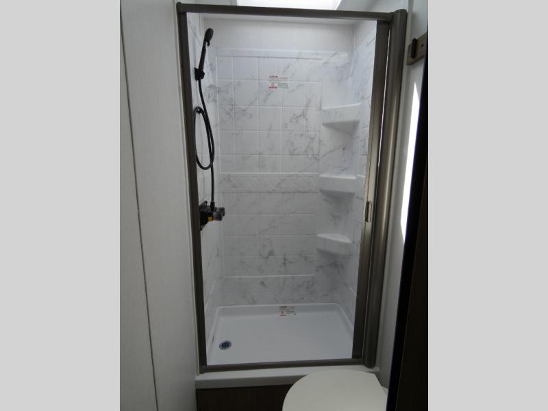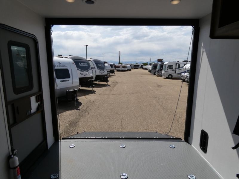 With any Adrenaline toy hauler travel trailer by Coachmen, the required Exterior Value package includes a one-piece Tufflex PVC roof membrane, a fiberglass front cap with rock guard to help against road debris, heavy duty Dexter axles with Nev-R-Adjust brakes and E-Z Lube, and aluminum wheels. Some exterior standards include a heated and enclosed underbelly, a patio ready ramp door with cables for an outdoor above ground space to enjoy, a power tongue jack for easy setup, and an outside spray port to clean off your toys. The interior standards include HD rubberized oil/gas/moisture resistant flooring in the garage area, hidden hinge cabinets and doors, a rear detachable screen, and USB charging ports in multiple locations for your electronics to mention a few.