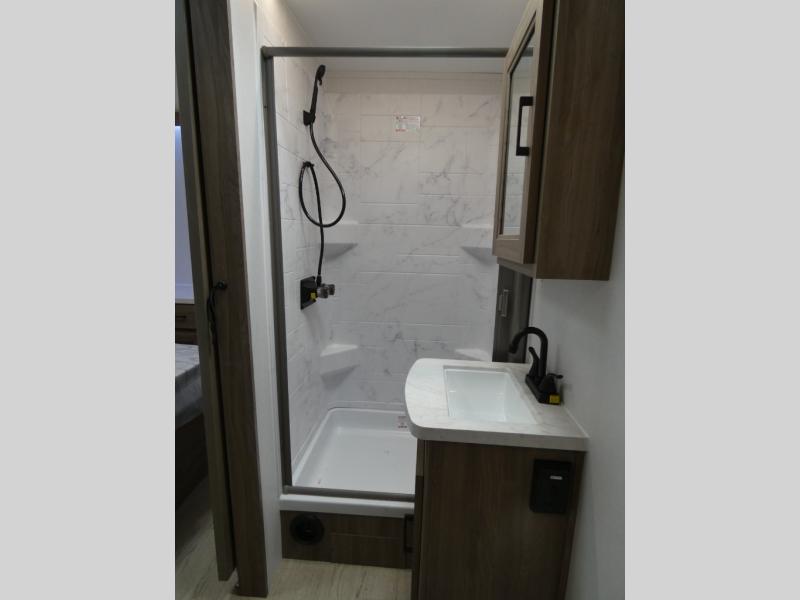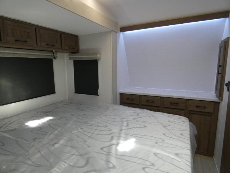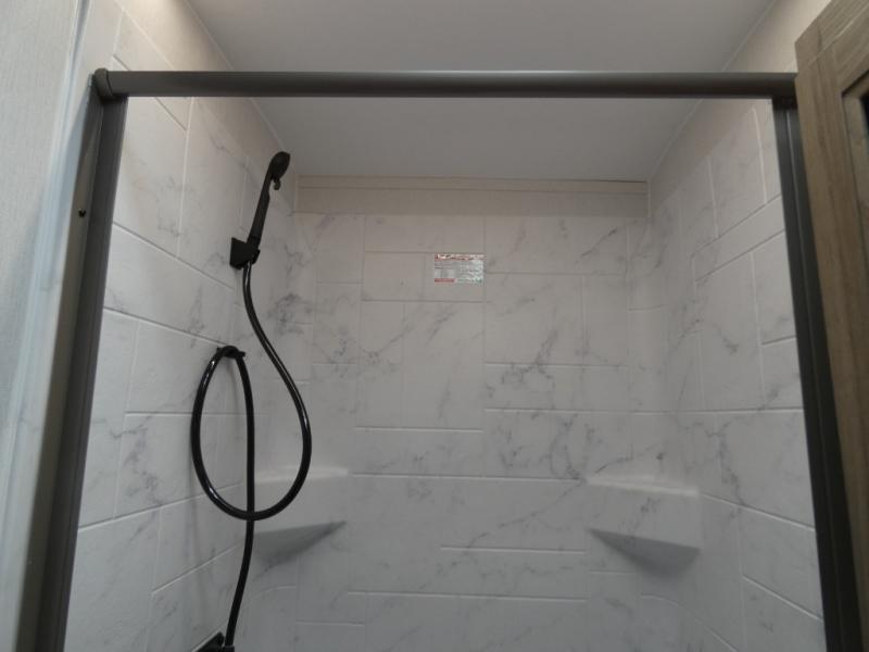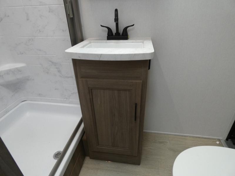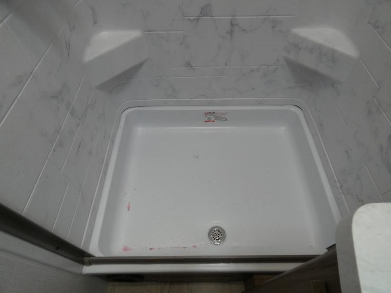 With any Adrenaline toy hauler travel trailer by Coachmen, the required Exterior Value package includes a one-piece Dicor Tufflex PVC roof membrane, a fiberglass front cap with rock guard to help against road debris, heavy duty Dexter axles, tinted safety glass windows, and aluminum wheels. Some exterior standards include a heated and enclosed underbelly, a patio ready ramp door with cables for an outdoor above ground space to enjoy, a power tongue jack for easy setup, and an outside spray port to clean off your toys. The interior standards include HD rubberized oil/gas/moisture resistant flooring in the garage area, hidden hinge cabinets and doors, indoor/outdoor Bluetooth speakers, and USB charging ports in multiple locations for your electronics to mention a few.