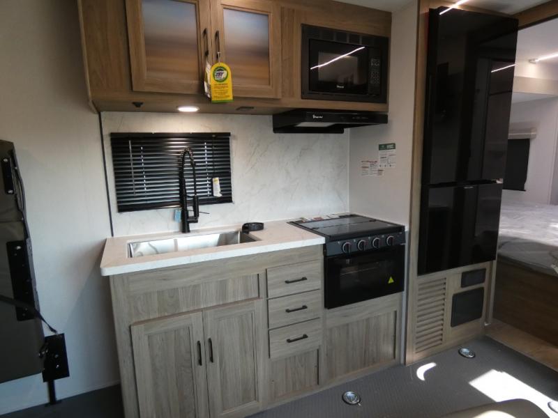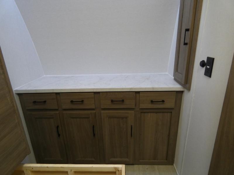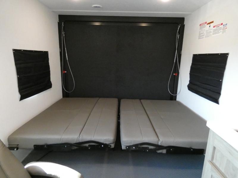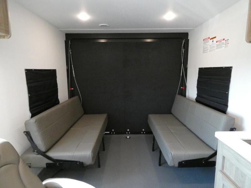 Load up your toys into 13' 8" of cargo space, your clothes in the dresser, your gear in the overhead cabinets, and your food in the refrigerator for a weekend or longer trail ride! The chef of the group can prepare breakfast on the three burner cooktop that includes an oven or use the microwave, and there is plenty of storage space in the overhead cabinets for kitchen necessities and snacks. The dual entry bath and a master bedroom are both along the front of the trailer giving you privacy and convenience. When it's finally time to call it a night, you will enjoy the queen bed slide and your guests can convert the two roll-over sofas for a great night's rest.