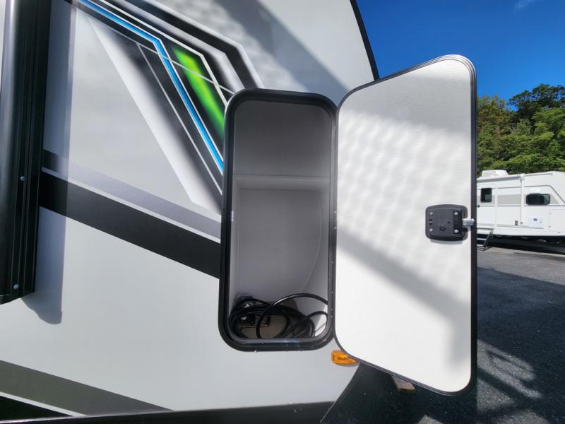 With any Adrenaline toy hauler travel trailer by Coachmen, the required Exterior Value package includes a one-piece Tufflex PVC roof membrane, a fiberglass front cap with rock guard to help against road debris, heavy duty Dexter axles with Nev-R-Adjust brakes and E-Z Lube, and aluminum wheels. Some exterior standards include a heated and enclosed underbelly, a patio ready ramp door with cables for an outdoor above ground space to enjoy, a power tongue jack for easy setup, and an outside spray port to clean off your toys. The interior standards include HD rubberized oil/gas/moisture resistant flooring in the garage area, hidden hinge cabinets and doors, a rear detachable screen, and USB charging ports in multiple locations for your electronics to mention a few.