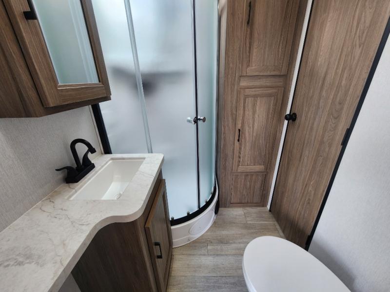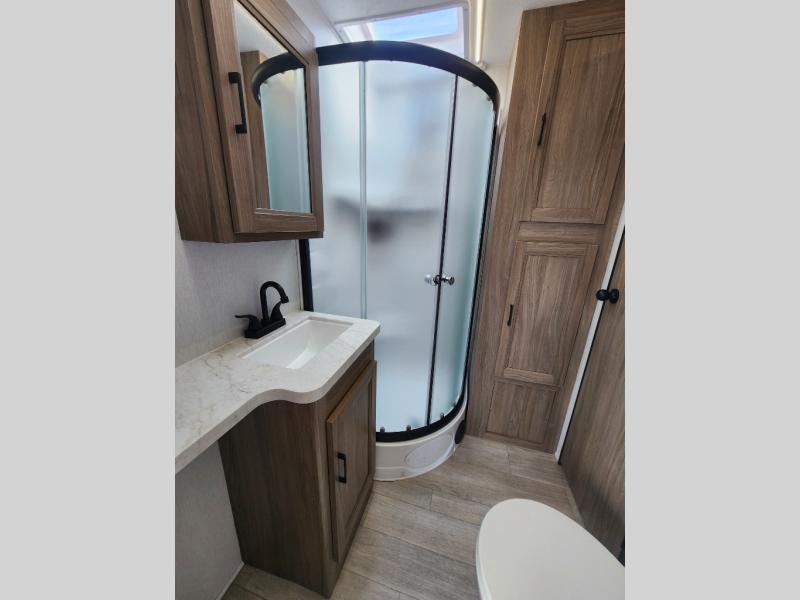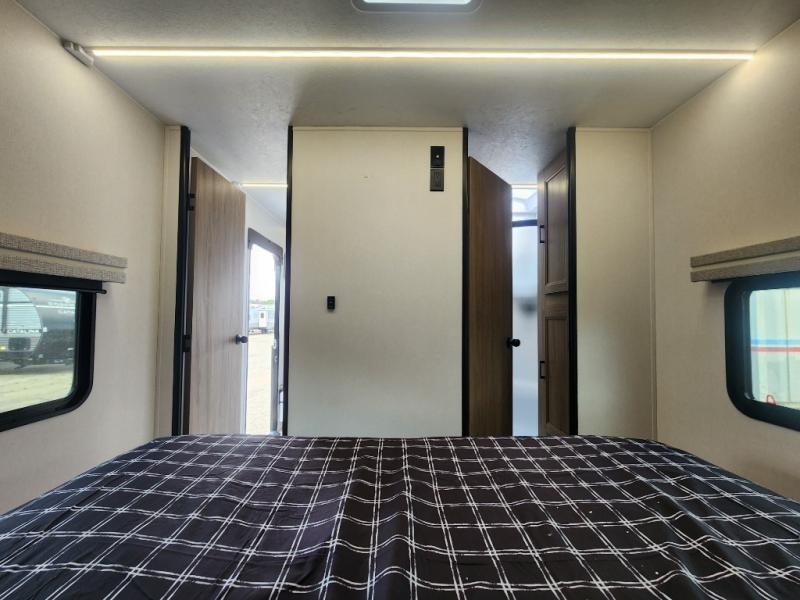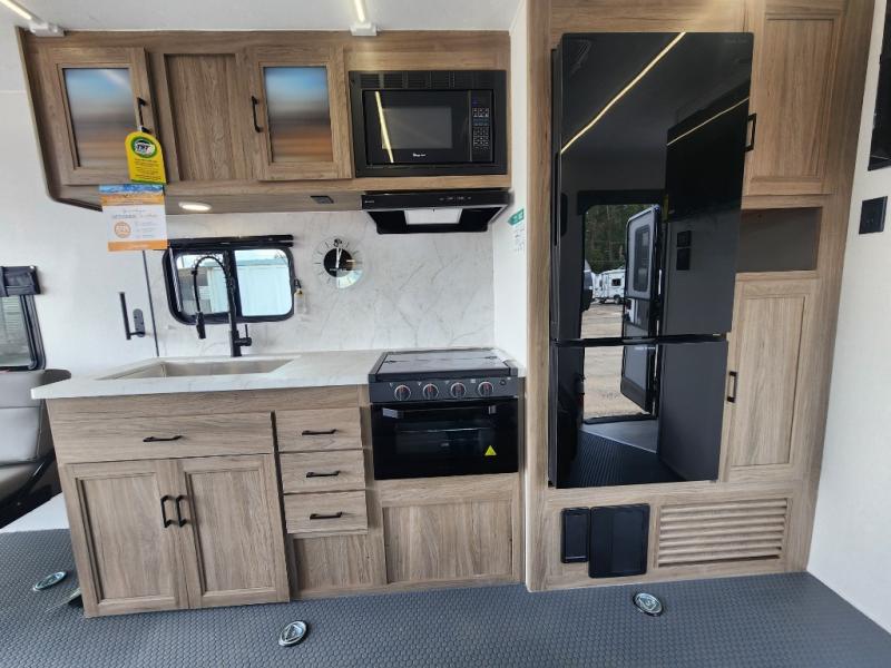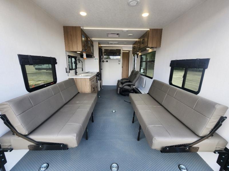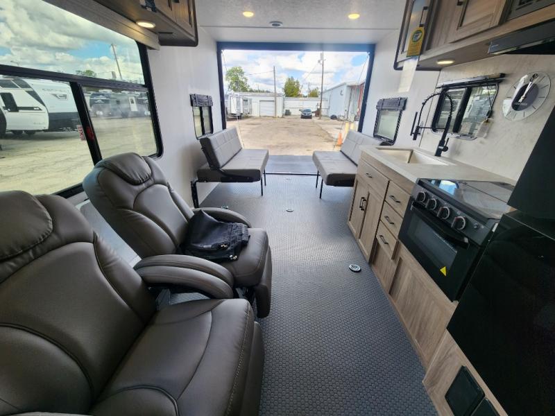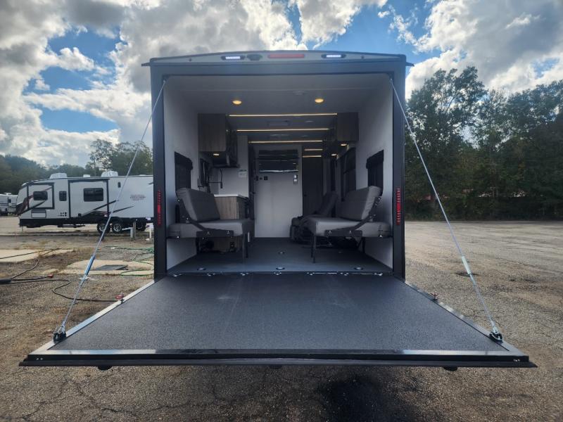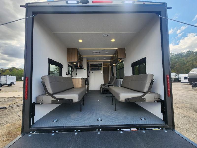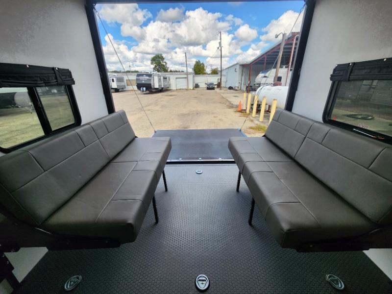 Whether you hit the trails or relax indoors, you will love having this toy hauler at the campsite! After you've unloaded your dirt bikes from the 15' 9" garage, enjoy lunch seated on one of the roll-over sofas with a dinette table between. You may even decide to check the weather on the Smart TV before heading out to find a trail. This trailer includes a dual entry bath with a shower skylight for extra headroom and natural lighting, and the front master bedroom will provide complete comfort with its king bed. You have a few options to add such as an electric bed over the sofas for more sleeping space, a 30 gallon fuel station to keep the toys running the whole trip, plus more if you like.