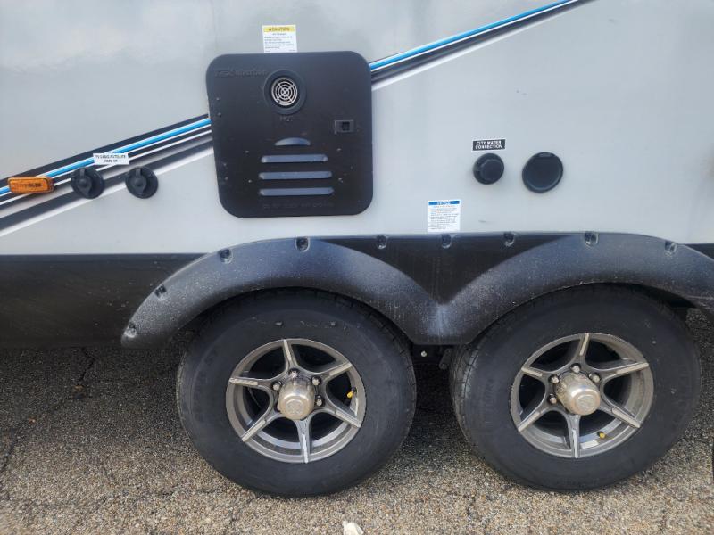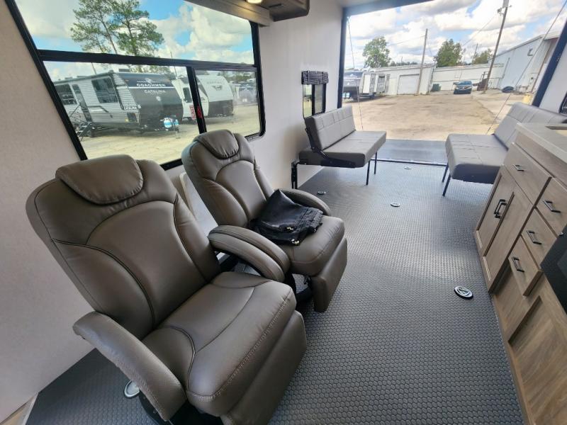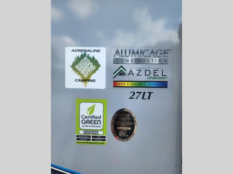 With any Adrenaline toy hauler travel trailer by Coachmen, the required Exterior Value package includes a one-piece Dicor Tufflex PVC roof membrane, a fiberglass front cap with rock guard to help against road debris, heavy duty Dexter axles, tinted safety glass windows, and aluminum wheels. Some exterior standards include a heated and enclosed underbelly, a patio ready ramp door with cables for an outdoor above ground space to enjoy, a power tongue jack for easy setup, and an outside spray port to clean off your toys. The interior standards include HD rubberized oil/gas/moisture resistant flooring in the garage area, hidden hinge cabinets and doors, indoor/outdoor Bluetooth speakers, and USB charging ports in multiple locations for your electronics to mention a few.